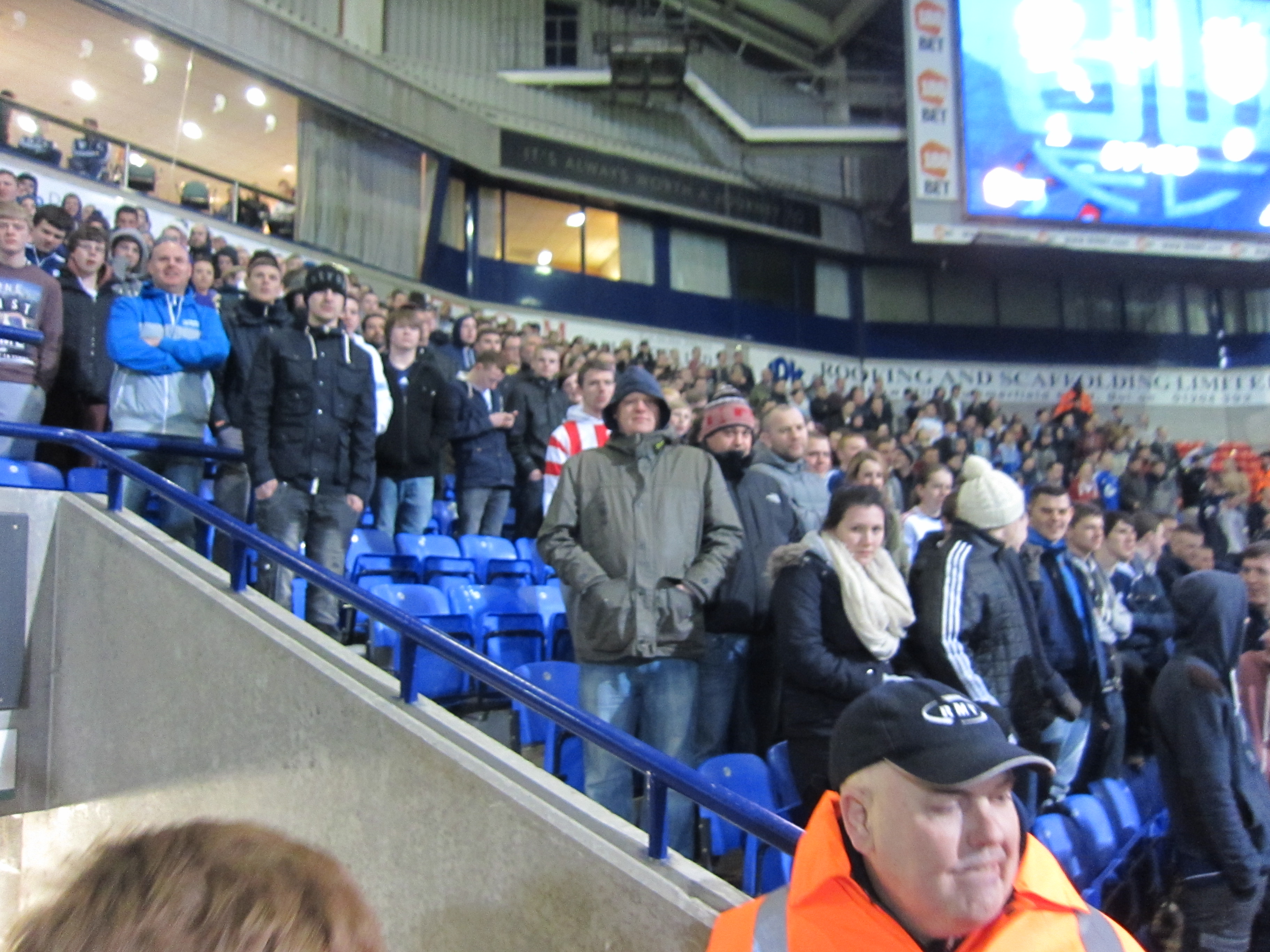 A few fans from both sides were far more preoccupied with gaining eyecontact with opposing fans, gesticulating, singing – but in an overall goodhumoured way. There was a lot of Lancashire-Yorkshire rivalry in the chanting. “Sheep, sheep, sheepshaggers” were chanted from the Bolton section, with the Huddersfield fans responding, singing: “he s…… all your kids, he s…… all your kids, Jimmy Saville, he s……. all your kids”. That response was greeted by smiles and grins and even applauds from the Bolton fans, before they returned the chant: “he s…… all your sheep, he s……. all your sheep, Jimmy Saville, he s…… your sheep”.
