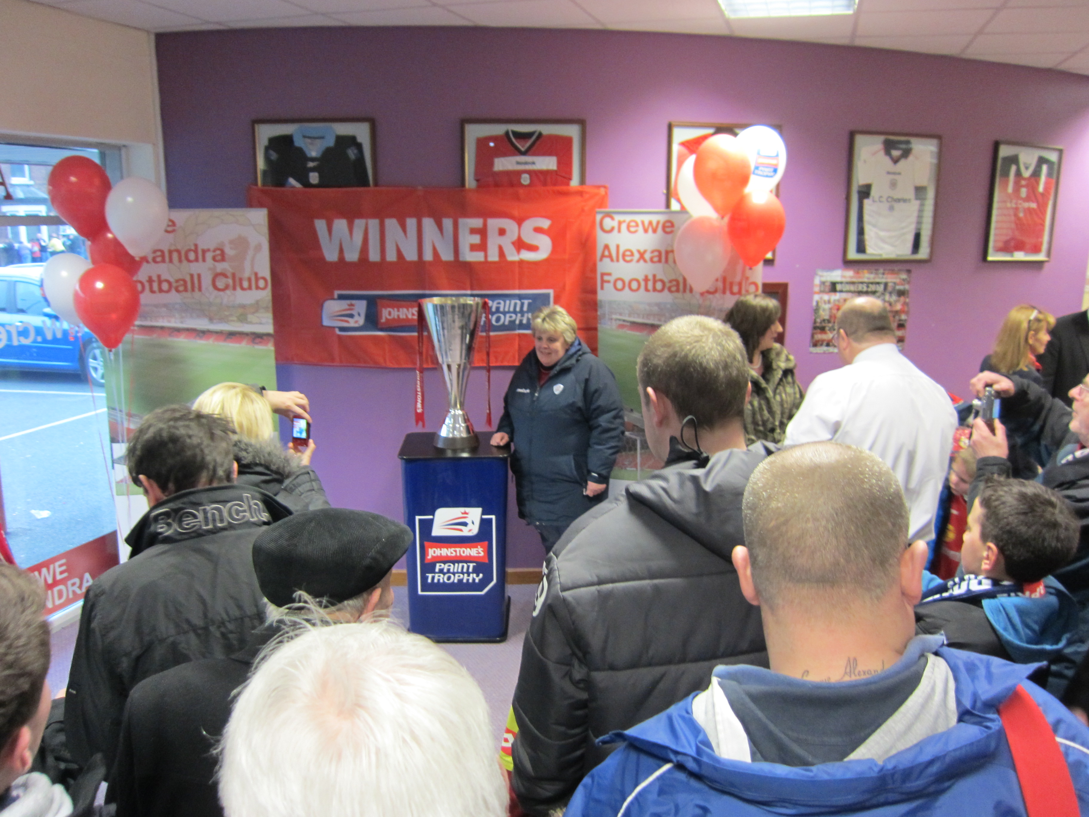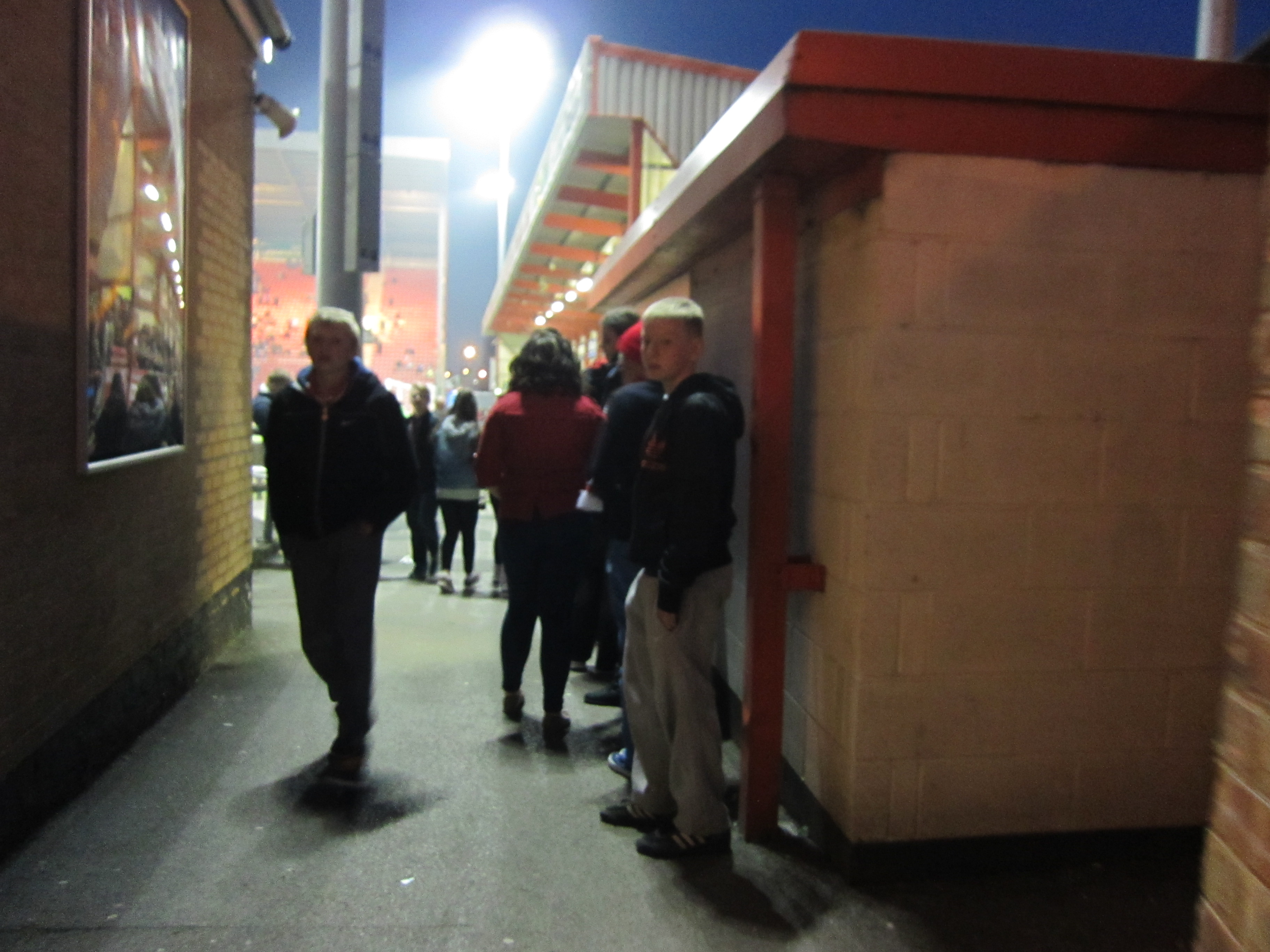 It feels a bit odd that you for a 4.500 spectator match at a 10.000 seater stadium have to buy at ticket at the ticket office to get in, instead of just paying at the turnstyle. I asked the lady for a ticket to the most vocal part of the ground, and she answered that that would be behind the goal (or she could have sent me to the visitors, Brentfords section). Having purchased my ticket, I went to the souvenir shop, where fans proudly (apparently without paying) had their photo taken with the Johnstone’s Paint trophy cup that they had won at Wembley during the weekend.