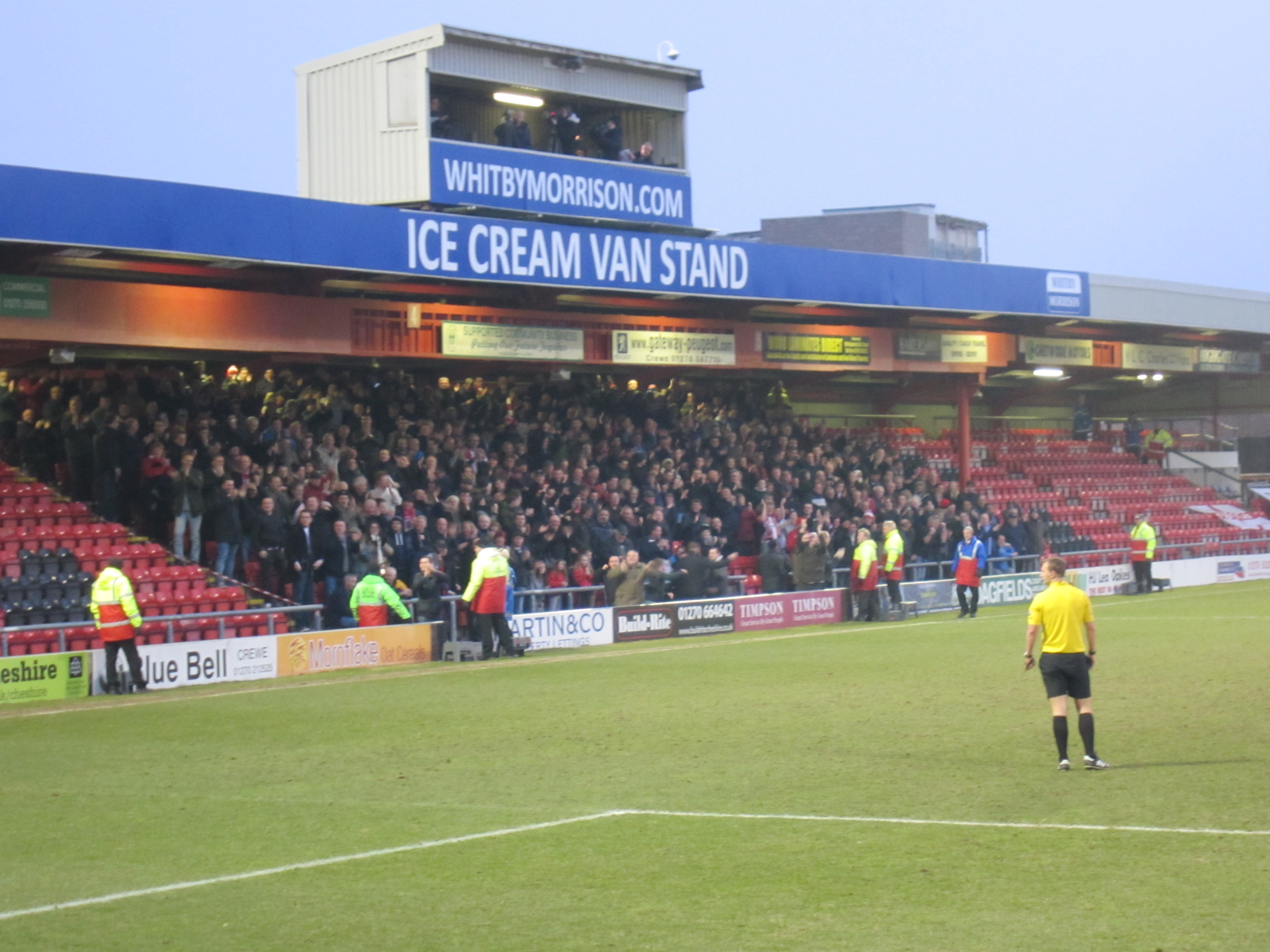 There were a few chants, but the stand turned into a social gathering for groups of teenage boys with the odd pairs of teenage girls in between them. Amd after all, Crewe only had an outside chance of making the play-offs, so why dwelve too much on that? Why not have a good time talking with your mates?
