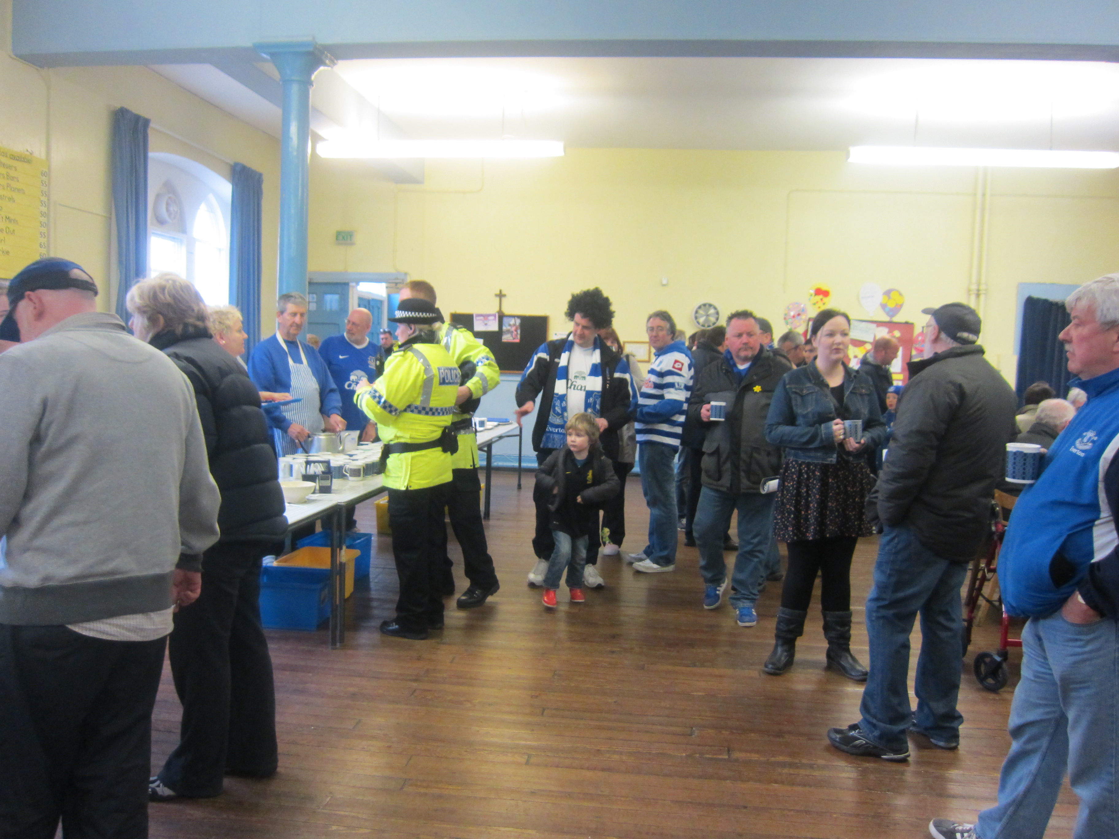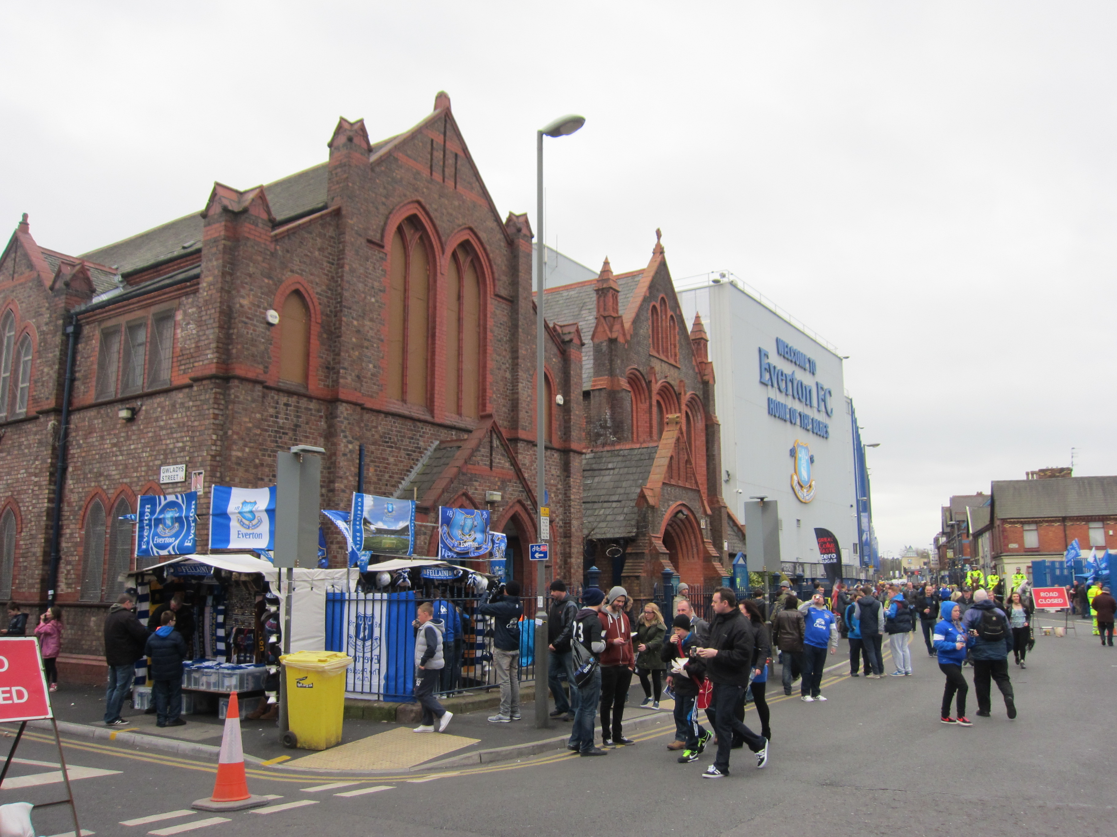 I also had the opportunity to go pitchside and have a look at the plaques for some of the 800 dead, who have had their ashes spread on the field. In many ways, Goodison has a sacred status. They are – according to a heritage plaque – the only ground to be situated in the back garden of a church, St. Luke’s church at the corner of the Gwladys Street stand. And it is certainly the first time I have seen programme and scarf-selling from a church; they also served pre-match snacks at the church, but have apparently recently stopped the selling of old programmes. Argentina may have the hand of God, Everton have his house.