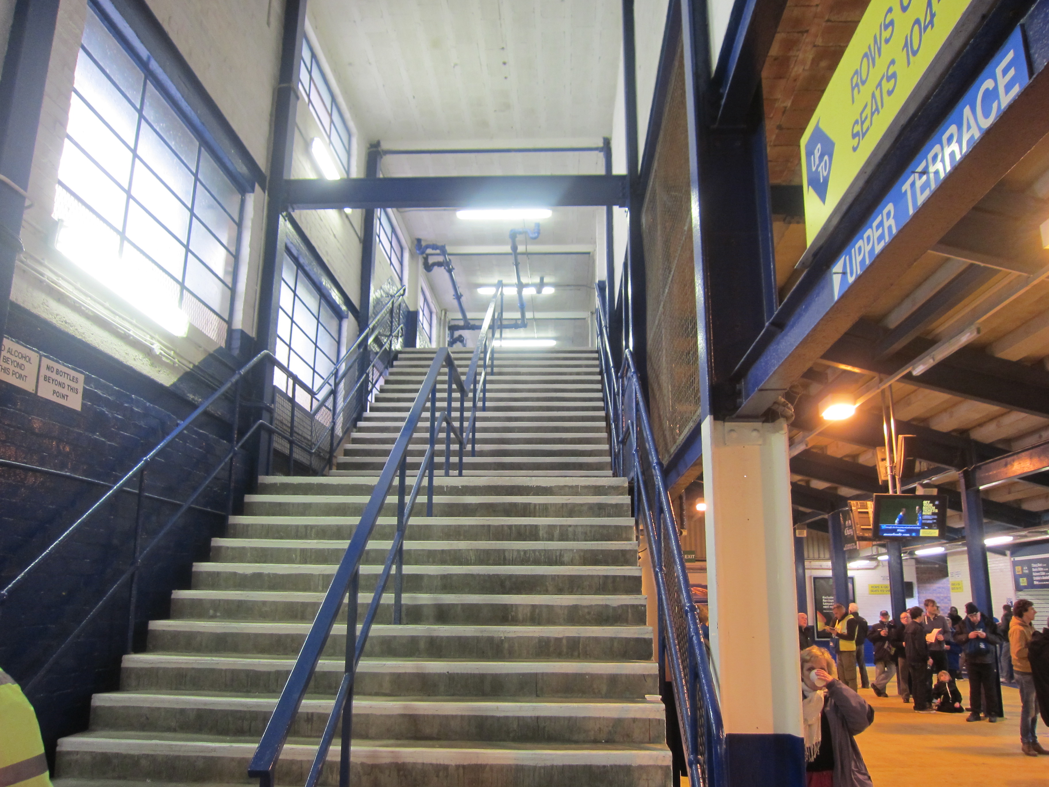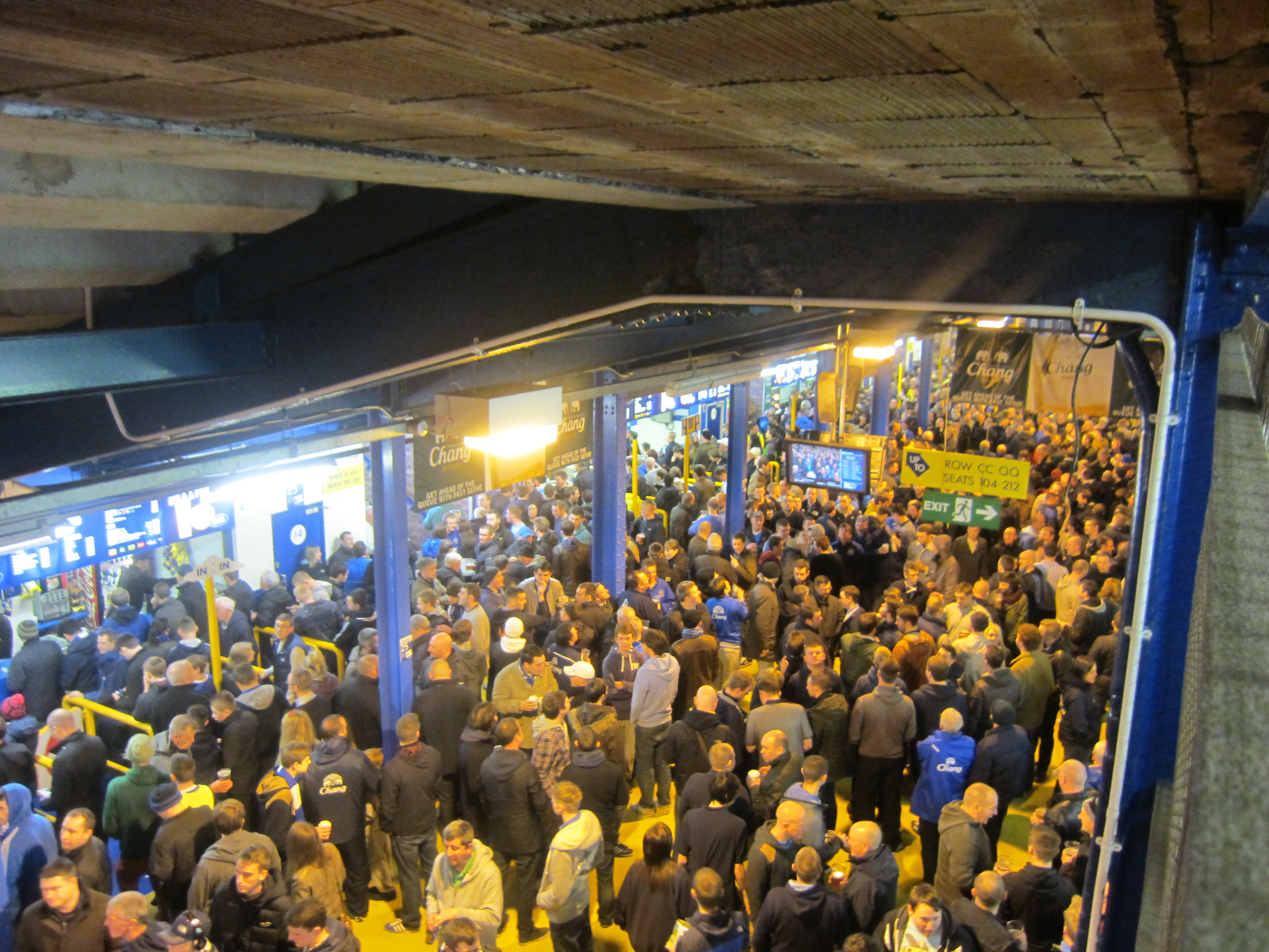 I chose to go the Gwladys Street stand to get the chance to have a closer look at Leitch’s architecture, despite reading recommendations that you from the top of the main stand from 1971 actually can see across Stanley Park to neighbours Liverpool’s Anfield Road. And as the rain started to poor down, I was glad that I had the chance to look at the single, huge room underneath the stand; not narrow and claustrophobic like you find the in many grounds.