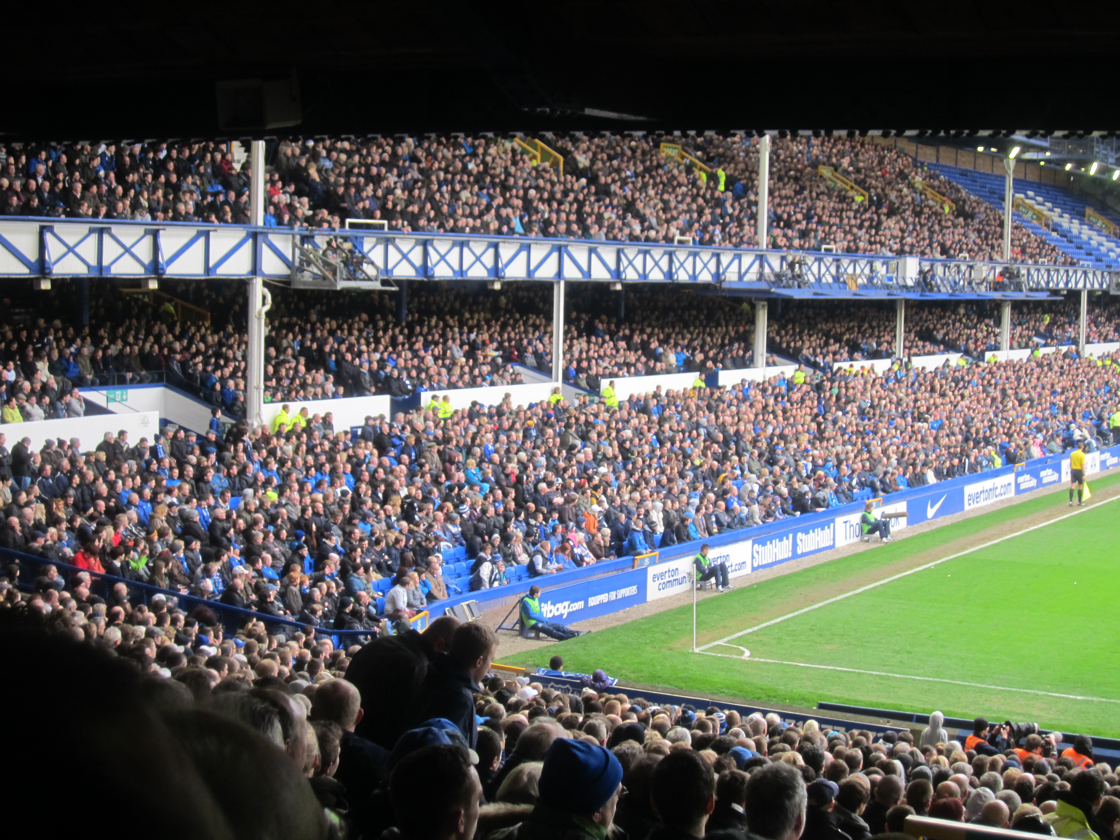 There were, however, very little singing or chanting from the Everton supporters in the first half. Just like at Liverpool. Of course, this wasn’t a derby like the match at Old Trafford Monday, but still I am amazed with commentators talking about Old Trafford being quiet. It is not what it used to be, right, but still I have not experienced it as quiet as Anfield and Goodison in the first half. Neill, my new Derby supporting friend from the train, had advised me to always go to the away section. Up until Everton taking the lead, the relatively small contingent of QPR supporters was definetely doing the singing. But in the second half, as the threat of relegation stared them in the face, it sounded as though they grew quiet.