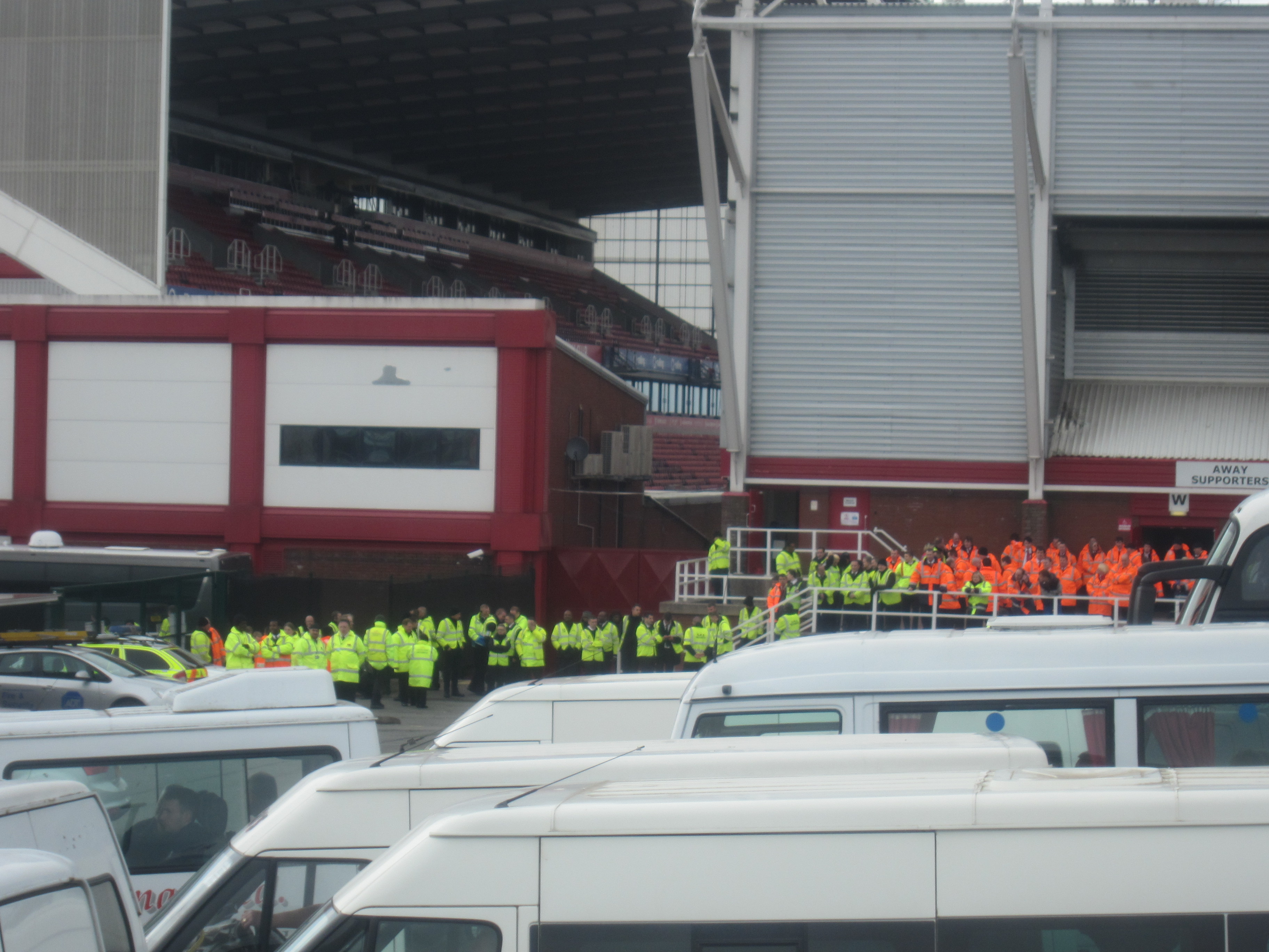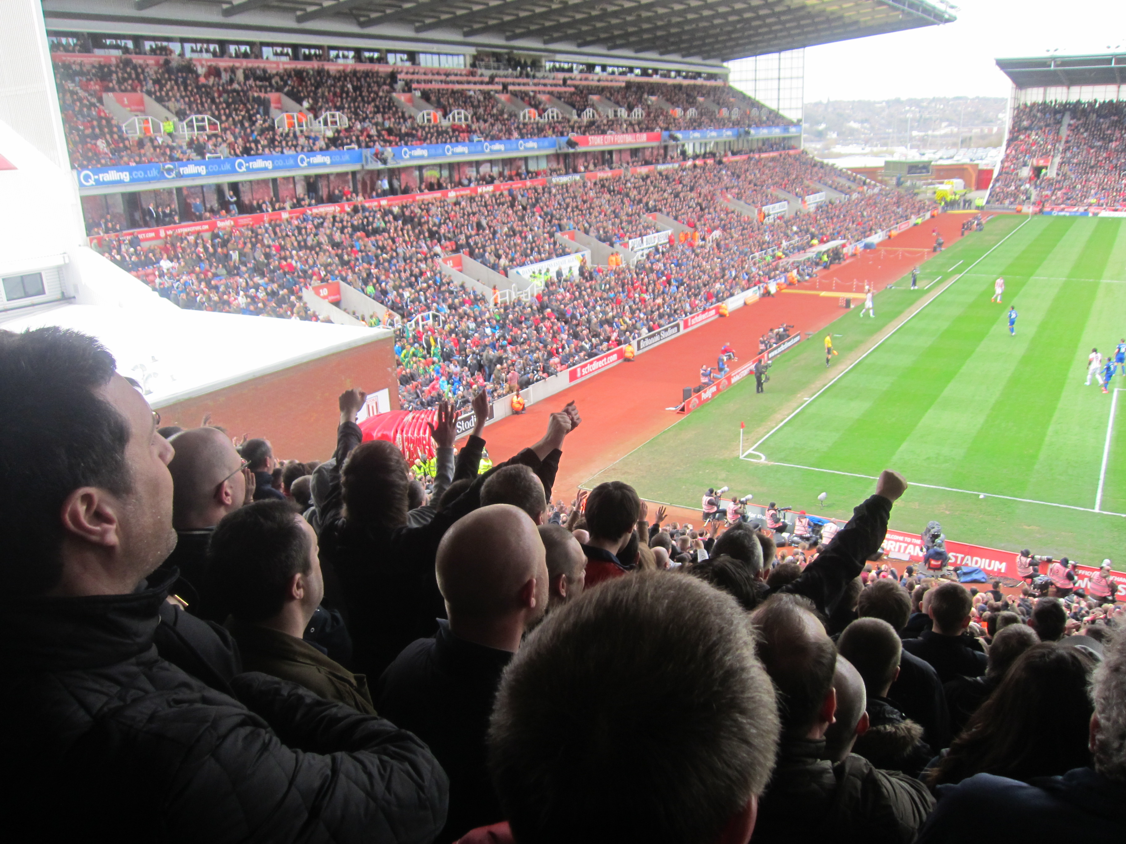 The last few miles to the ground, a couple of policemen on motorbikes escort our coach. The Britannia is just off the motorway, and the rest of the traffic is held back, as we are escorted into a fenced-in carpack for away fans, just off the entrances to the away end. It is only 10 minutes to kick-off as we arrive. The security guy who searches me spots my camera and my microphone. I tell him that I am doing research into football fans – and he takes me along to head of security. “This guy says he is doing some feature on football fans. He has a camera and microphone”. Fortunately, head of security says it is allright, and allows me in.