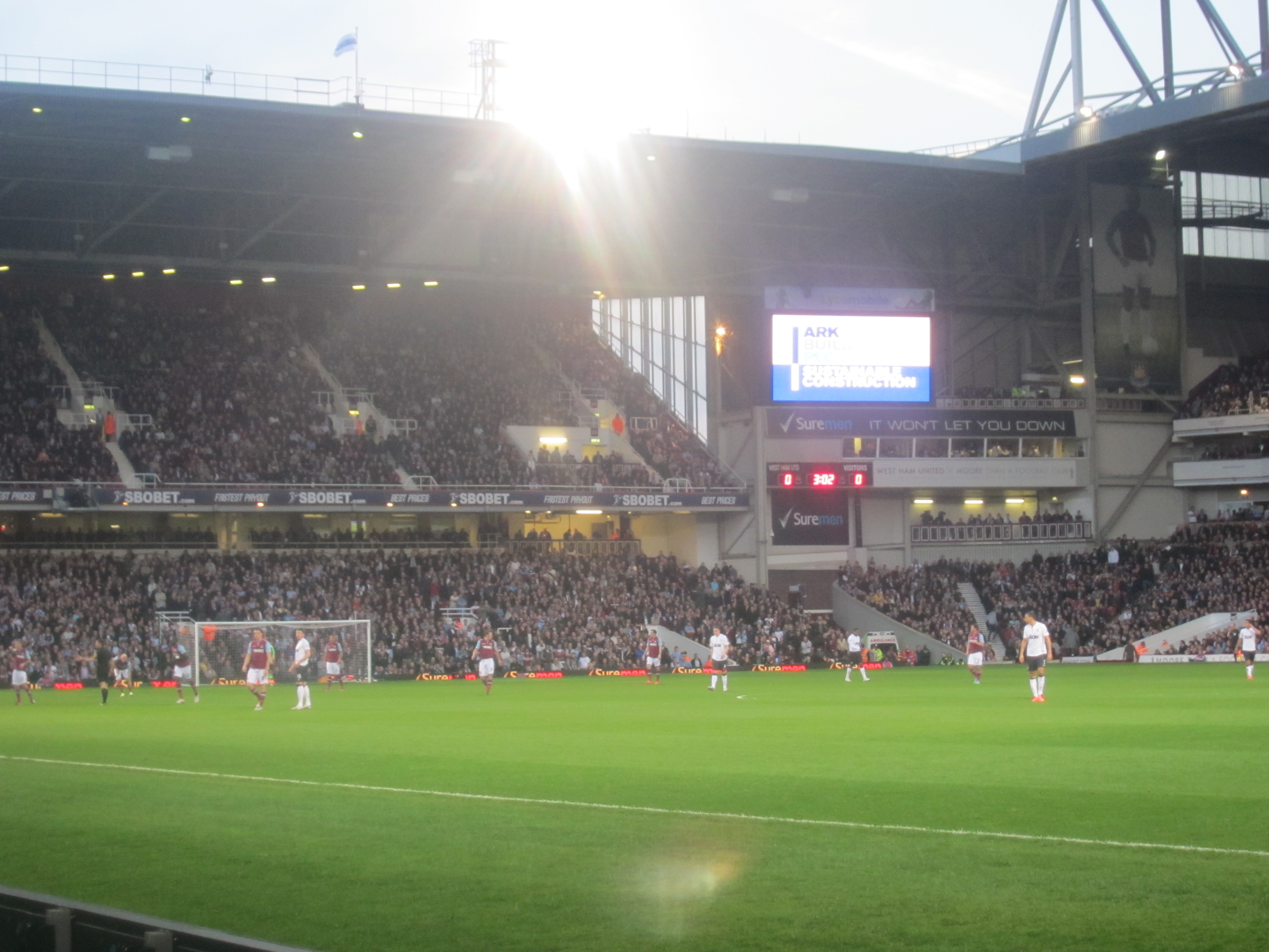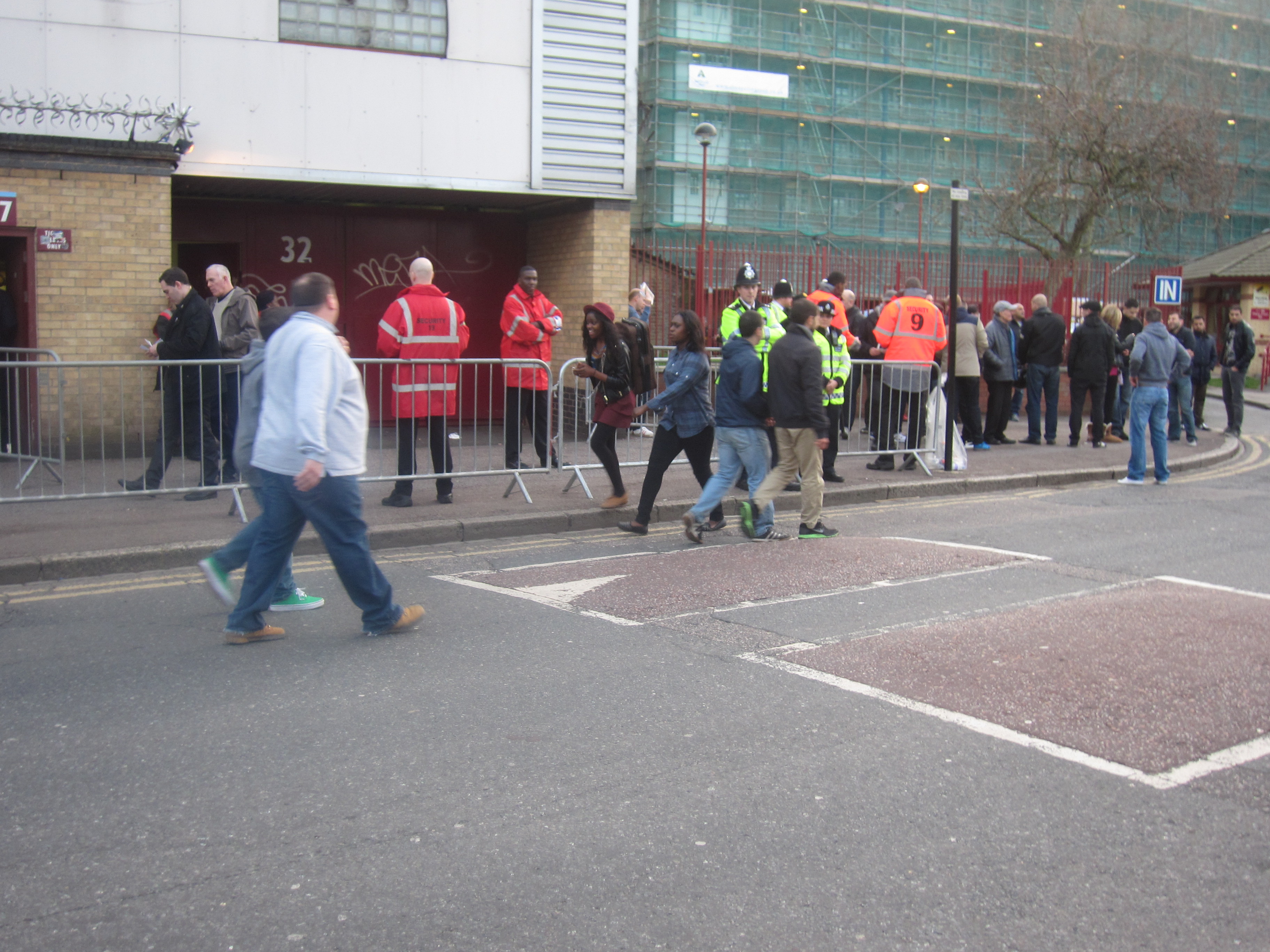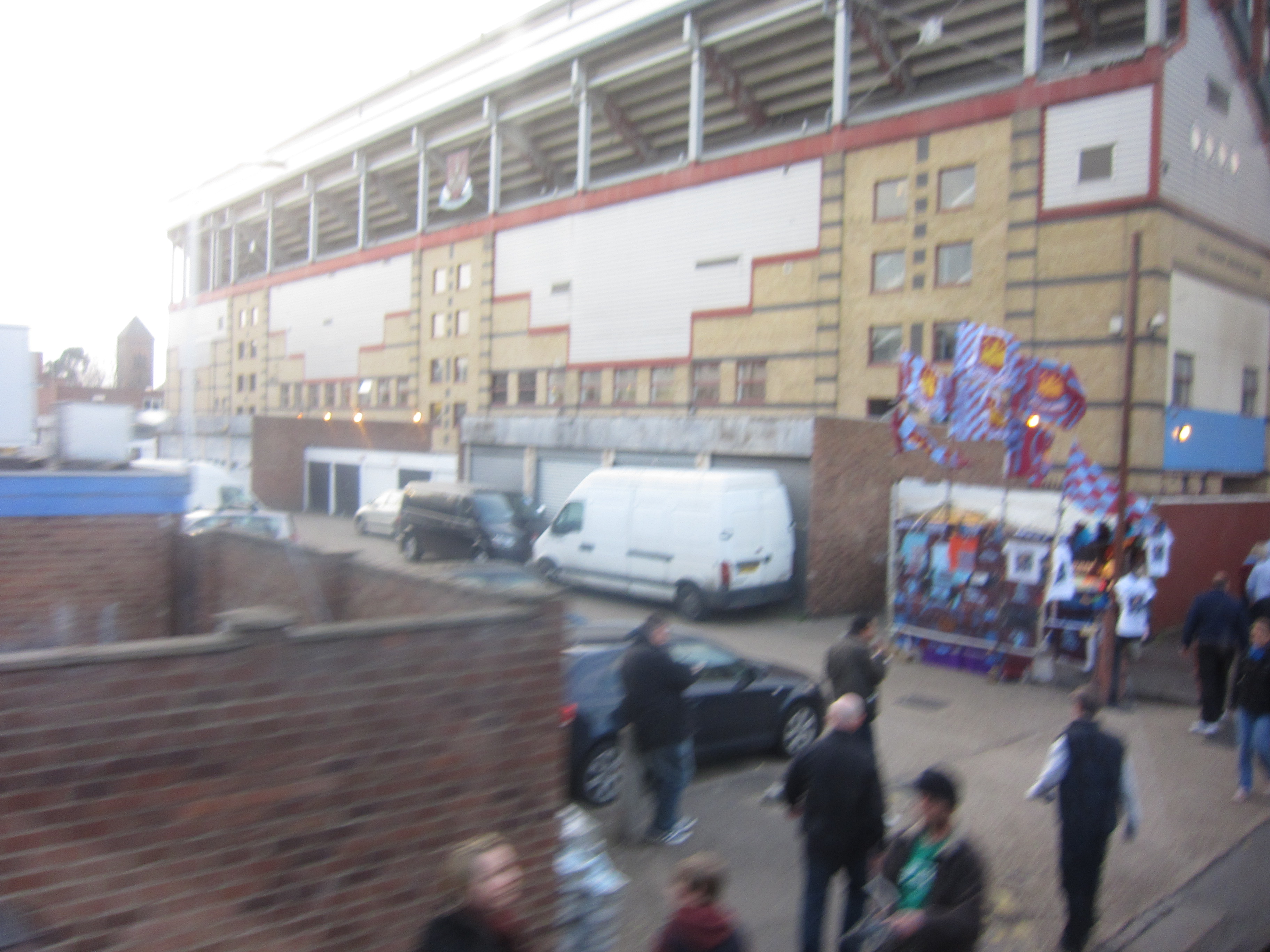 On the road with Manchester United support again, this time to West Ham United’s Boleyn Ground in West London. After 5 ½ hours on the road, we arrive at the ground just outside the entrance of the away section. As I had been to see the ground in May and seen the facade and memorial garden, I don’t really feel like venturing into the home fans’ territory, so after buying a programme, I go straight to the entrance.