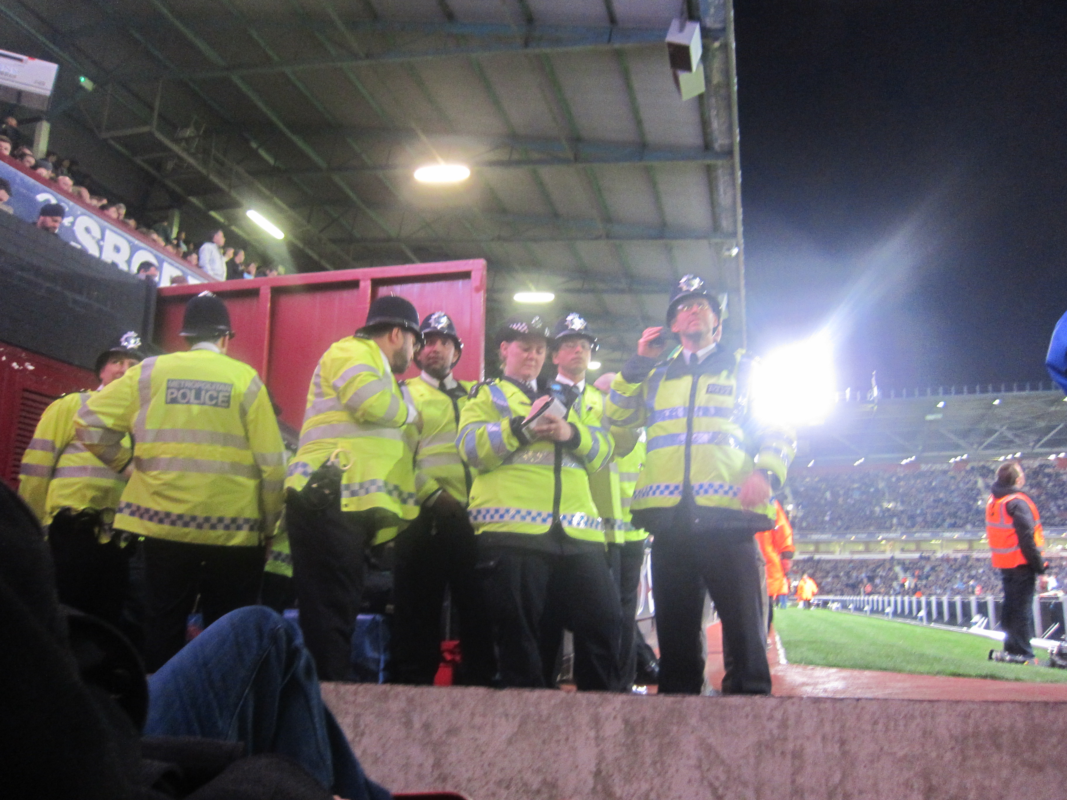 As the United section was sold out, there must have been some ticket touts, who did’t manage to sell their stock. There were at least 20 empty seats around me right in the corner of the ground. Or maybe some fans had decided that they would have a better view from the middle of the stand. As nobody in the United section is actually sitting, it is not impossible to squeeze into a part of the ground with a better view. Or maybe some people have chosen to avoid their seats, as we have about 20 policemen right in front of us carefully monitoring our every move, filling notebook sheet after sheet with observations.