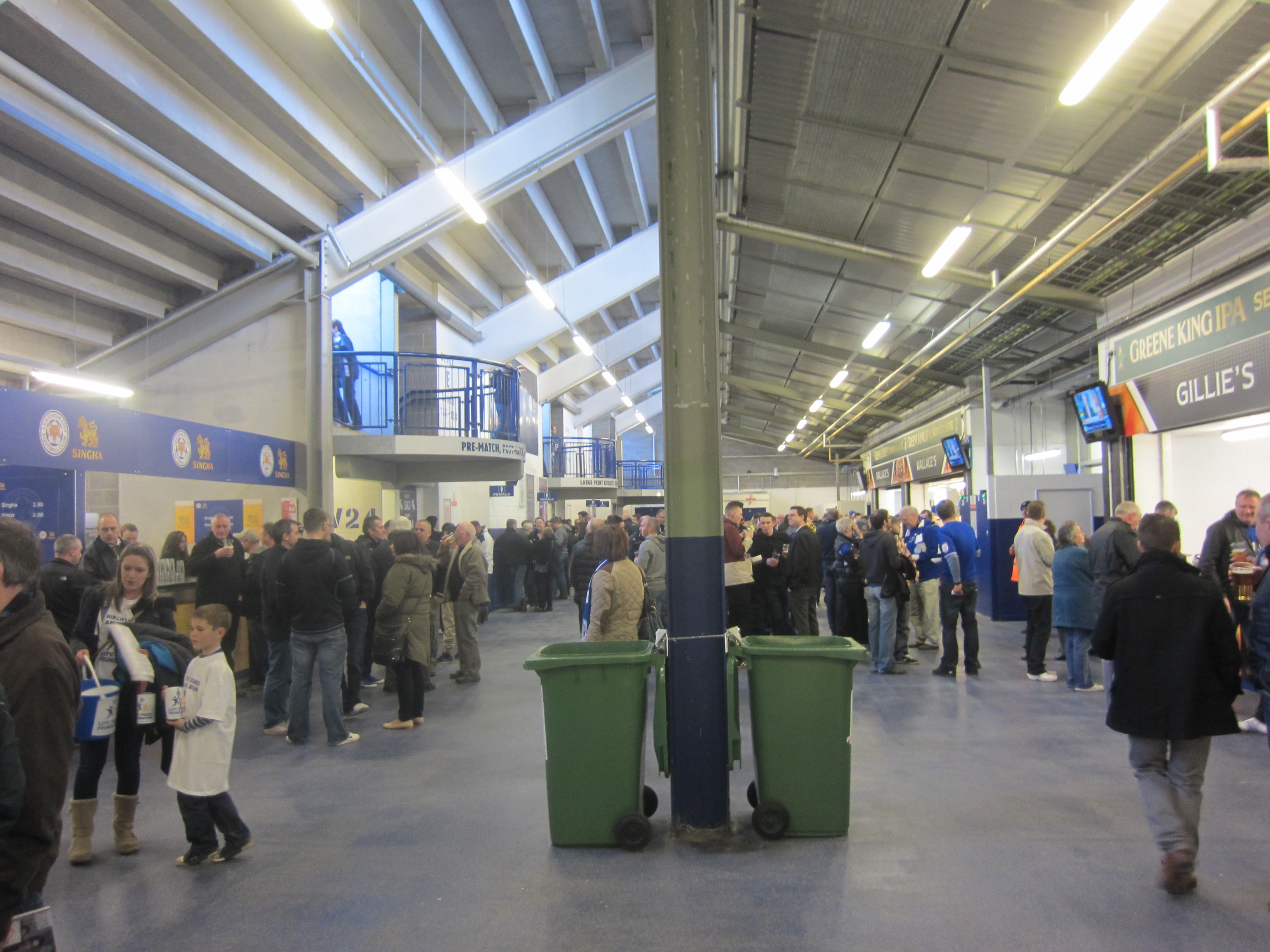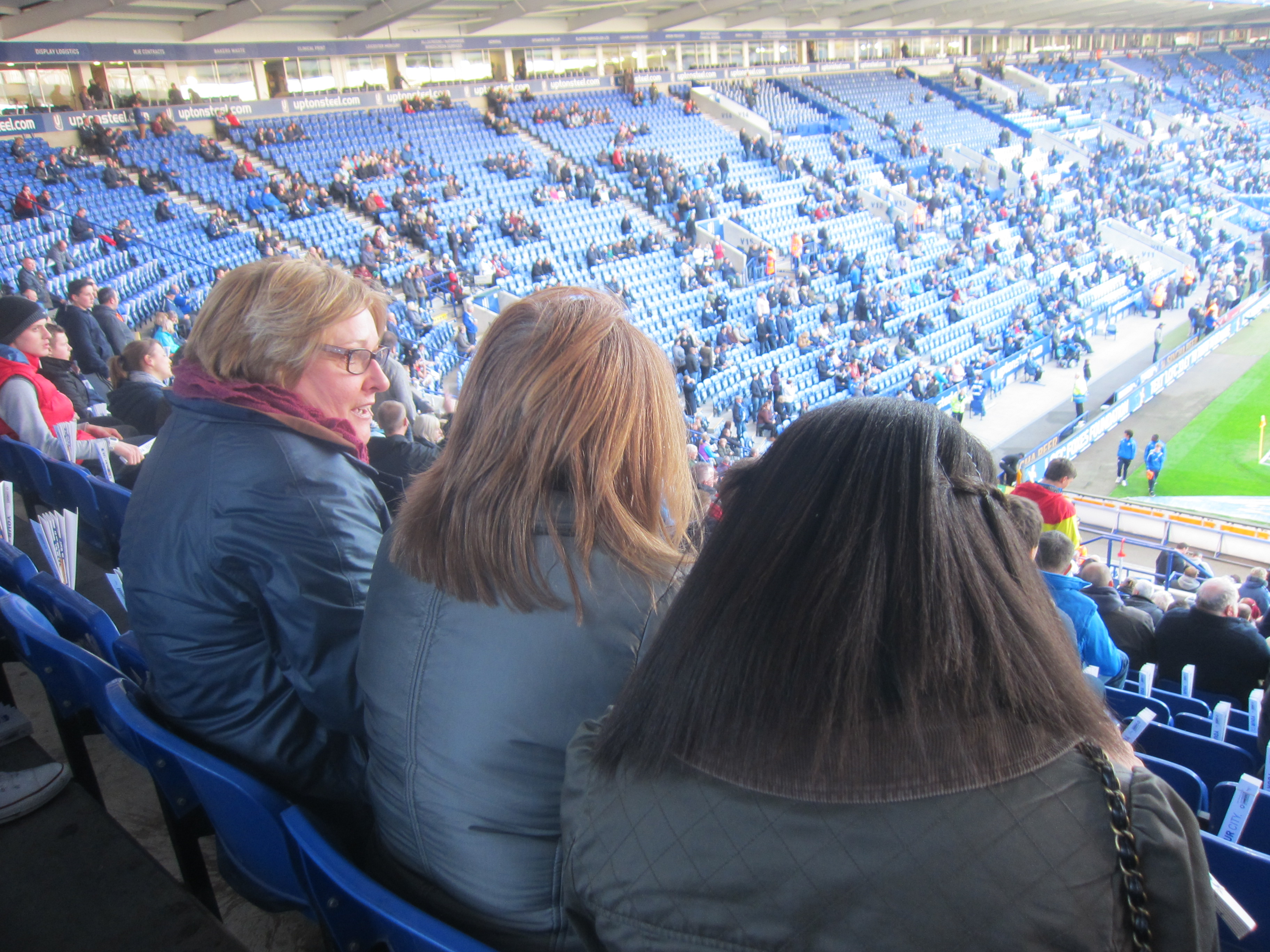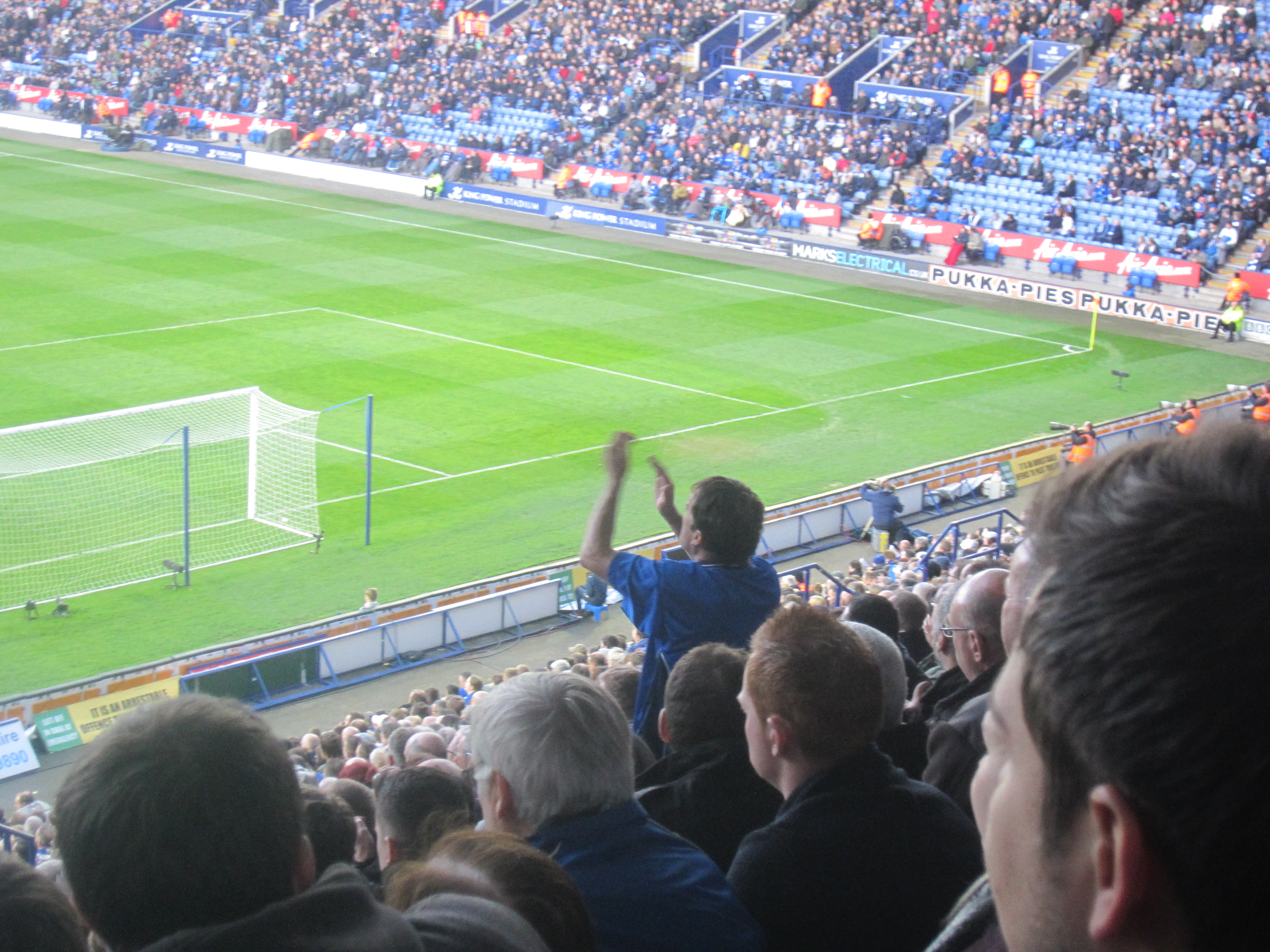 I like the interior of the stand. Spacious, a bit like the old stand at Goodison Park. And here I do manage to get a chicken ‘n mushroom pie. The catering staff reflect that Leicester is the ethnically most diverse town in England, but you wouldn’t be able to tell from looking at the crowd, which is 95% white. Just as striking is the number of women of all ages, not only accompanying men and children, but also going in twos, threes and fours to the games.