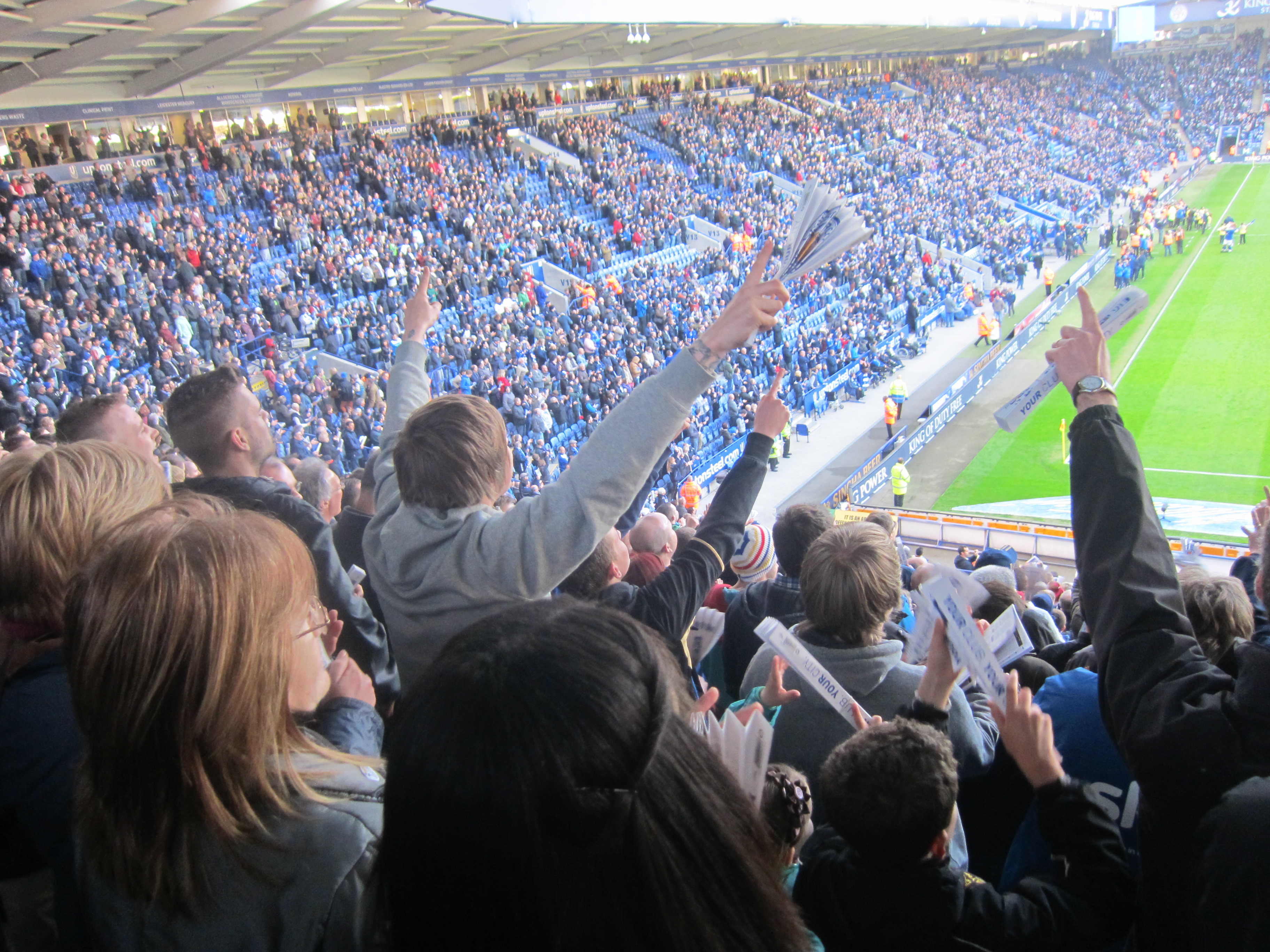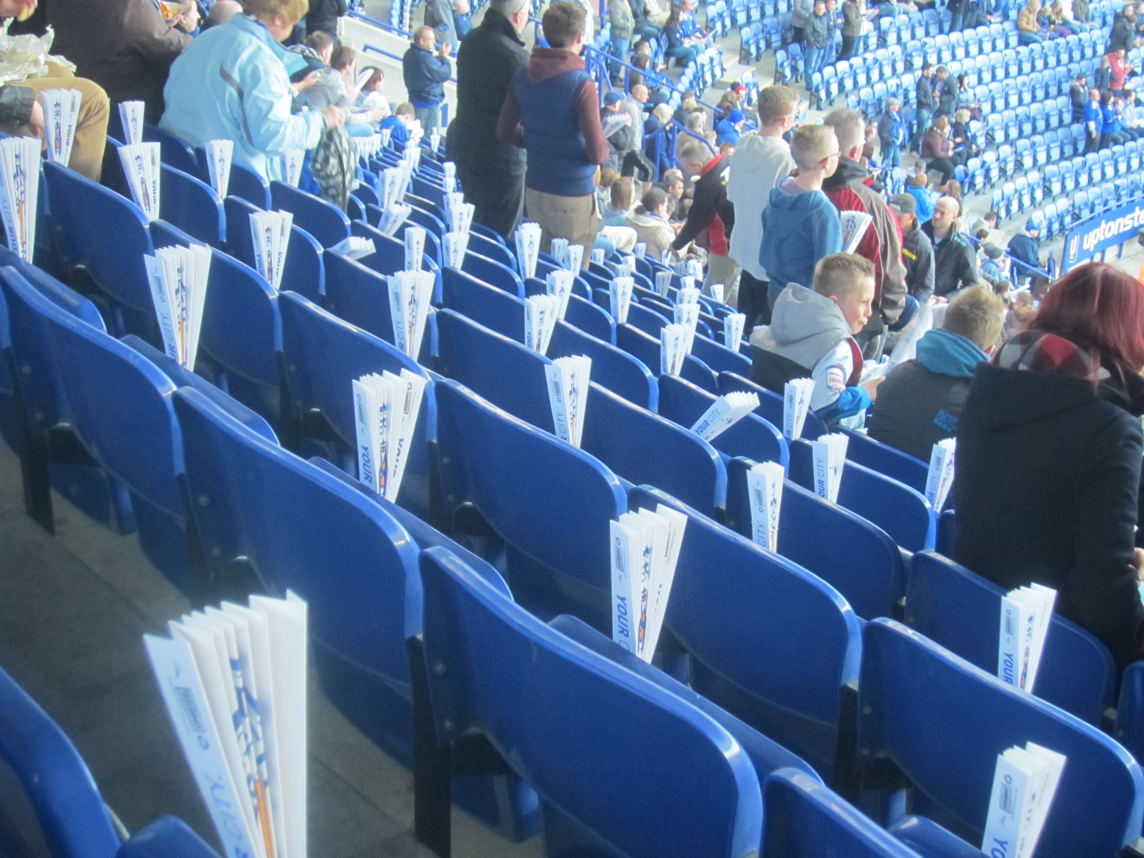 To generate as much noise as possible, Leicester have put clap banners in all seats for the spectators to use for clapping. John predicts that they will probably end up on the field as paper planes, and some do, but even more end as confetti being hurled into the air. Whether the clap banners make a difference or not, I cannot tell. But the crowd is surprisingly noisy even before the players enter the field. Everybody seems to use the clap banners to make noise, and led by pockets of supporters (mainly young men) standing throughout the match, there is also quite a lot of singing and chanting.