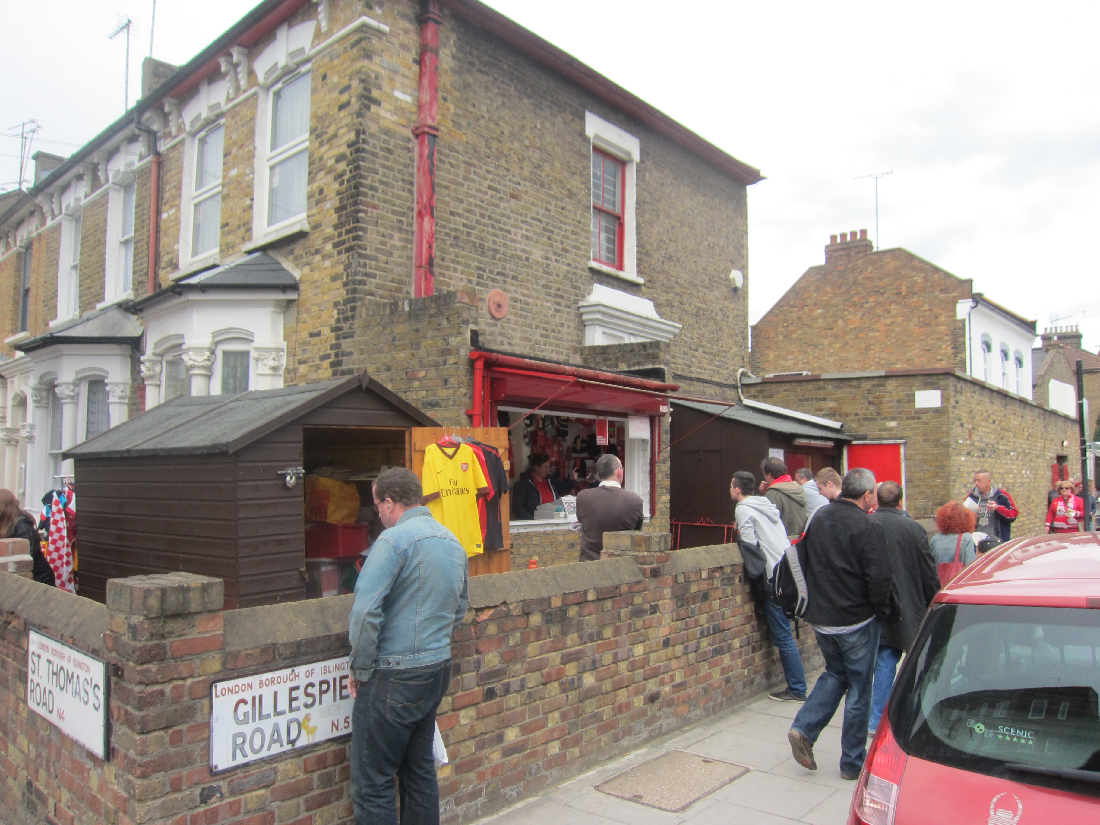 There is the Arsenal supporters club, with ageing women selling tickets for the coach to Newcastle next week, and people walking in and out for a drink. There is a pie stall at “Piebury Corner”, with a selection of pies named after Arsenal players. I opt for a “Tony Adams” – fitting name for a steak and ale pie! And it is quite good as well! And, of course, plenty of stalls selling old programmes or souvenirs.