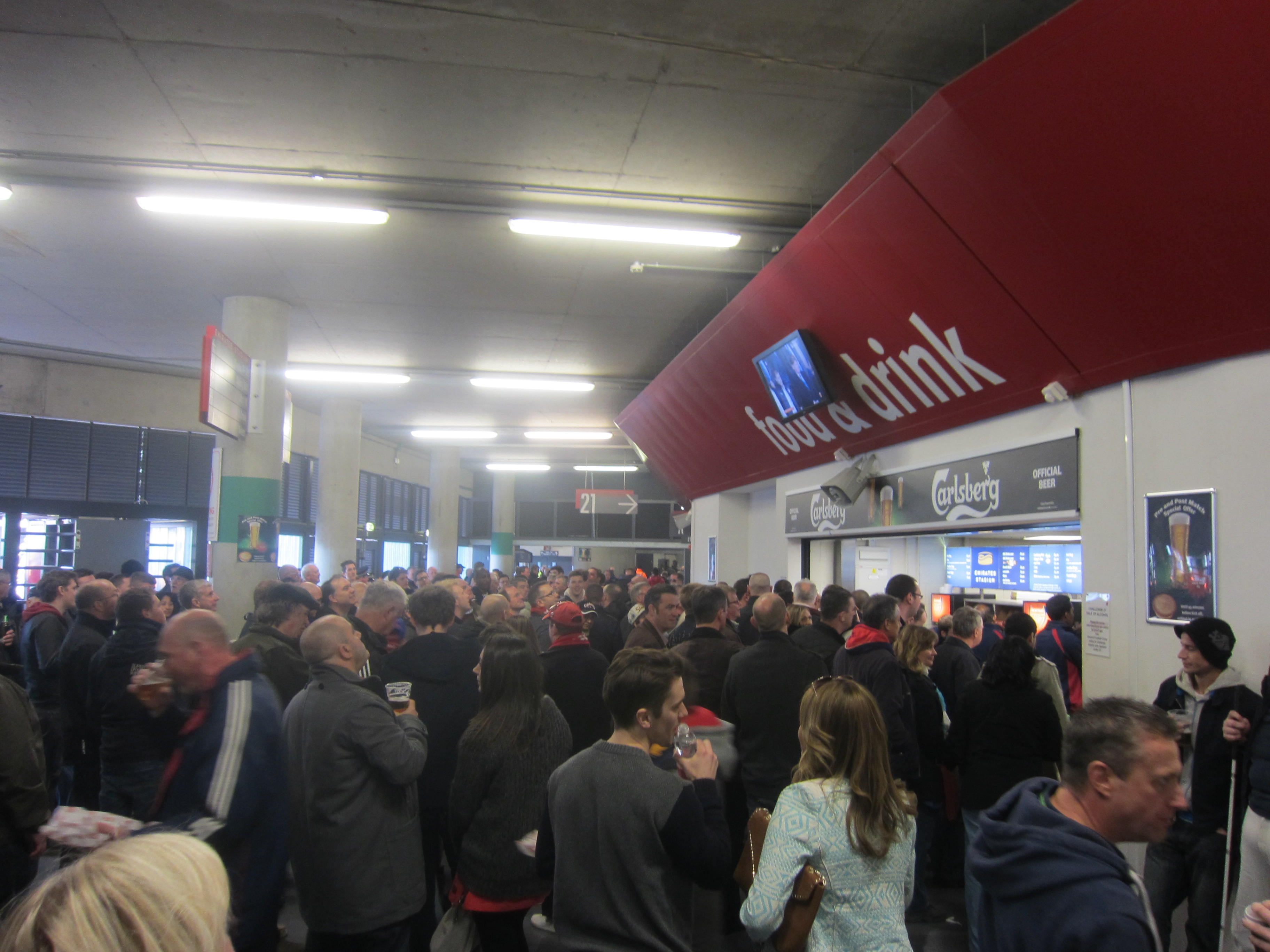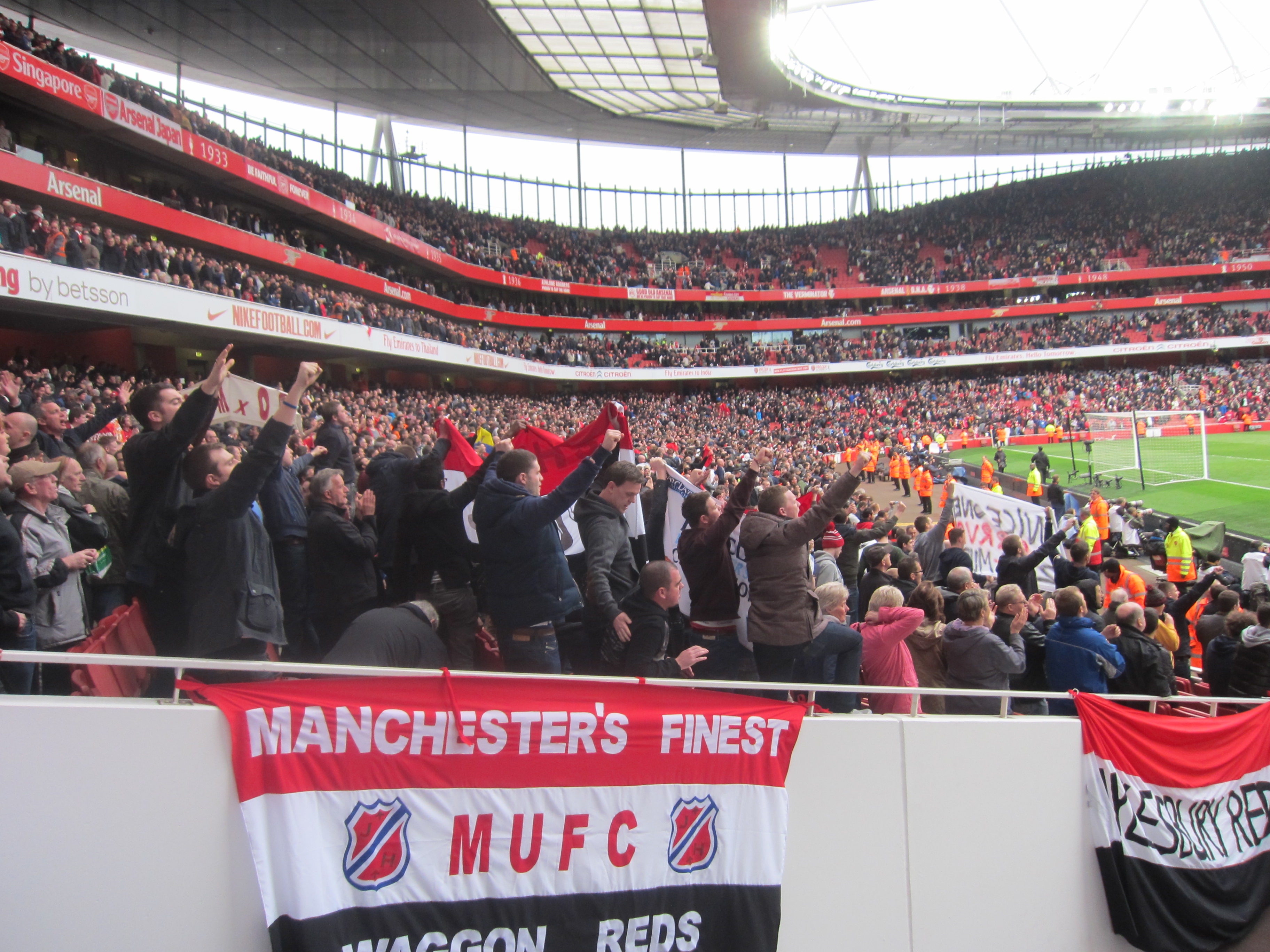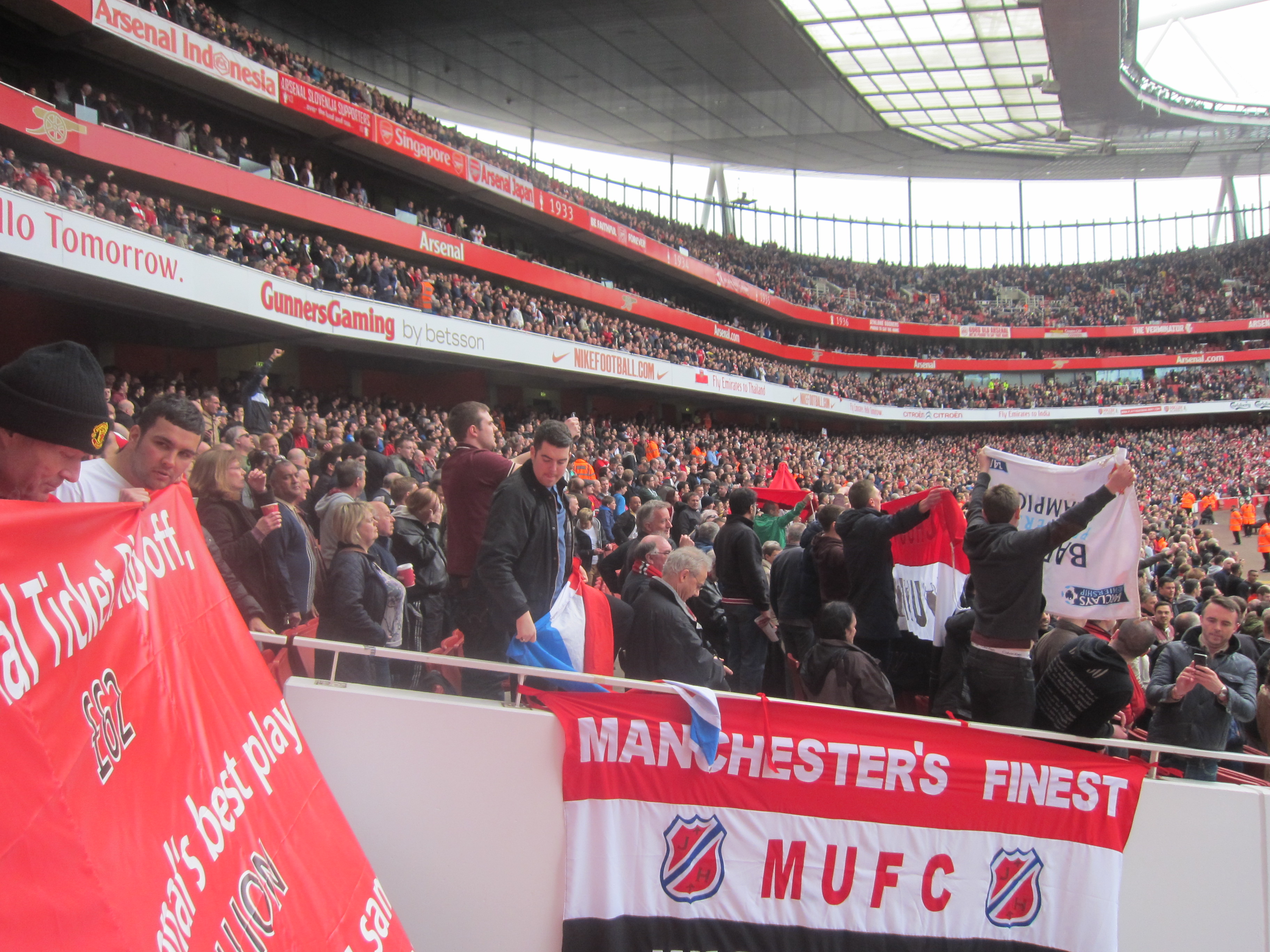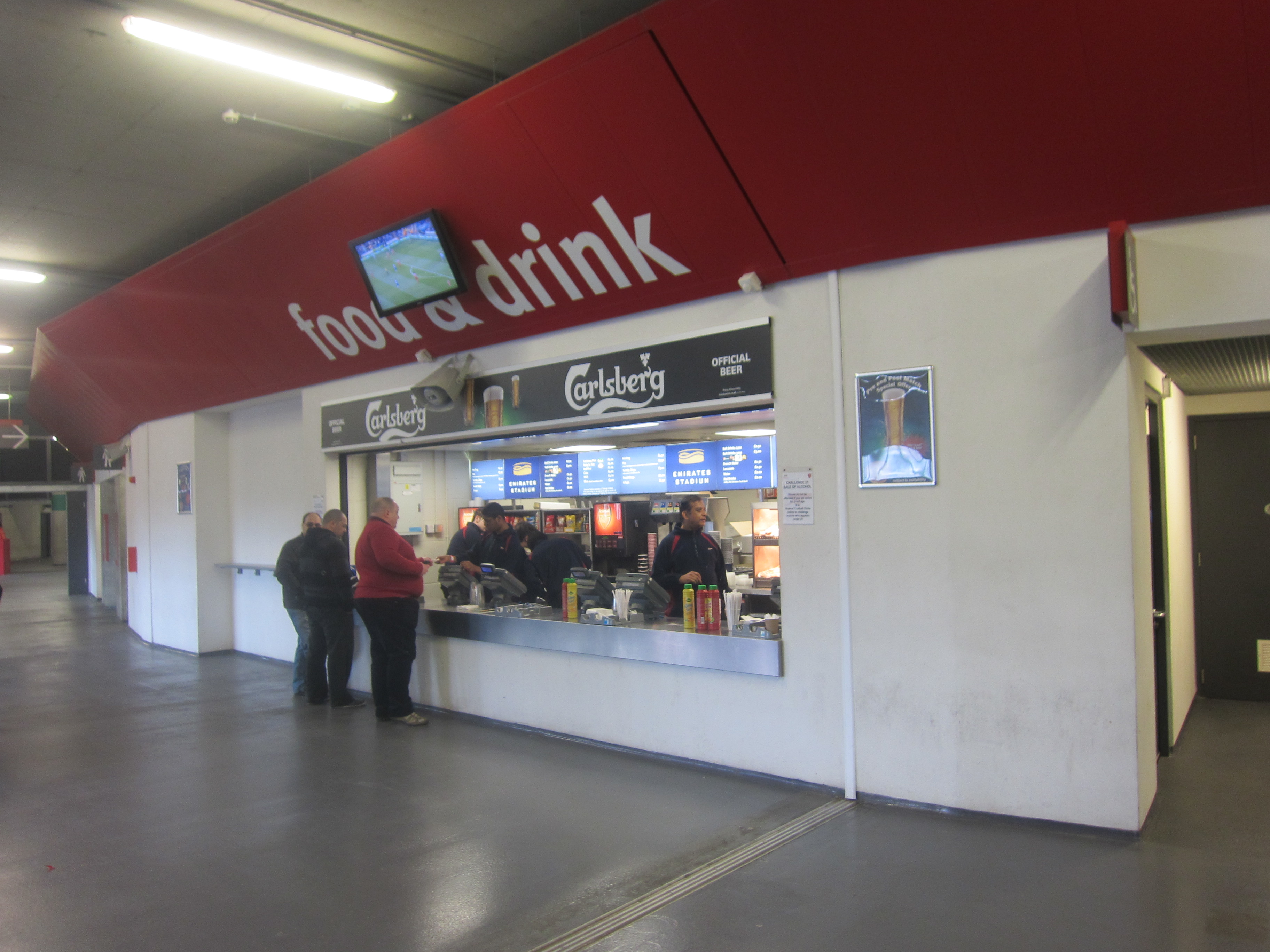 It is not better when you go inside. Maybe because it is the away section, the room is not particularly big; the walls undecorated concrete, and the catering facilities not very inspiring. Compared to the two other modern stadiums visited the previous two days, the Emirates cannot really compare. But gradually the place is filled with United supporters in party mood, and there is singing and dancing to liven up the place. I enter the stands 25 minutes before kick-off, so I just escape a smoke bomb dropped in the midst of the celebrations.