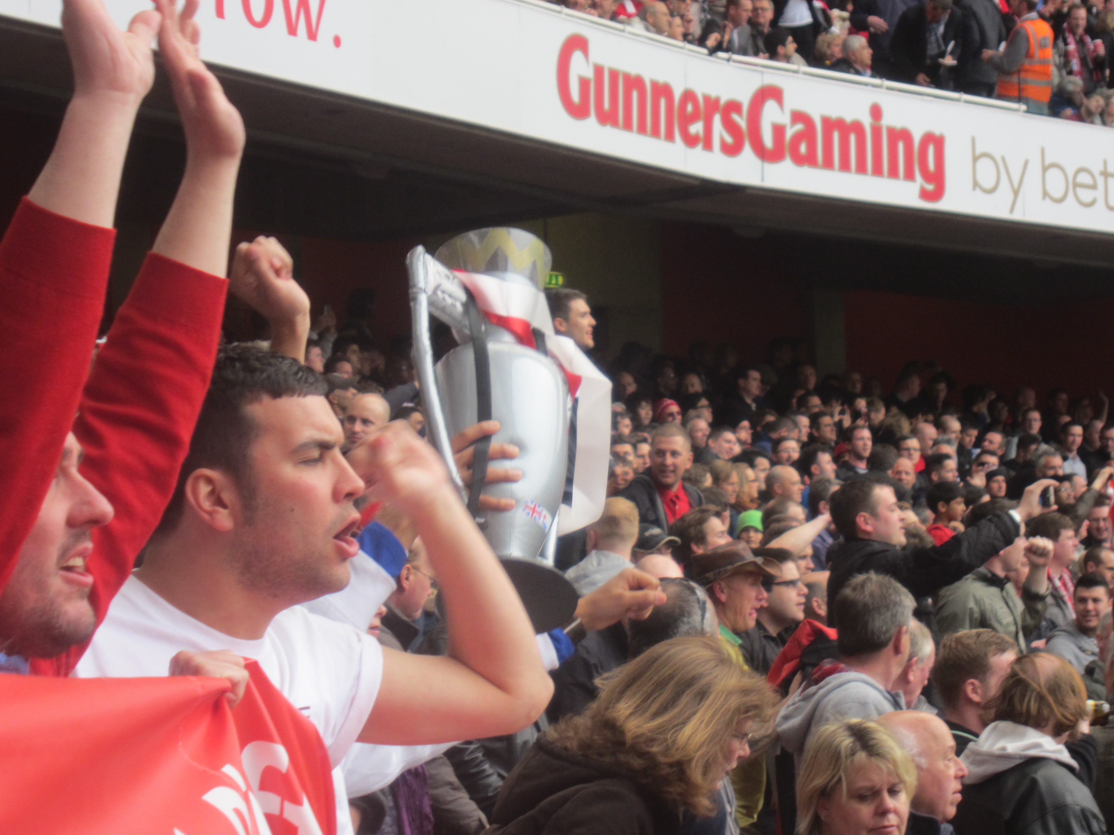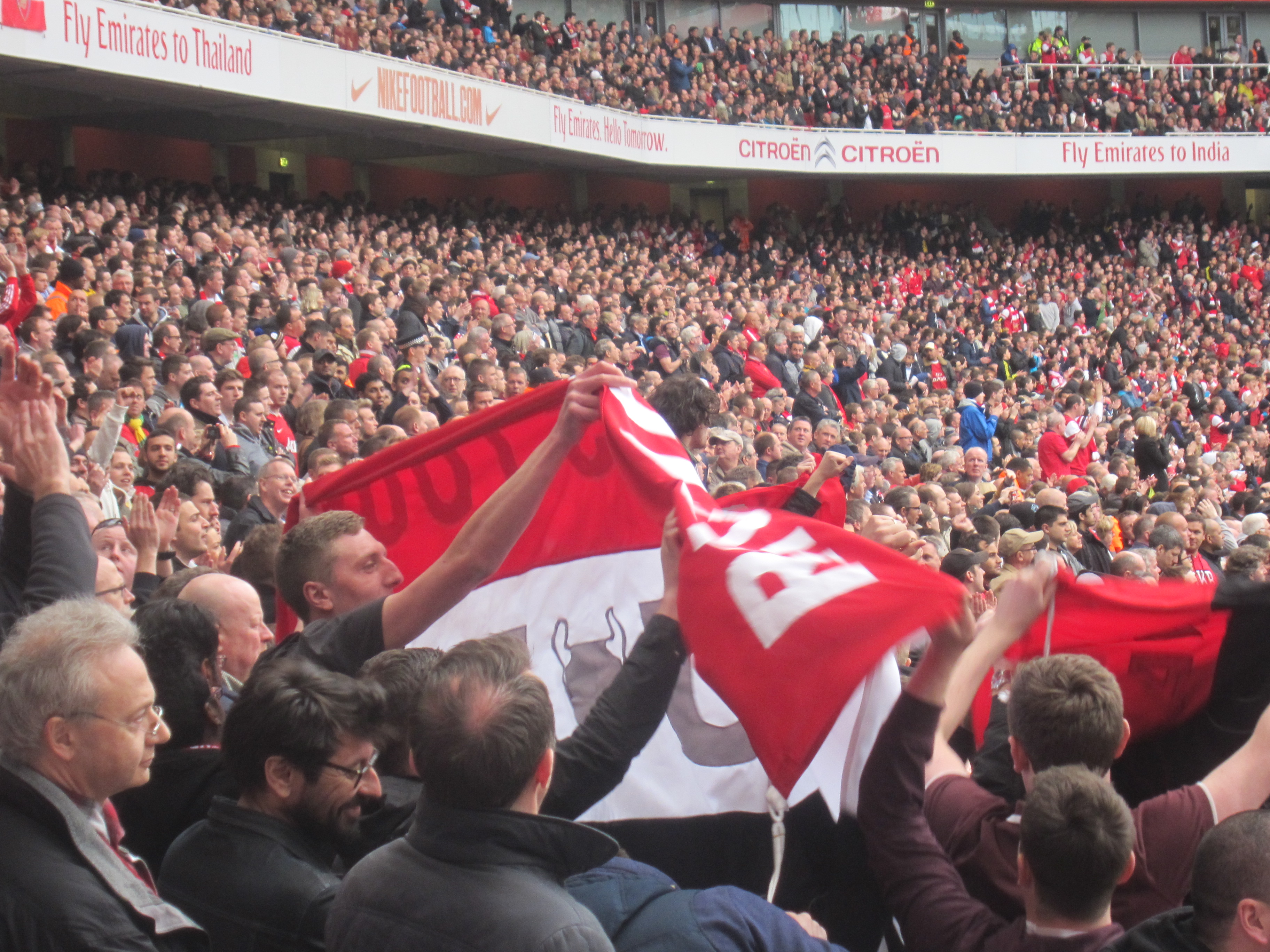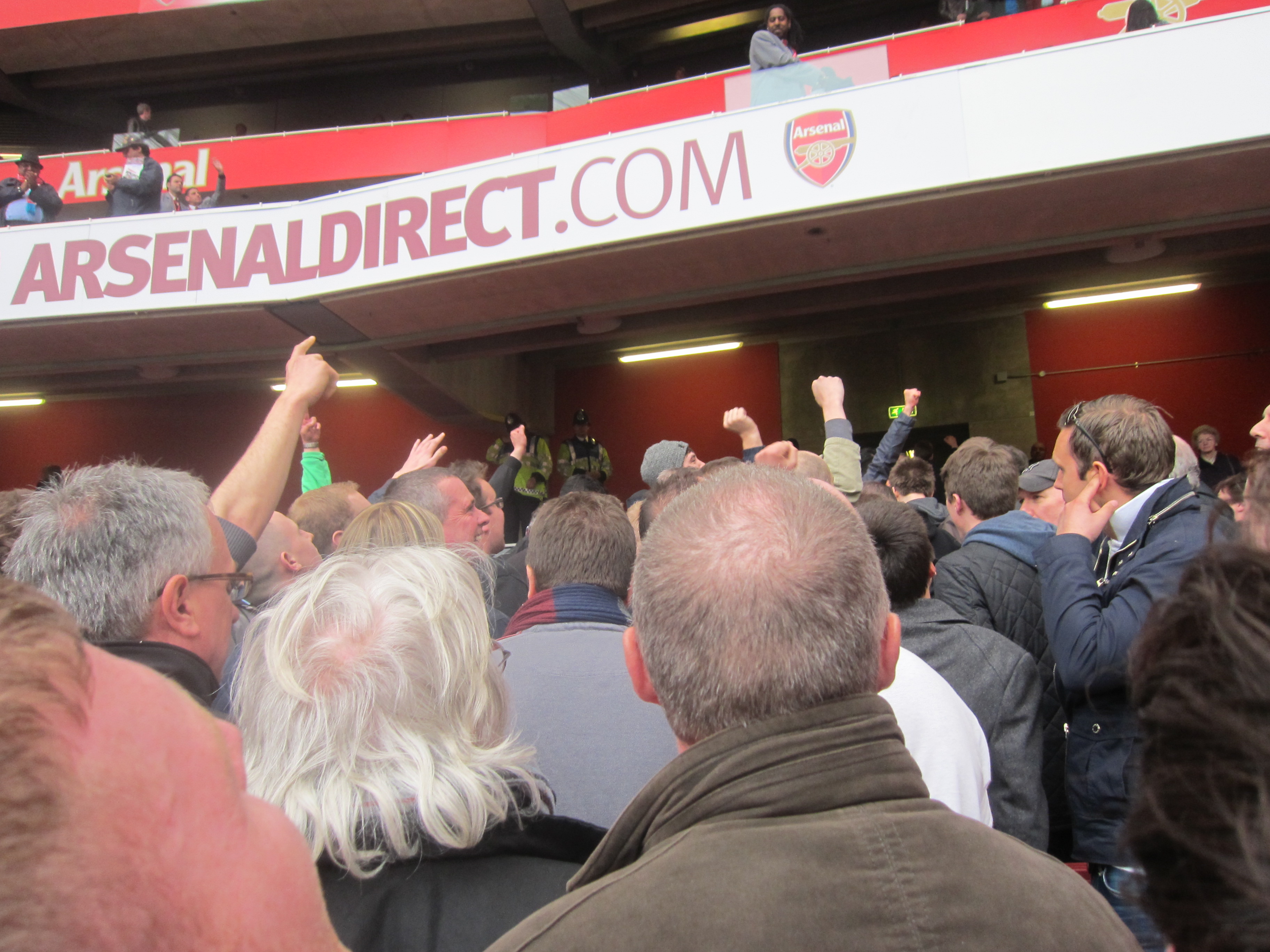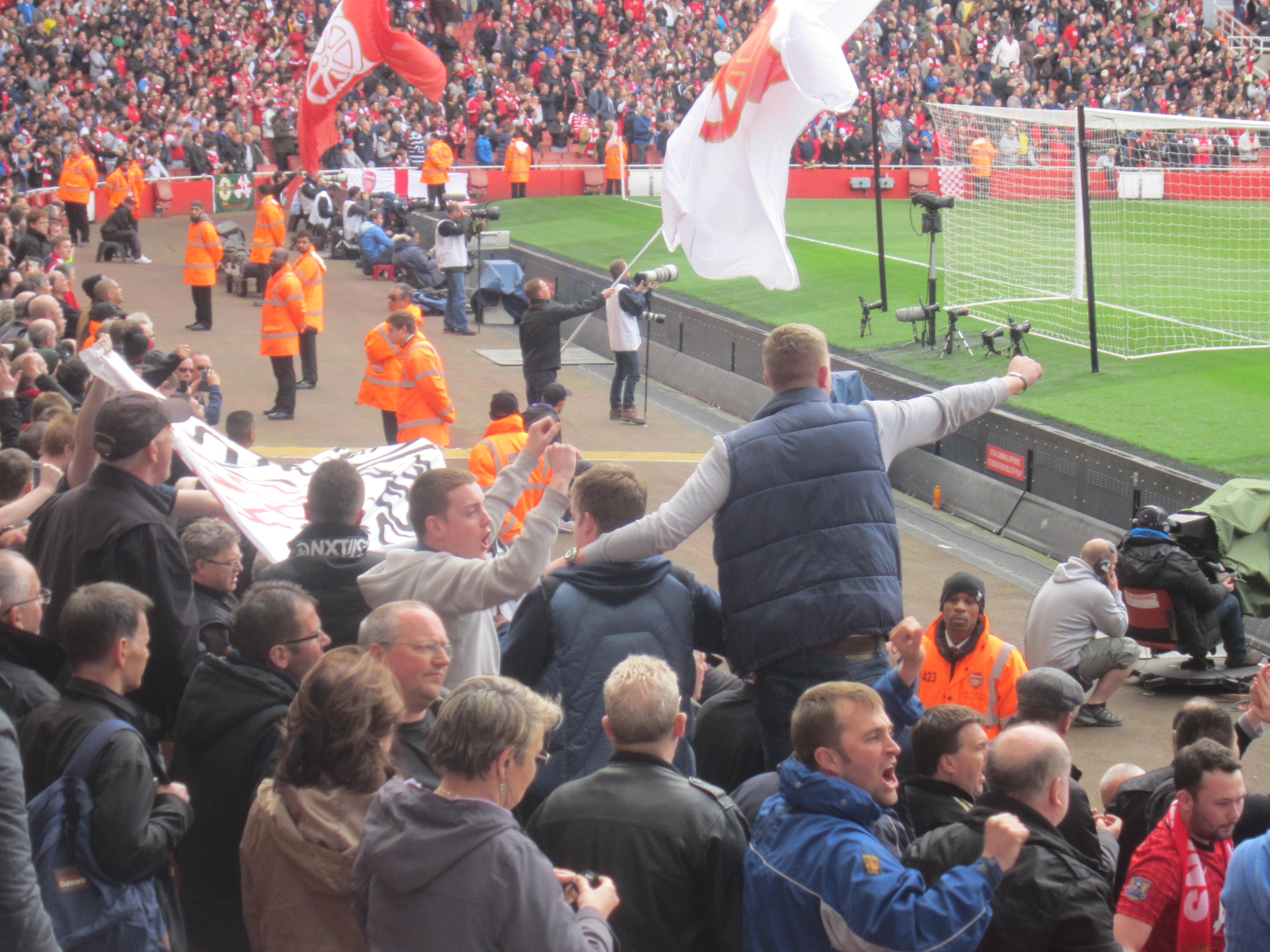 I recognize at least half a dozen faces from the coach load I went with to the West Ham match. Some of them are busy walking around shaking hands with other fans; some leave almost 10 minutes before halftime to get to the beer downstairs. They miss van Persie first winning and then converting a penalty, giving the celebrations and chanting at Arsenal fans new energy.