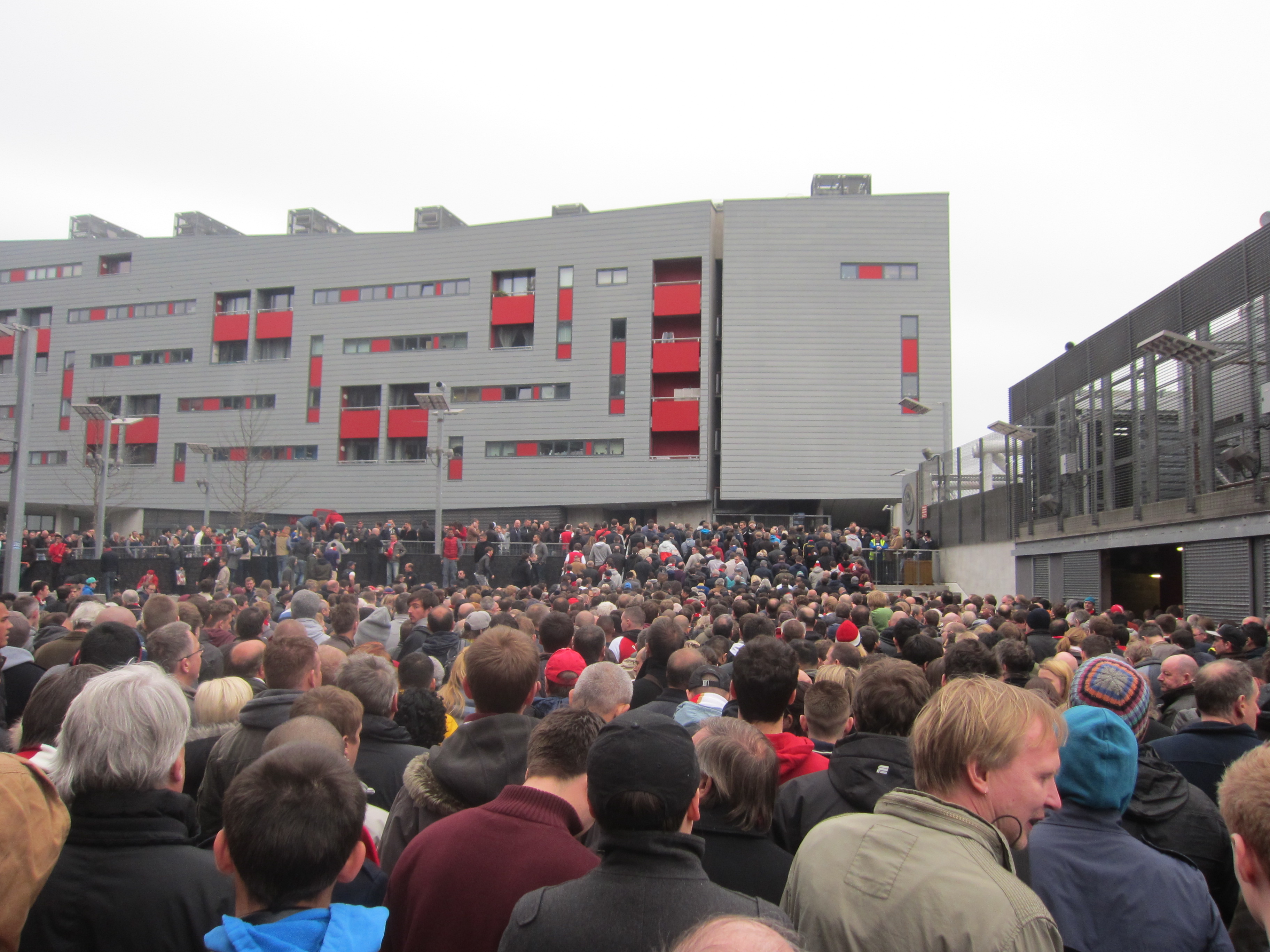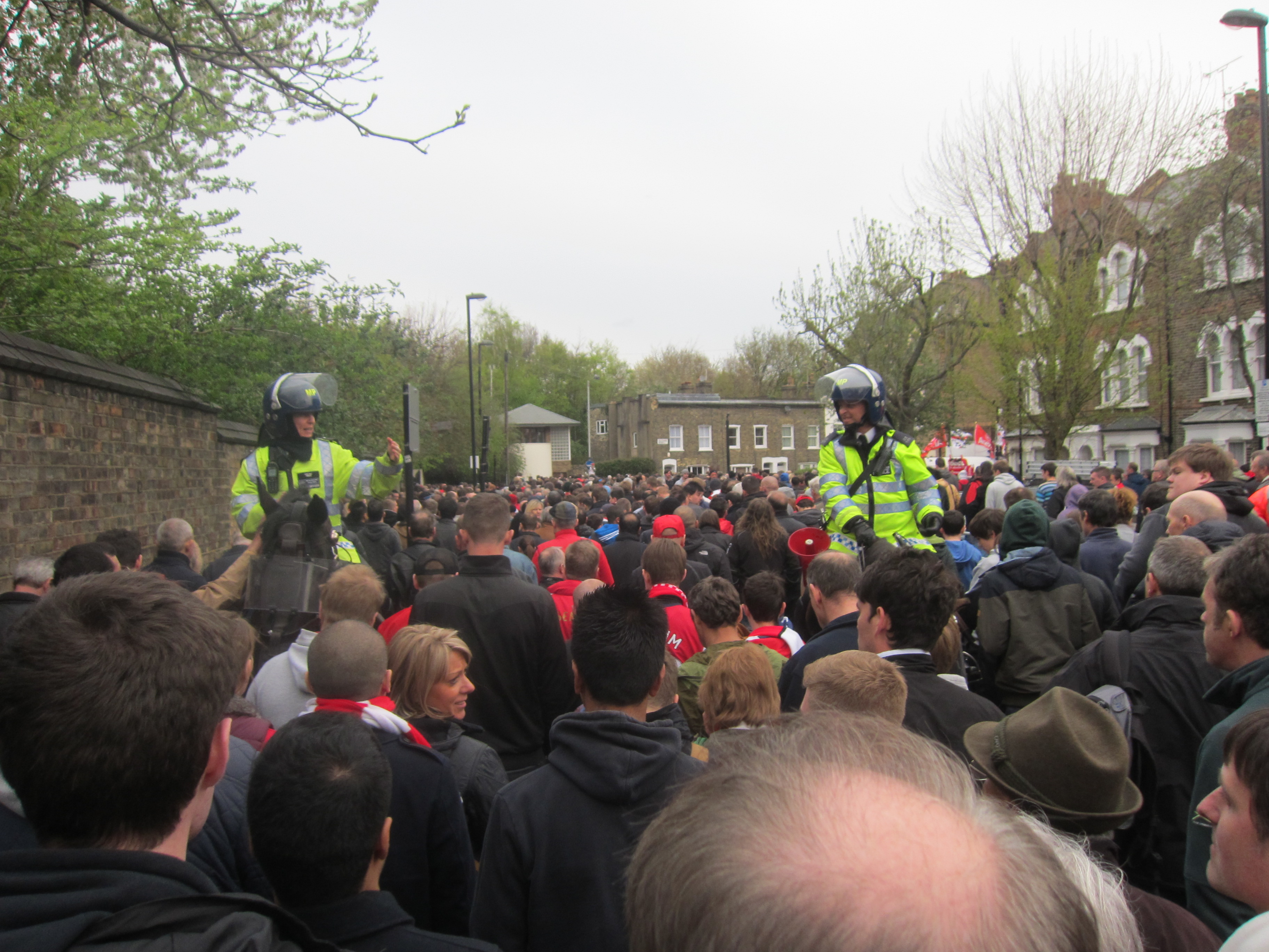 In the second half, United continue to carve out some good openings, without playing particularly well, but they lack the final cutting edge, and the match finishes 1-1. As we leave the ground, celebration songs are mixed with mocking of Arsenal supporters. It does not seem malicious, but some have definetely had a lot to drink and their joy tends to spill over. A guy next to me has his hat ripped off and thrown away, much to his annoyance – but others help him recover it. The smokebomb inside is much worse, as it may lead to a cut-down in the already sparse ticket allocation for United fans. The mounted police outside seem alert to intervene, if things should get out of hand.