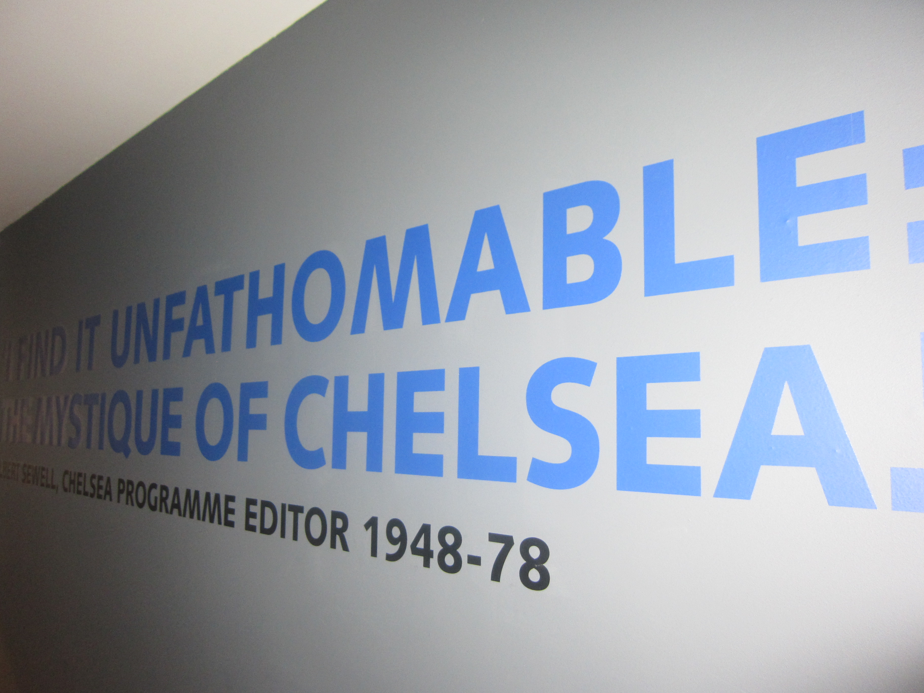 To some extent, I can understand the criticism. The exhibition has been put up so hastily that, for instance, the welcoming quote from Albert Sewell, the programme editor “I find it unfathomable: The mystique of Chelsea” is impossible to read in the corridor, unless you use the flash of your camera to lighten up the darkness – and the positioning of the following texts is very poor, and they are very difficult to read because of the small size of the text and the use of white letters on a light blue background.