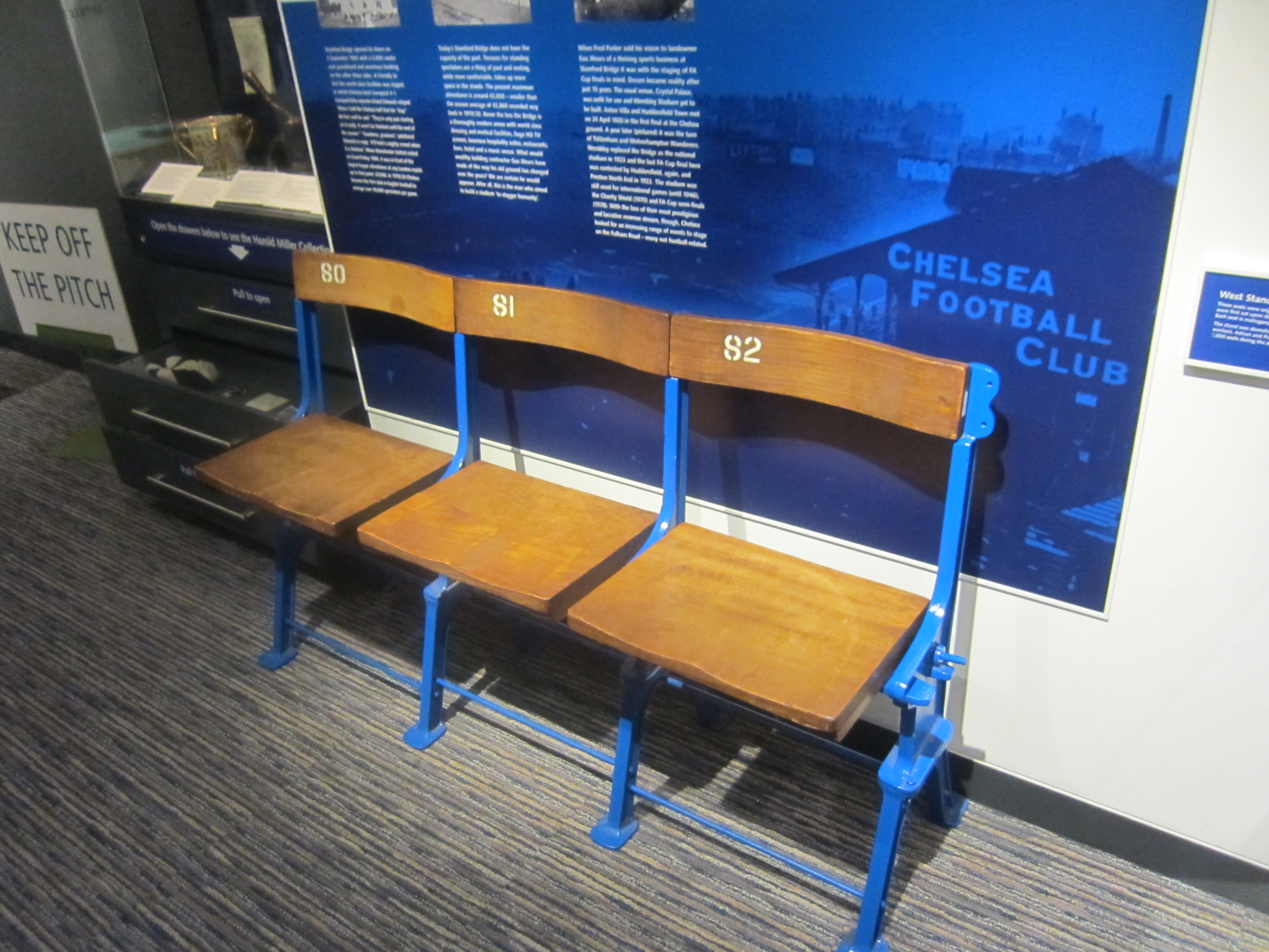 I think it is brillant to spend so much space on two giant models of Stamford Bridge in the sixties with the impressive terracing and the modern ground. Among the exhibitits are wooden chairs from 1966-97 and a shirt from the campaign to save the Bridge in the 80’s, There is a really good mixture between texts, photos, a digital timeline, and screens that contrast the football experience “then and now”. Comparing and contrasting is always powerful in museum displays. Perhaps it would work even better, if the wooden seats were supplemented by modern plastic ones.