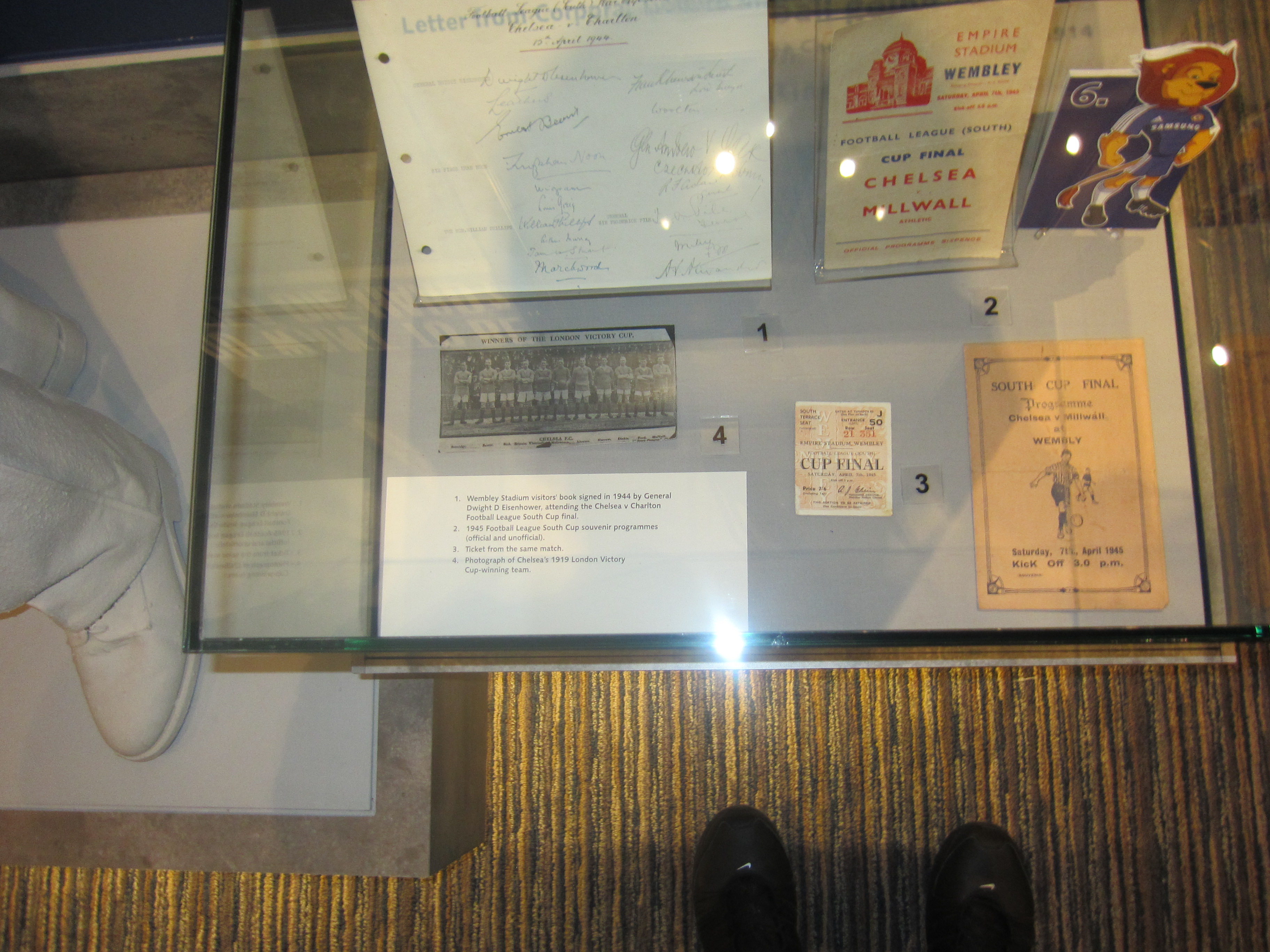 In the Chelsea at war session, the eyecatching trench experience may be a bit too much. And technically speaking, the relatively large amount of text is not comme-il-faut in museums. But the stories about Bob ‘Pom Pom’ Whiting, who was found guilty of desertion on the day of his child’s birth – and was eventually killed by shell-fire in 1917 – and the Chelsea manager Bob Birrel defusing an unexploded bomb on the stadium terrace in order for a match to go ahead, are the sort of vivid stories that you remember long after a musem visit. It may be that the texts are longer than the perceived norm. But if they had been shorter, they wouldn’t have conveyed such interesting stories. And there are really interesting objects as well. For instance the visitors book from Wembley, signed by Eisenhower attending Chelsea vs. Charlton in 1944. In fact, that story could also have been unfolded even further.