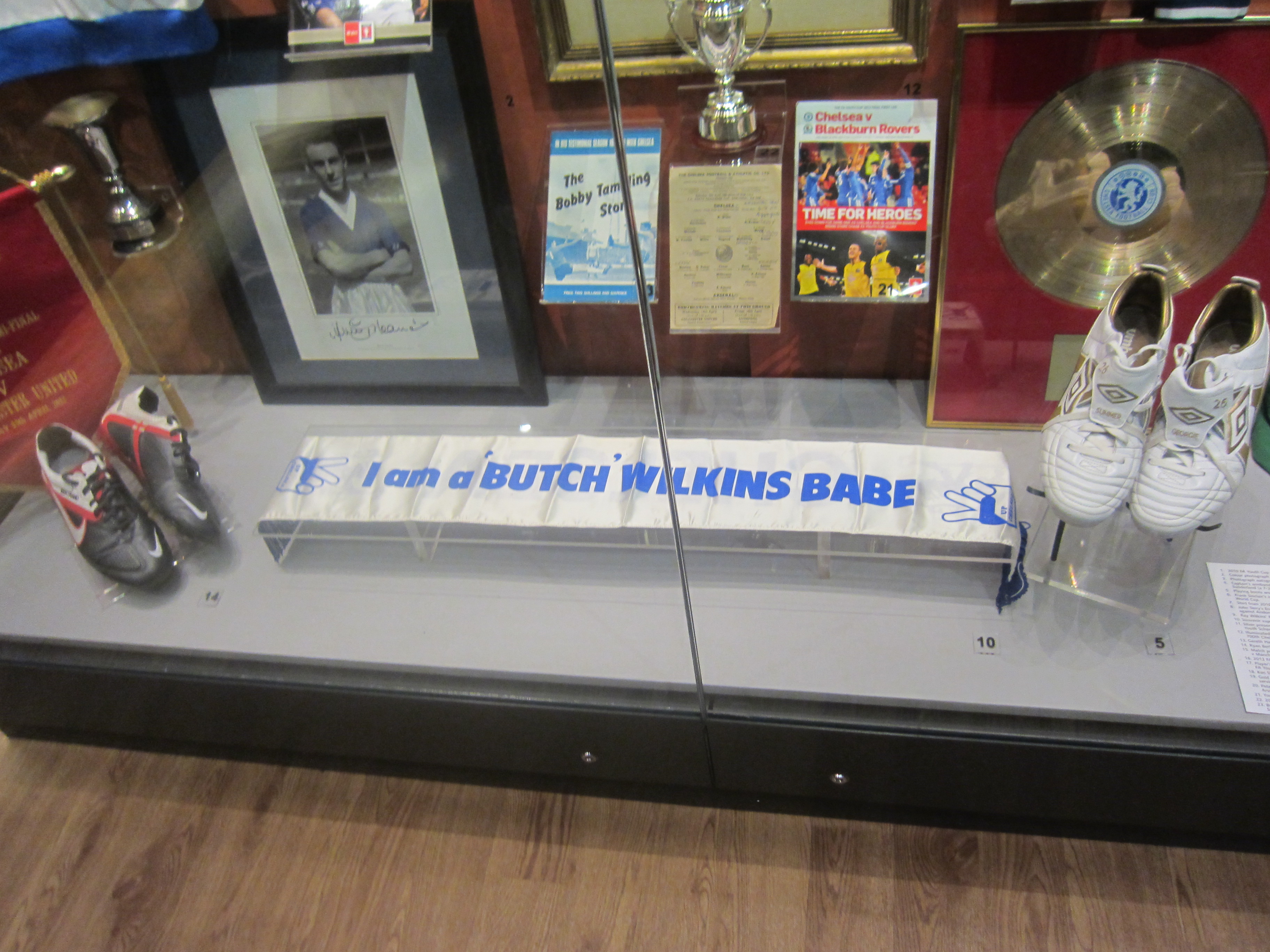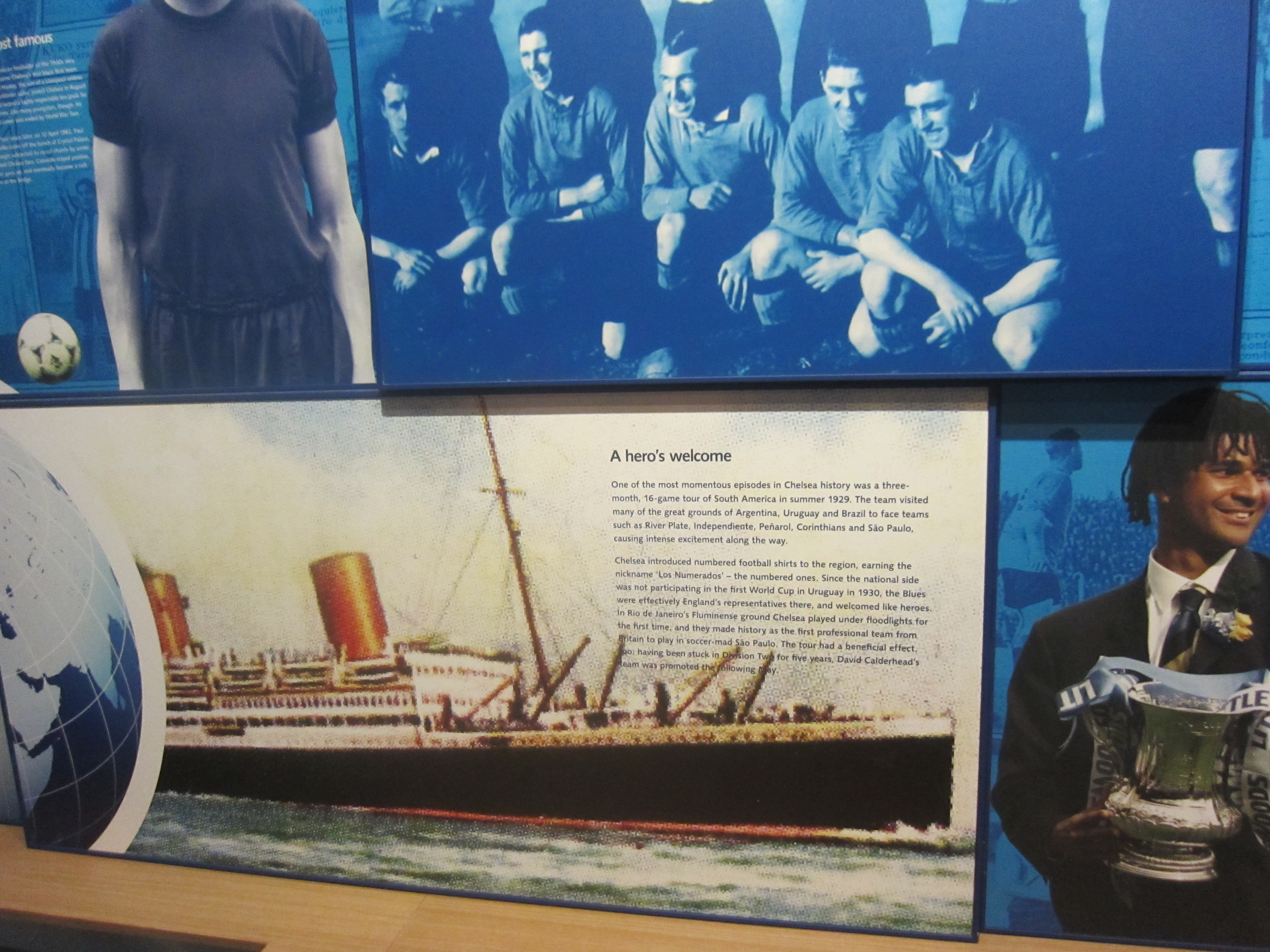 And when you look at it, the collection does not seem overwhelming. The exhibition is definitely not carried by the objects but rather by the head- and storylines in huge printing on the wall. And this is often more boastful than informative.To give an example. A collection of shirts are displayed under the headline “On 25th August 1928 Chelsea became the first team in London to wear numbers on the back of their shirts”. Actually, on that day, numbers were worn in two matches, Sheffield Wednesday vs. Arsenal and Chelsea vs. Swansea. Another example of the text, perhaps, going a bit too far is: “No set of supporters has embraced overseas players more than ours. As communication shrinks the globe and Chelsea’s popularity broadens we can truly say that the planet is slowly turning royal blue”. Or what about this quote: “They are a cosmopolitan, philosophical tribe down in west London, they march with the times, sometimes ahead of it: they accept change, knowing that nothing remains static”.