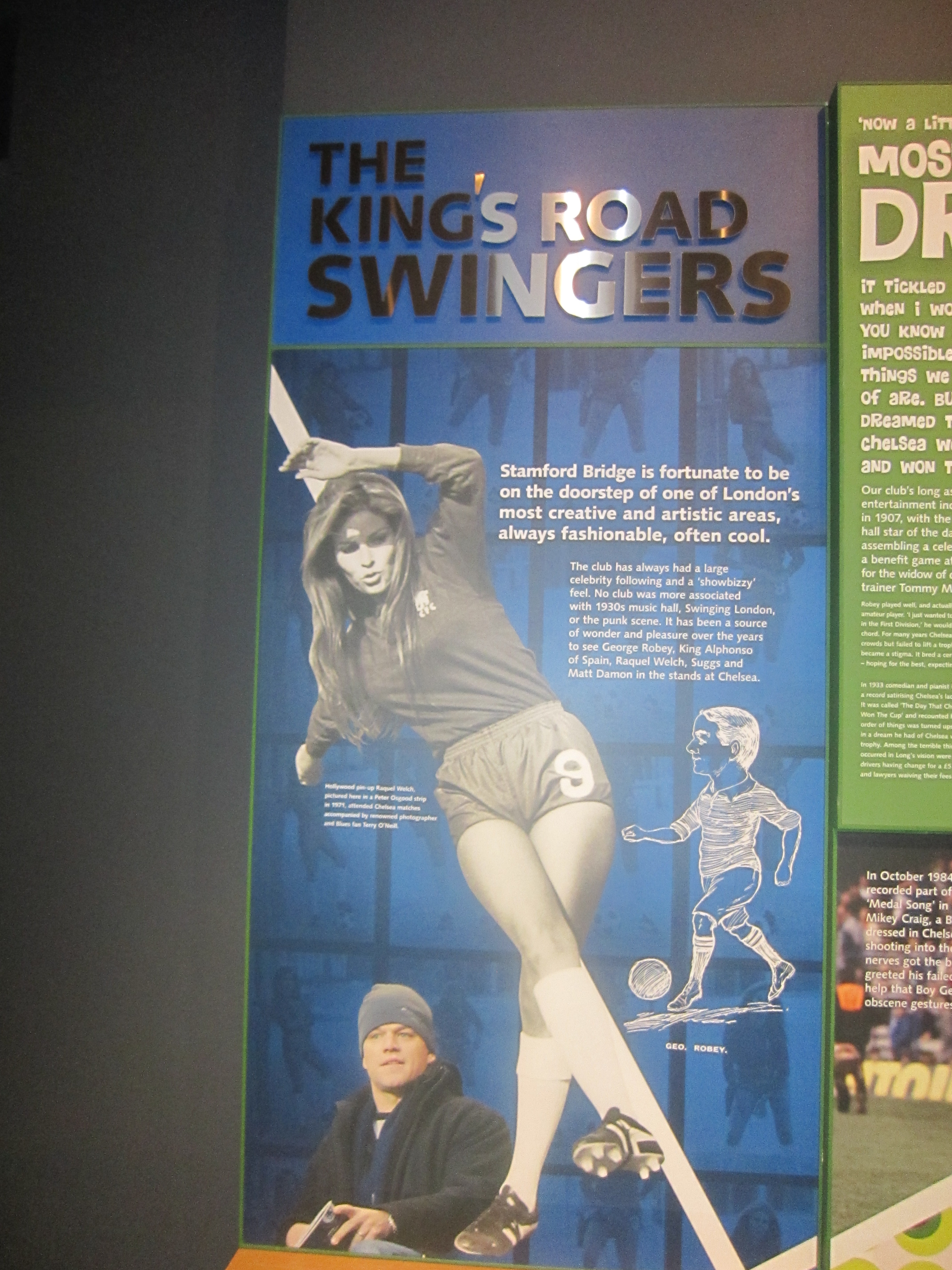 And I also like the “Kings Road Swingers” section. The graphics. photos, quotes, Peter Osgood-related objects and music (the 1972 “Blue is the colour” Cup Final record) really gives a wonderfully cohesive impression of Chelsea as part of swinging London. The objects in themselves are not sensational, but the staging of them in a context is well done. Perhaps there could have been a bit more focus on Peter Osgood – but instead Raquel Welch is quoted: “Tell them Osgood is not forgotten on the plains of Almeira”, accompanied by a photo of her in a Chelsea kit during a film shooting. Certainly to someone who grew up in those years, it works better than more didactic museum texts about what the sixties and seventees were like. But the section would have been even better with a session devoted to fans’ consumption of the games – where the cup final rosette from 1970 and the satin “Butch Wilkins” scarf could be displayed
