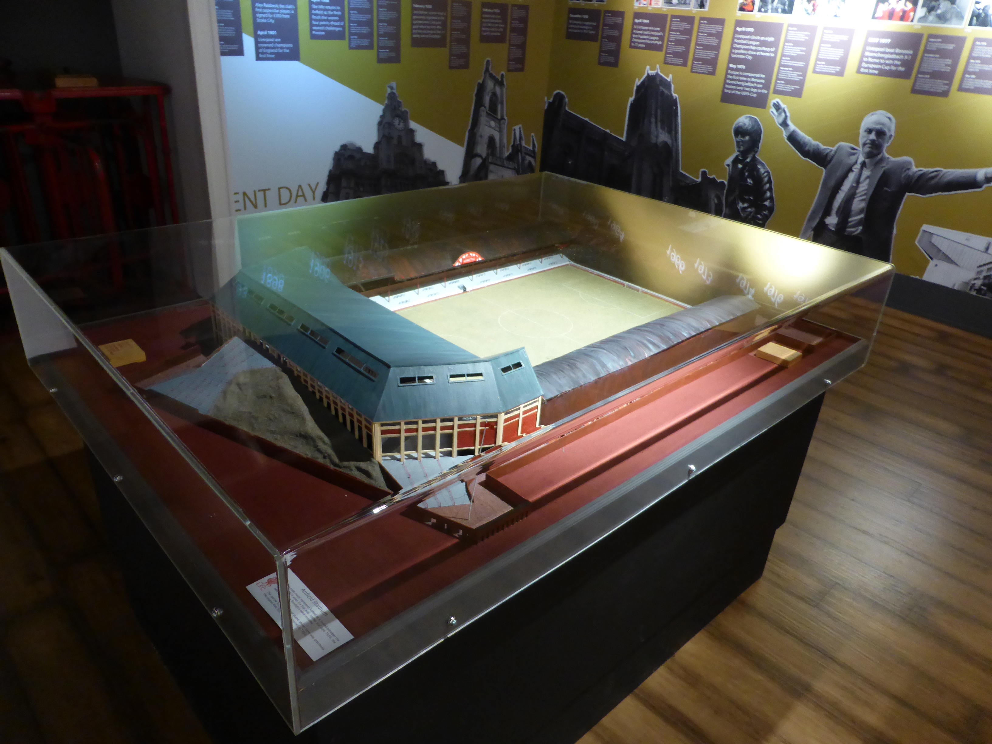 Another example is the way the impressive model of Anfield Road 1928-56 is presented. Previously a fantastic series of photos of the ground and the surroundings through the decades were displayed on huge photostats on the walls of the room. For instance, there was a photo from 1893 showing the street life with children playing in the streets – a photo taken to prove that children were being used to fetch beer for their “drunken” parents! The series went on with the stadium plans of Archibald Leach, the story of the Spion kop, the rebuilding in the swinging sixties on to the modern all-seater stadium. In the new museum, this has been replaced by a timeline telling about Liverpool’s wins. There is, admittedly, a new timeline about the stadium in a passage from the section on the Liverpool fans. But this is more a matter-of-fact line about replacement of old stands than a passionate description of what going to Anfield was like in different decades.