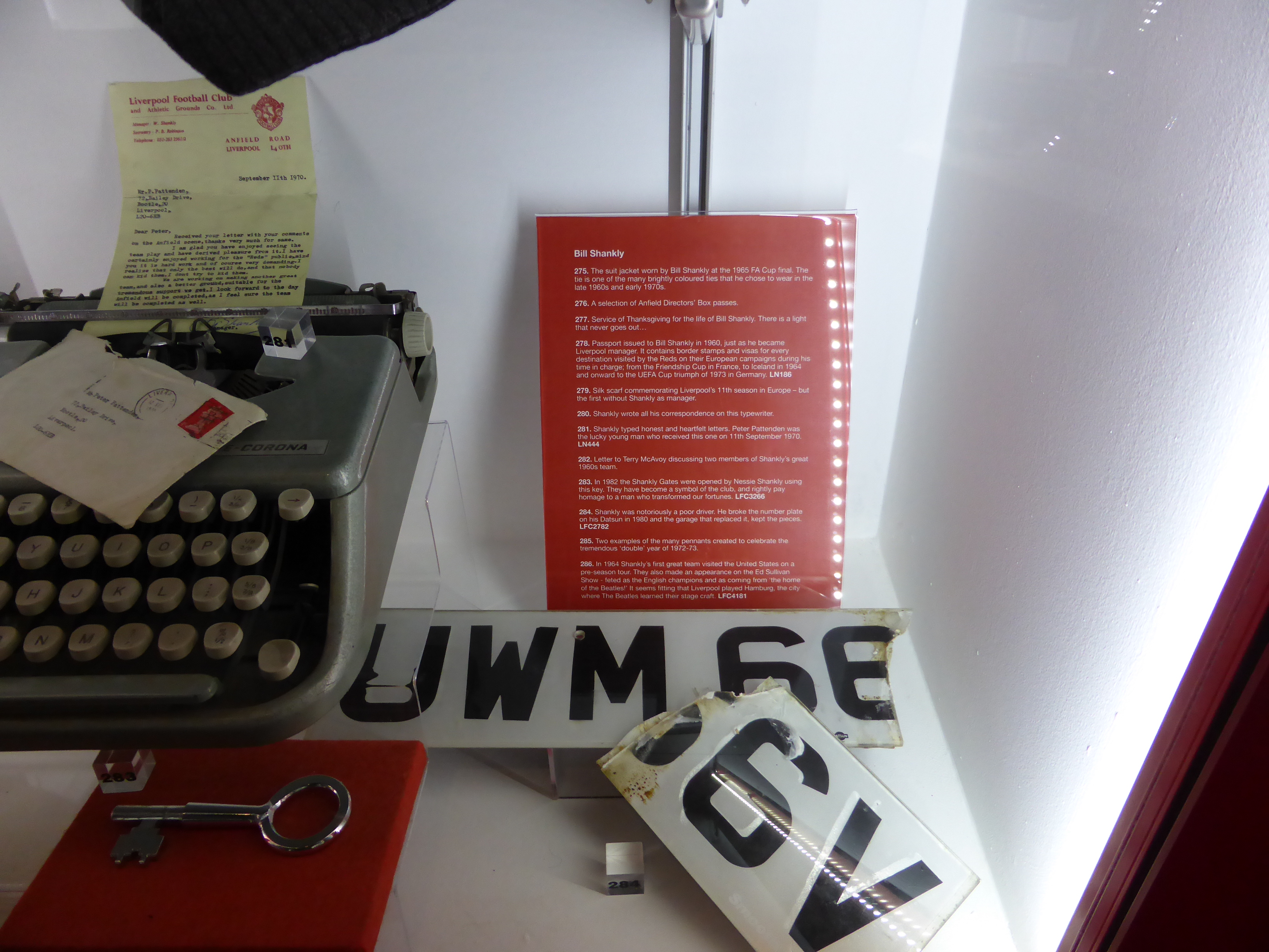 The Liverpool museum possesses several objects from the early days of the club. The “birth certificate”, a tender for building the first stand, a director’s walking stick with the Liverbird from 1892, a turnstile, crush barrier and a brick from the old Kop, a WWI rattle found under the Anfield Road stand with the inscription “You Will Hear Us Every Saturday”, old scarves and banners, Bill Shankly’s typewriter, one of his broken number plates (proving that he was a notoriously bad driver), and a selection from Bob Paisley’s travelling medical kit.