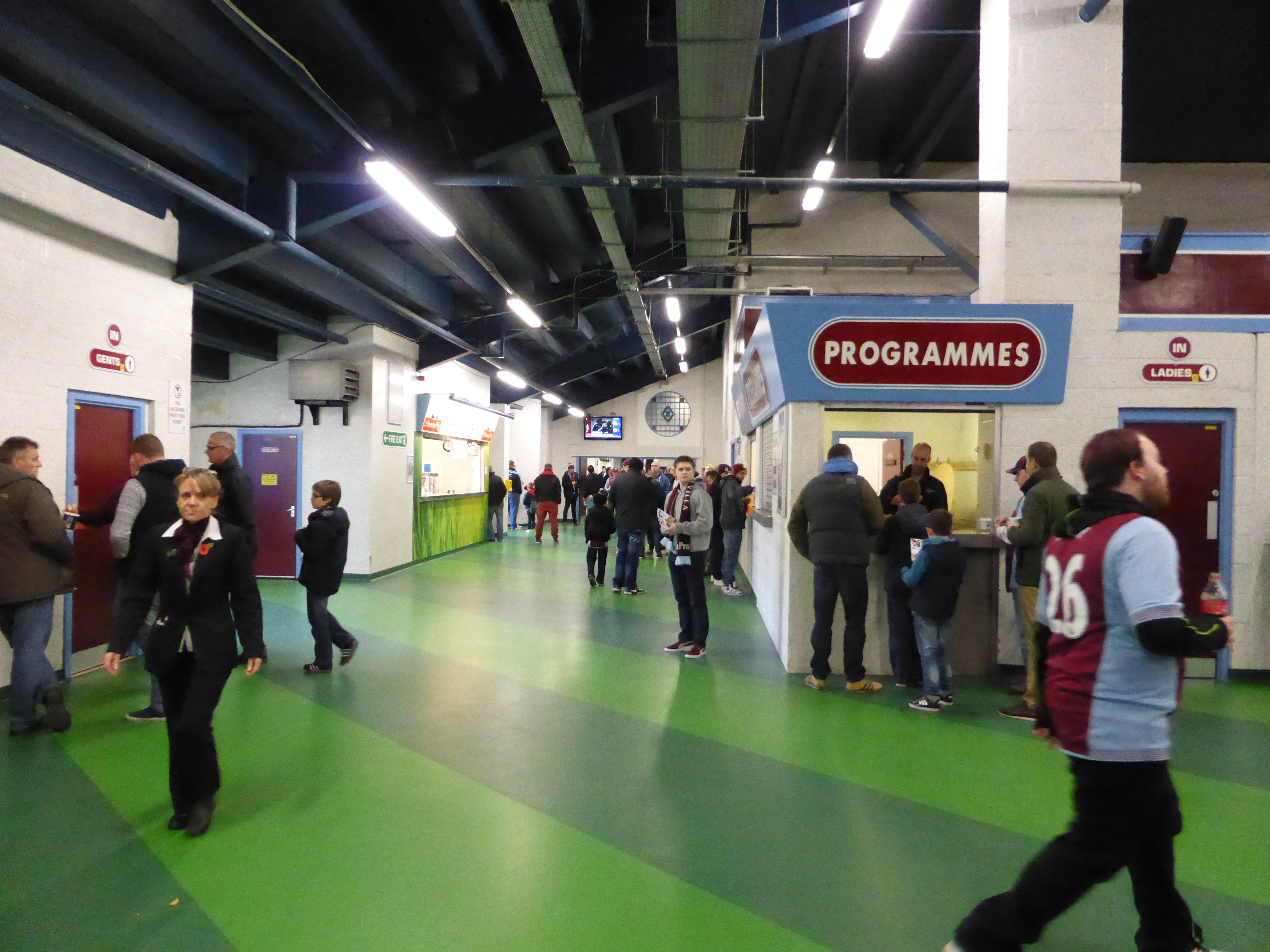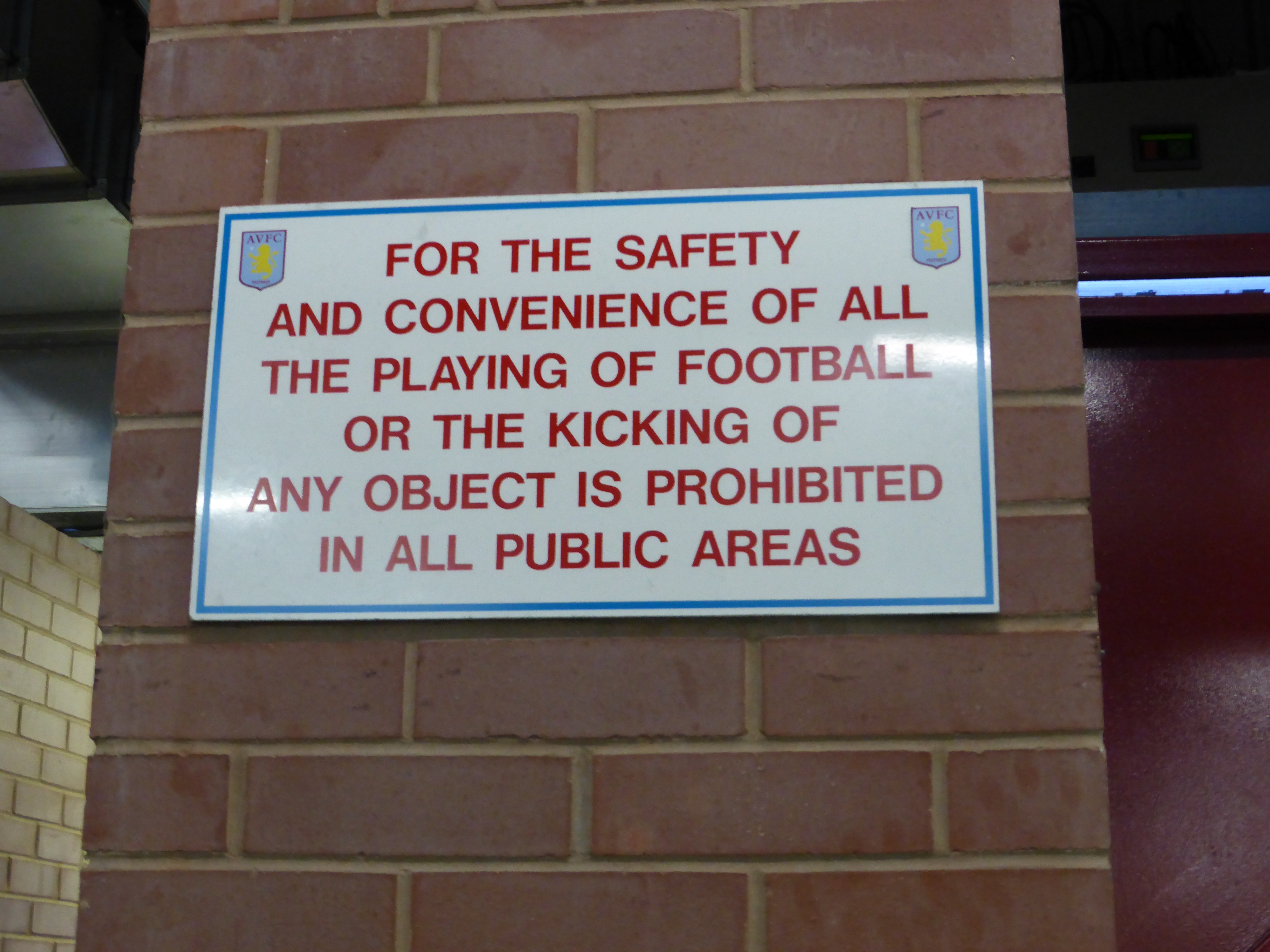 I quite like the concourse inside. Spacious with plenty of catering, reminders of Aston Villas European Cup glory in 1982 – and I really liked the signs prohibiting “all the playing of football” in all public areas. No wonder Villla are struggling at the moment! I get the standard pies that you nowadays find inside most grounds and a pint – and then go to find my seat inside.
