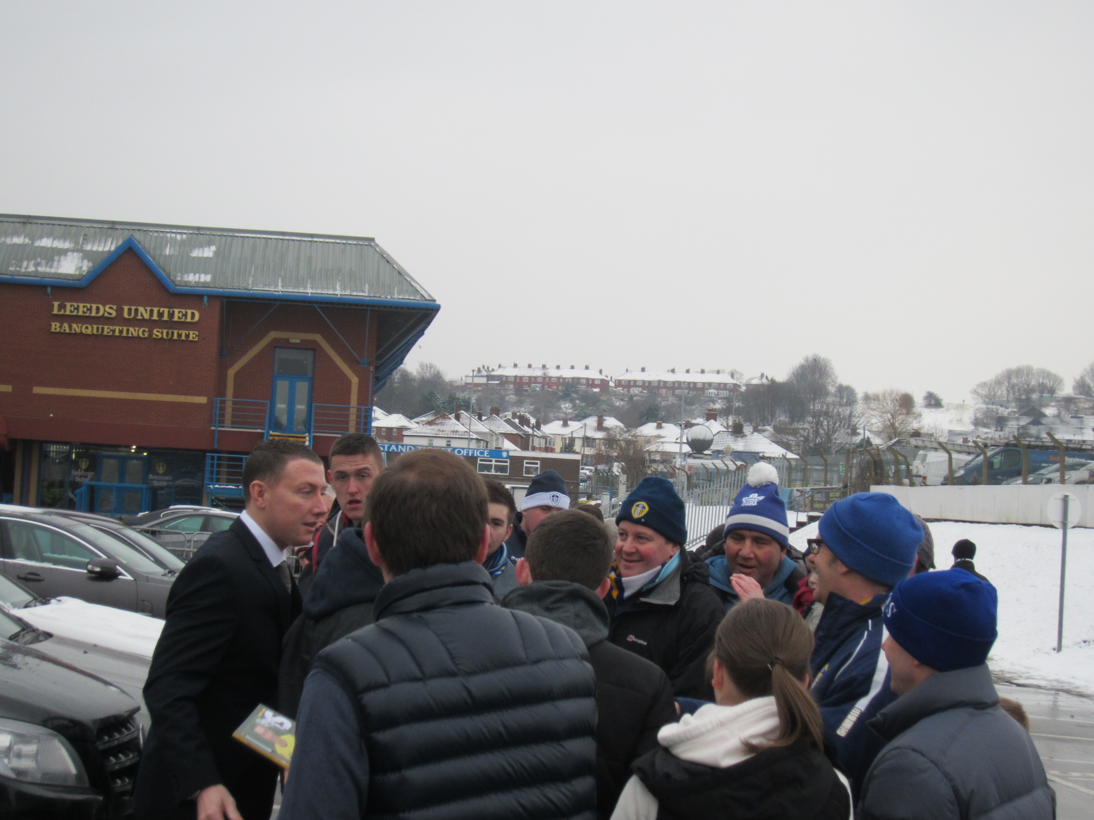 Walking further around the ground, the East Stand looks rather dull and depressing, but outside the John Charles Stand (with an attached hospitality building and ticket office), there is much more life. The coach with Bristol players arrive, and the last few Leeds United players arrive for the match in their cars, stop and sign autographs for the fans. Of course, there are not that many fans waiting for autographs, but nice to see that the players reward those who have braved the weather; that doesn’t happen everywhere.