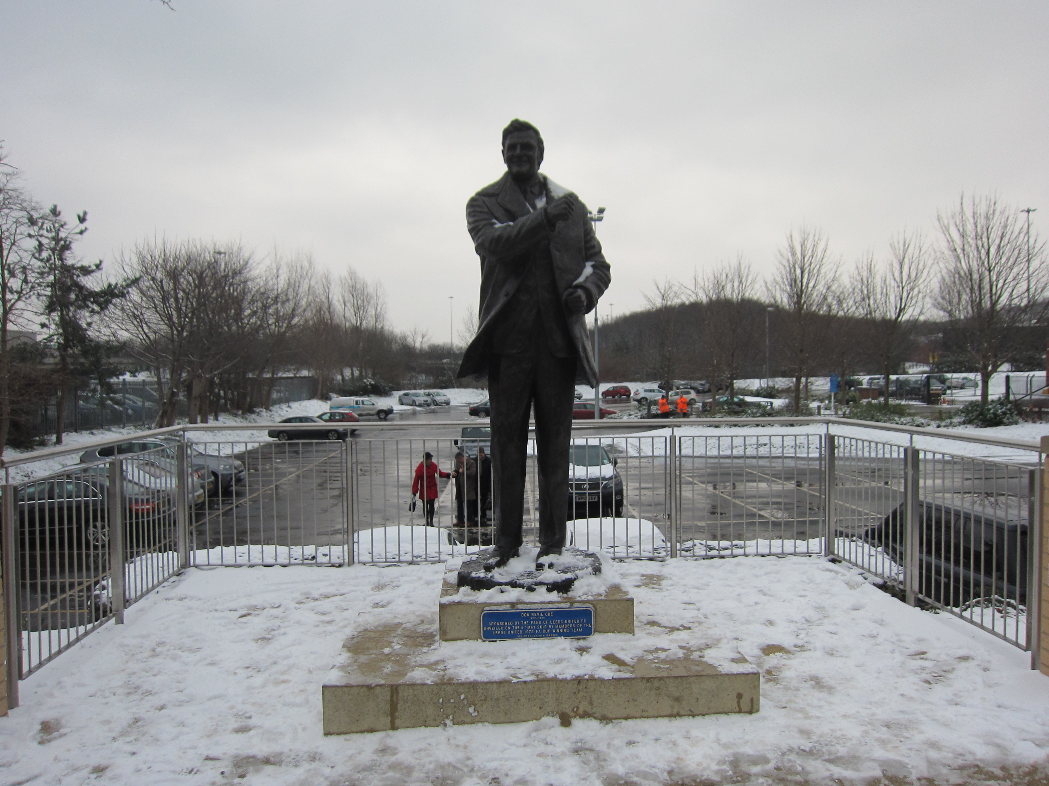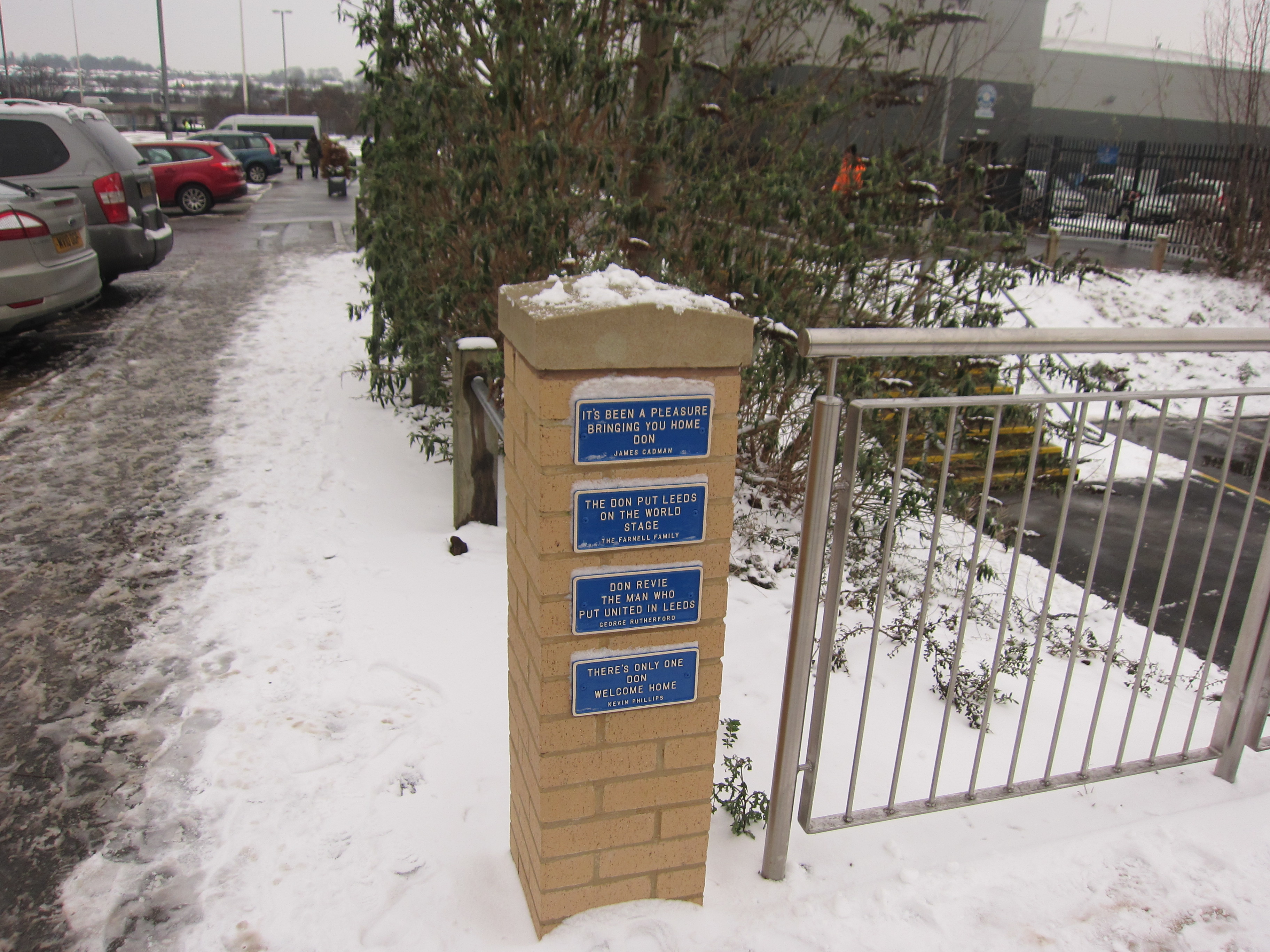 Walking along the East Stand (which contains a nursery), I come to a less prominent statue of Don Revie, surrounded by memorial plates for deceased fans. Covered in snow, it looks rather gloomy, but memorials such as this certainly give stadiums soul and identity.