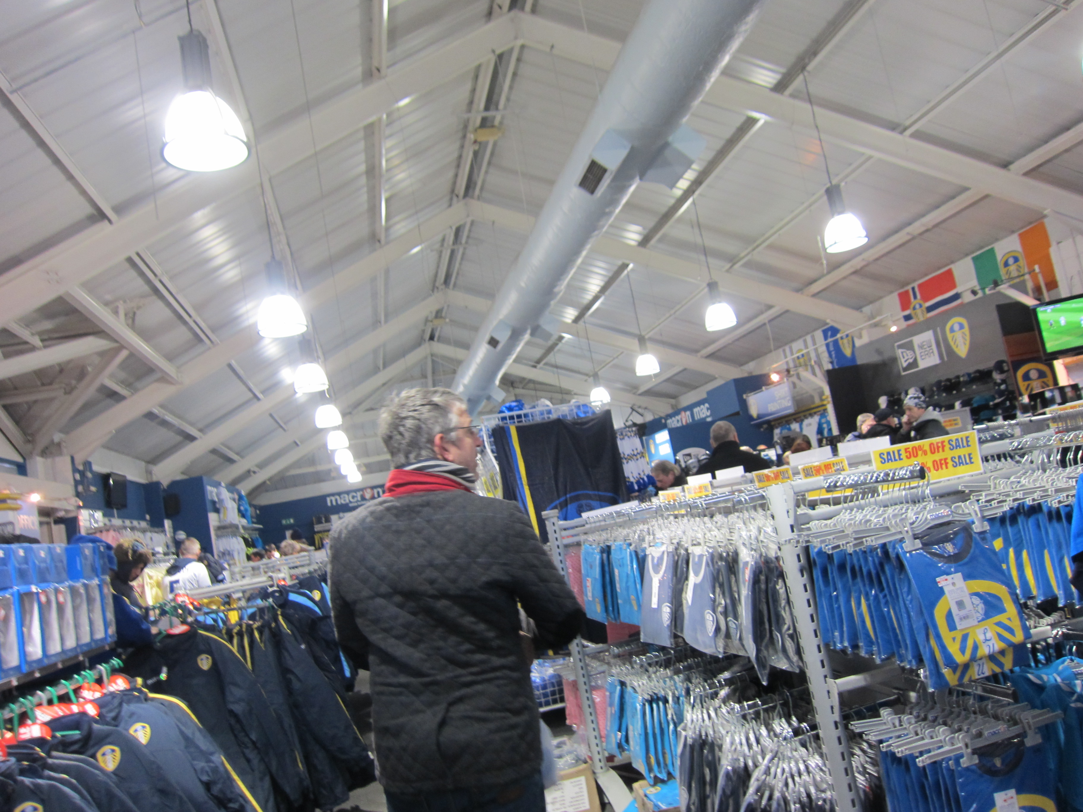The souvenir shop used to be positioned further down Elland Road, but the old building is now standing empty, looking condemned. The new one, on the hand, has a distinct air of “temporary facility”. Still, it is a lot warmer than outside, so I spend some time wandering around looking at books, scarves, shirts etc. Perhaps because fans do not feel tempted to turn up early in the cold, the shop is not particularly busy. Although I spot a few fellow Scandinavians, it also seems pretty local.