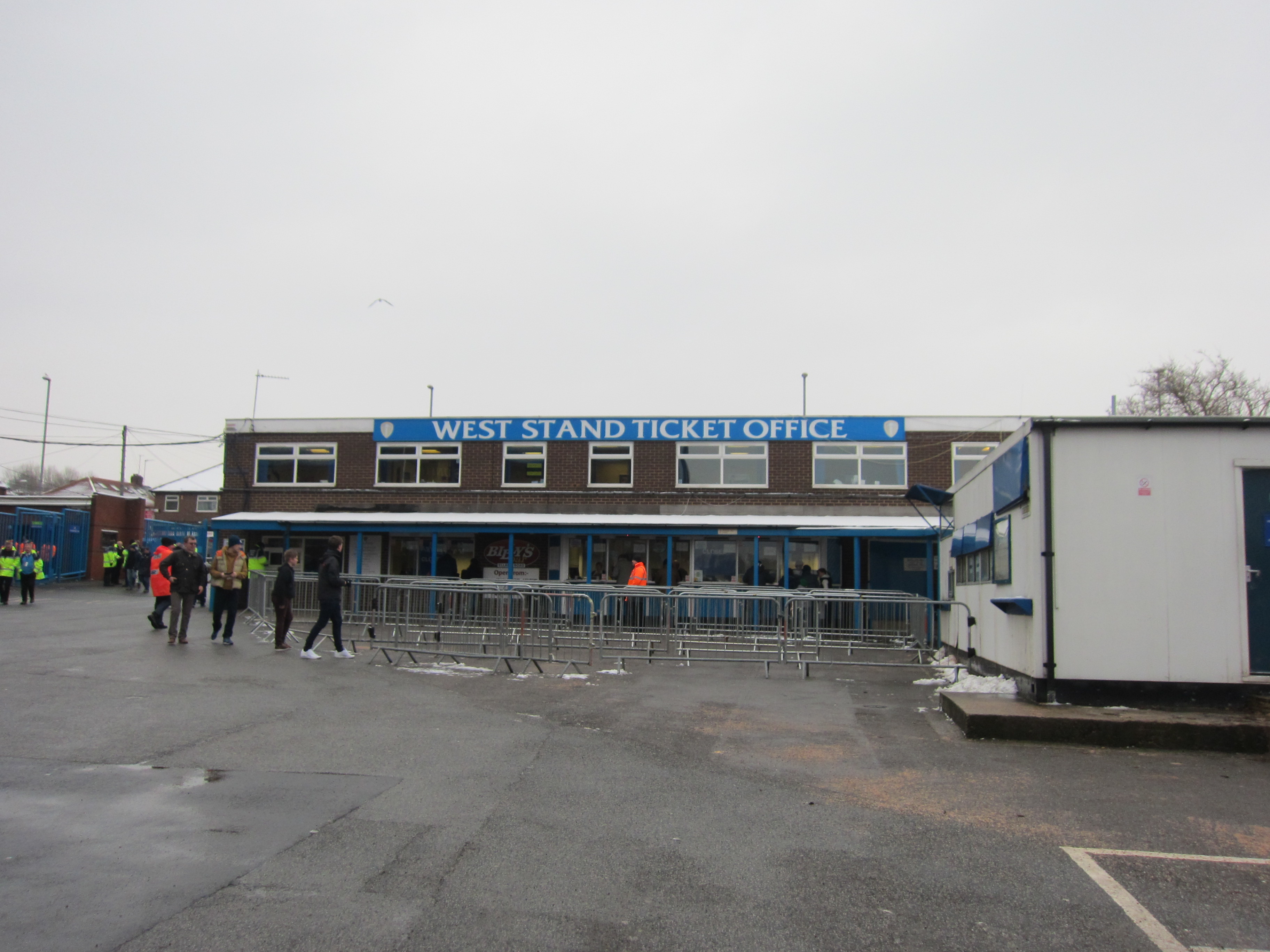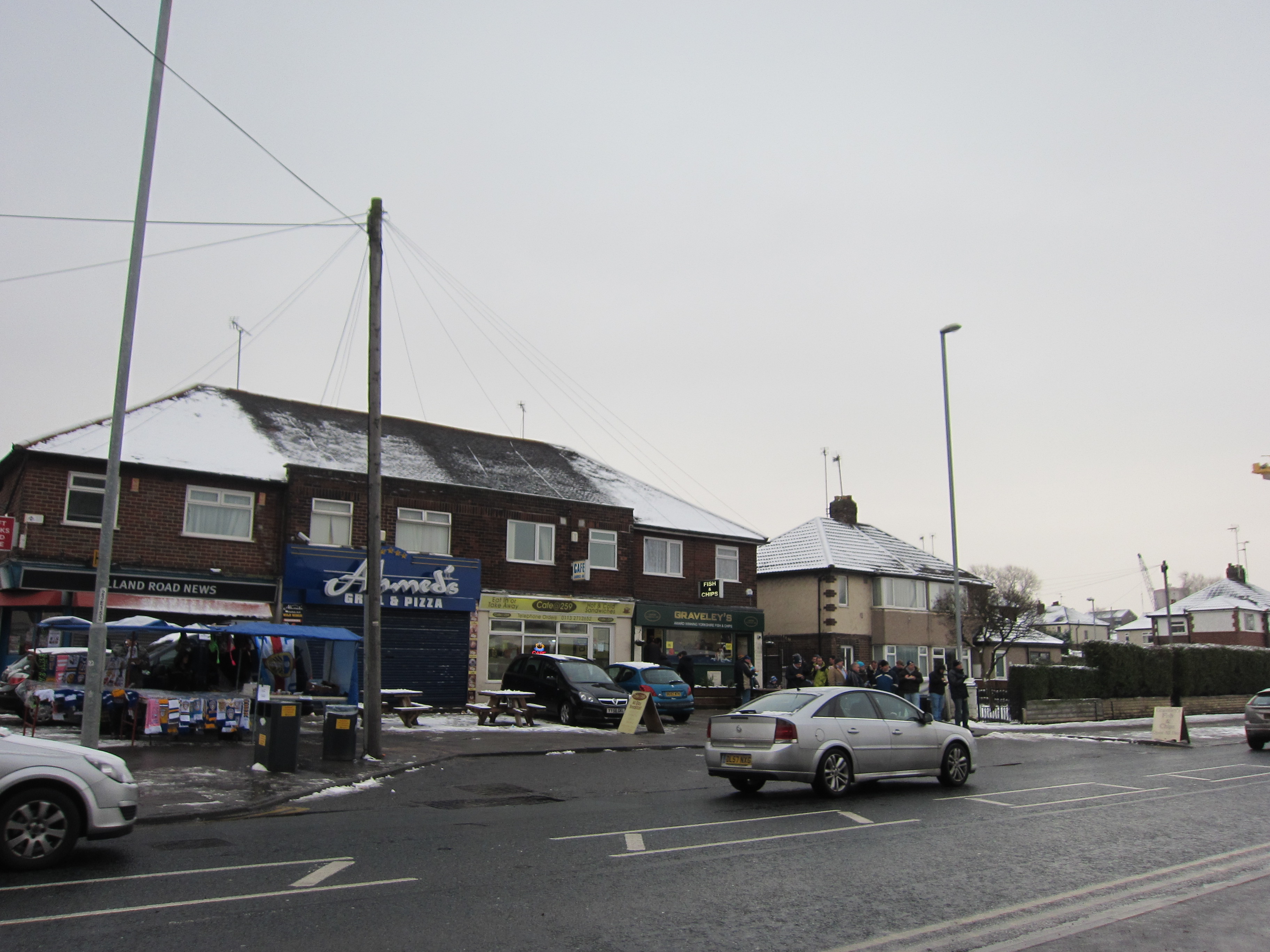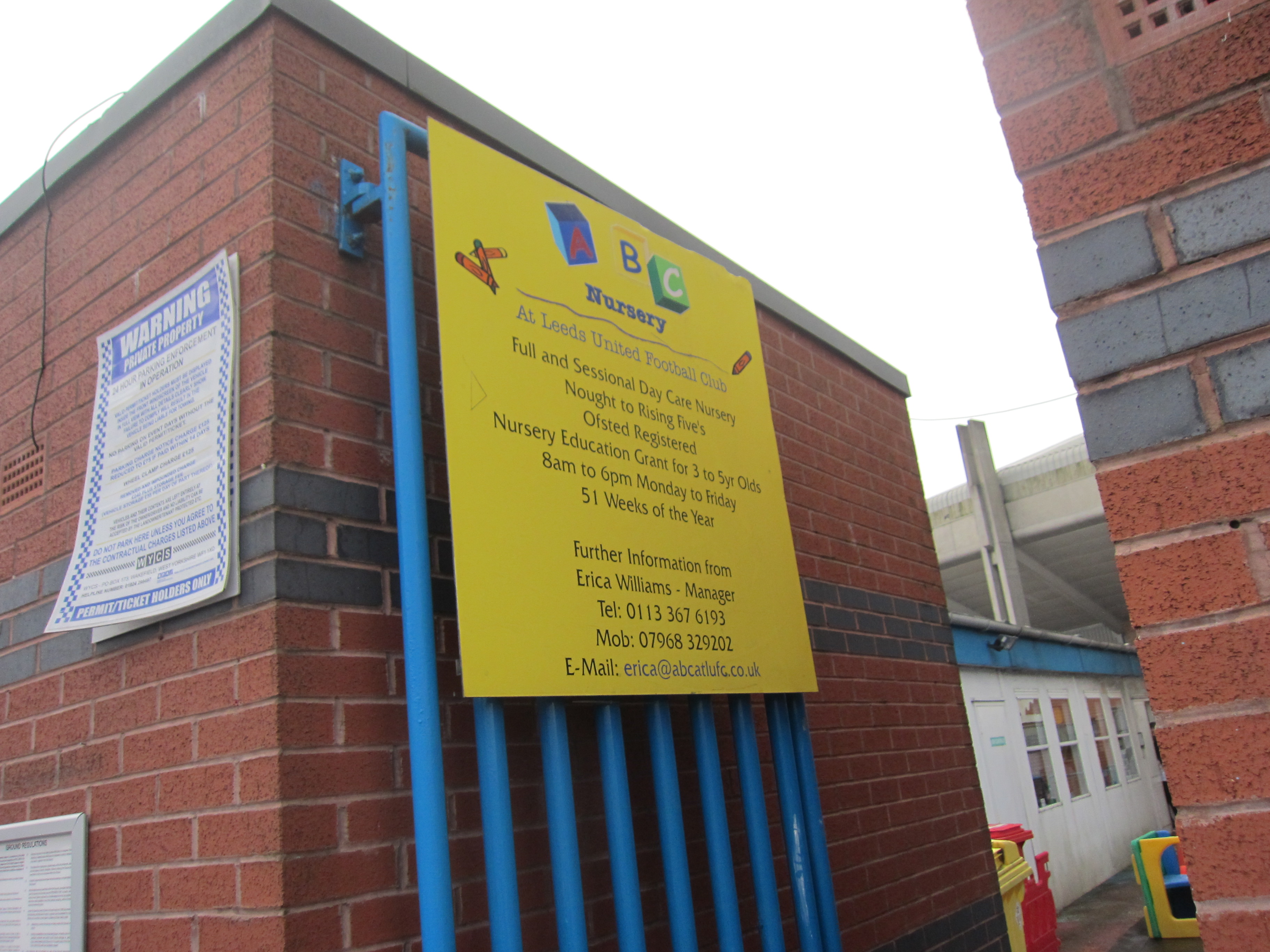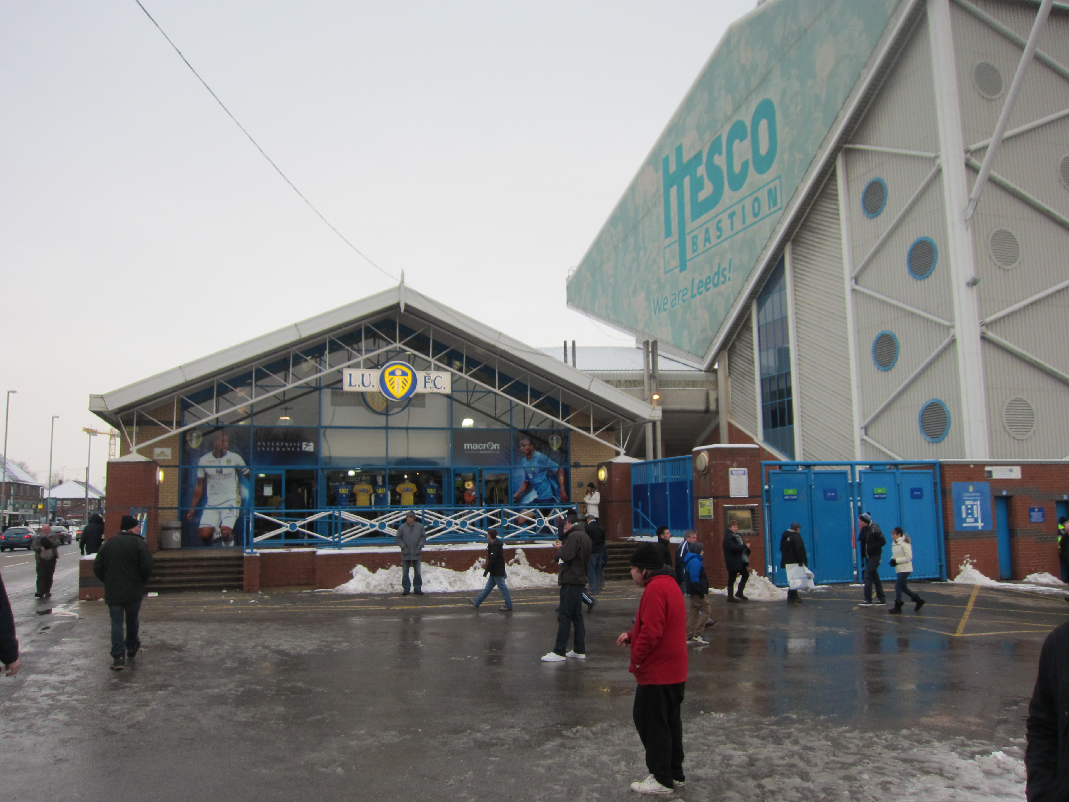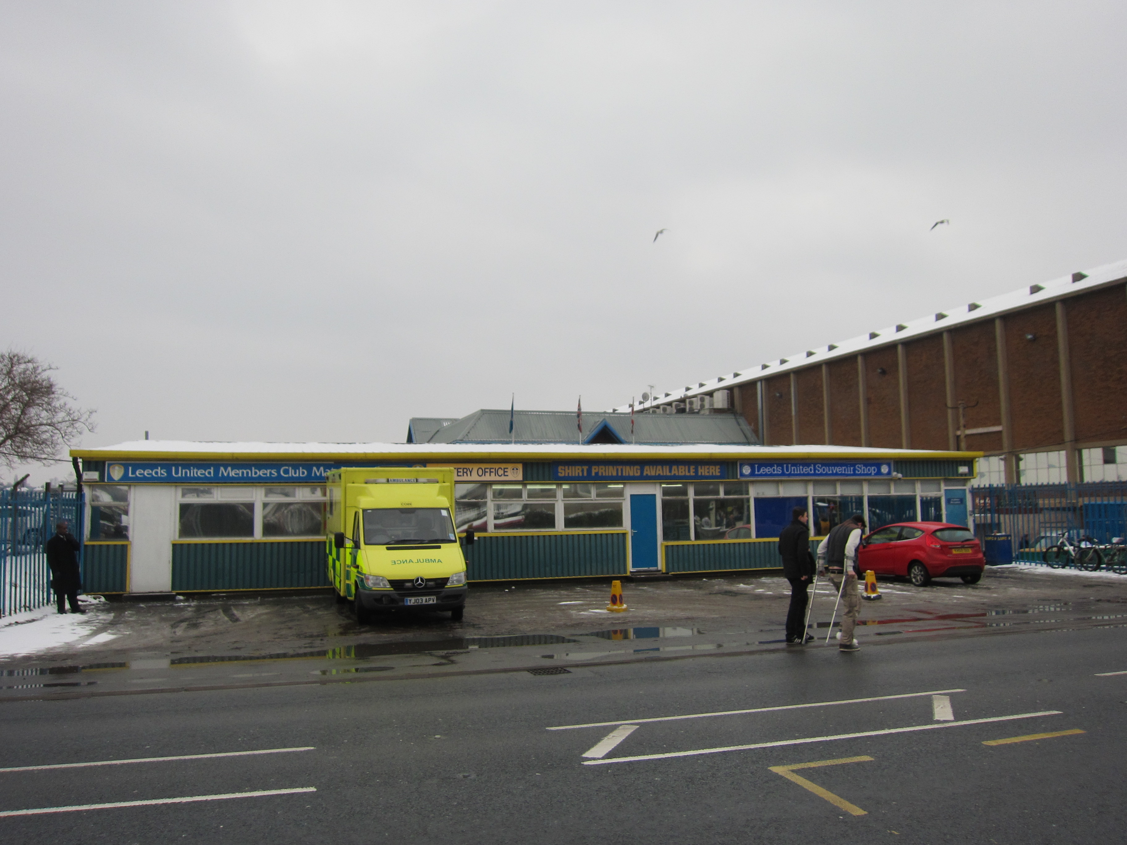 The taxi from the station drops me off by a pub opposite the ground on Elland Road, The Old Peacock. The sloping hill on this side of Elland Road is full of small alleys with terraced housing; whereas industrial plants and the ringroad make the other sides of the ground rather un-welcoming. But on this cold day, even the alleys seem deserted.