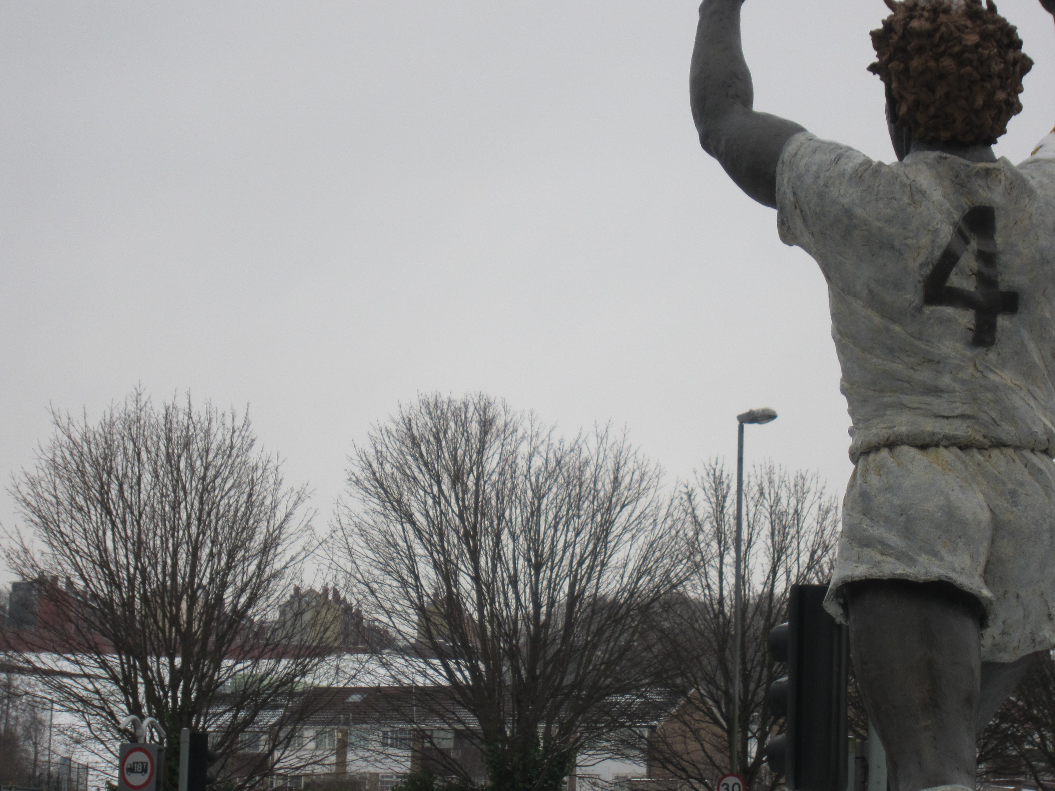 Having had my meal, I take a walk around the ground. The stand-out place is the corner of the South and East Stands which not only feature the clubs souvenir shop but a coloured statue of Billy Bremner with clenched fists, looking towards the terraced housing on the slope across Elland Road. Somebody has wrapped a Leeds scarf around his arm, and there are wreaths on front of the statue.