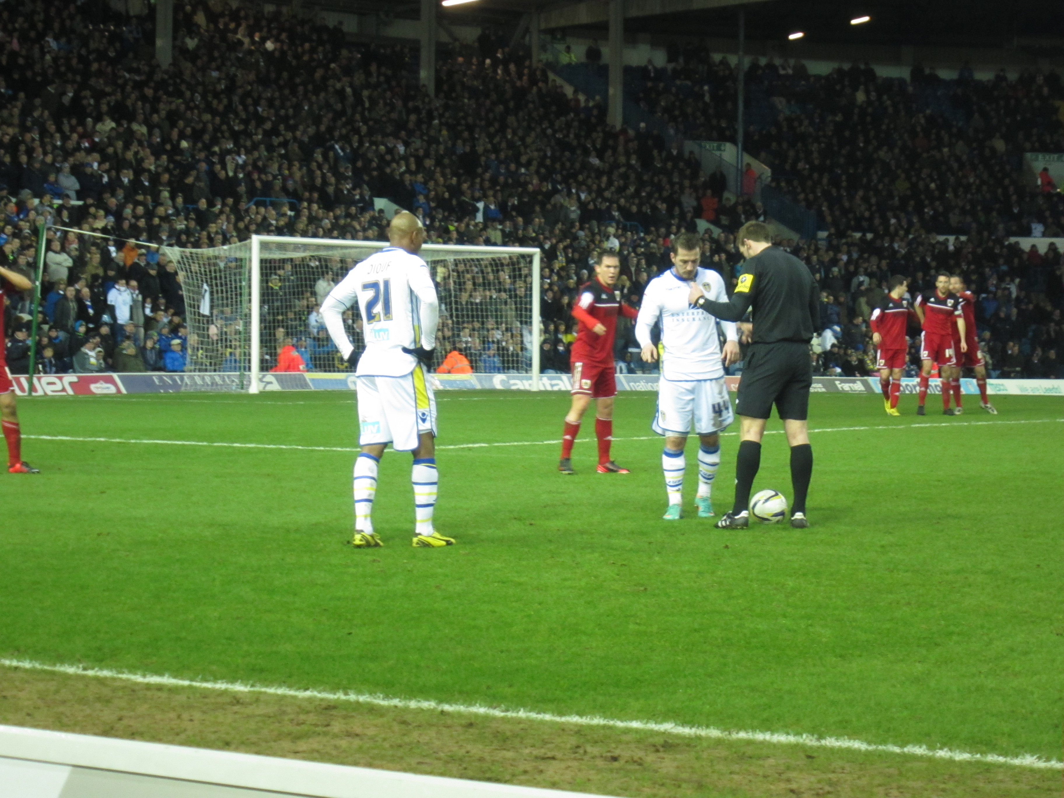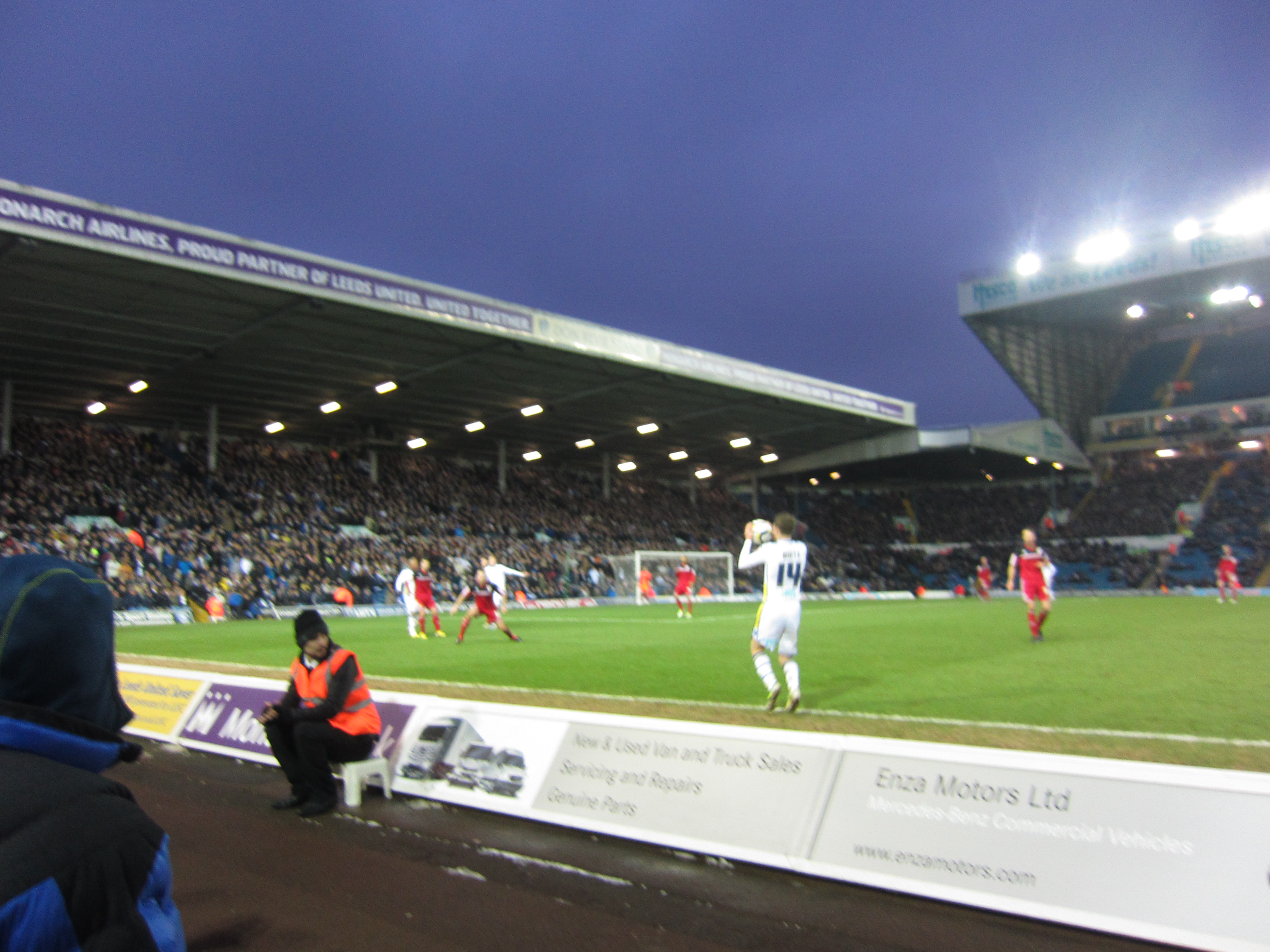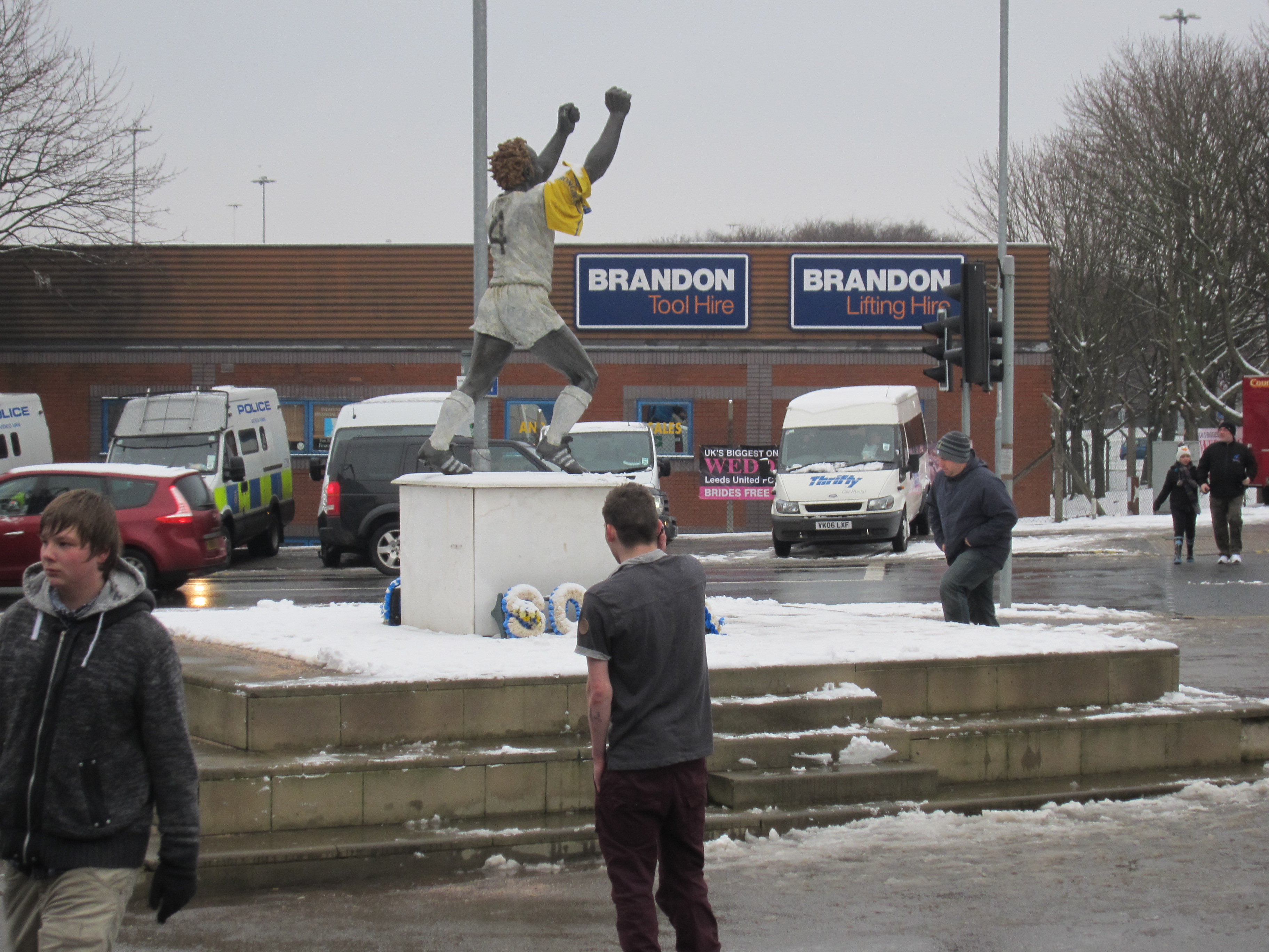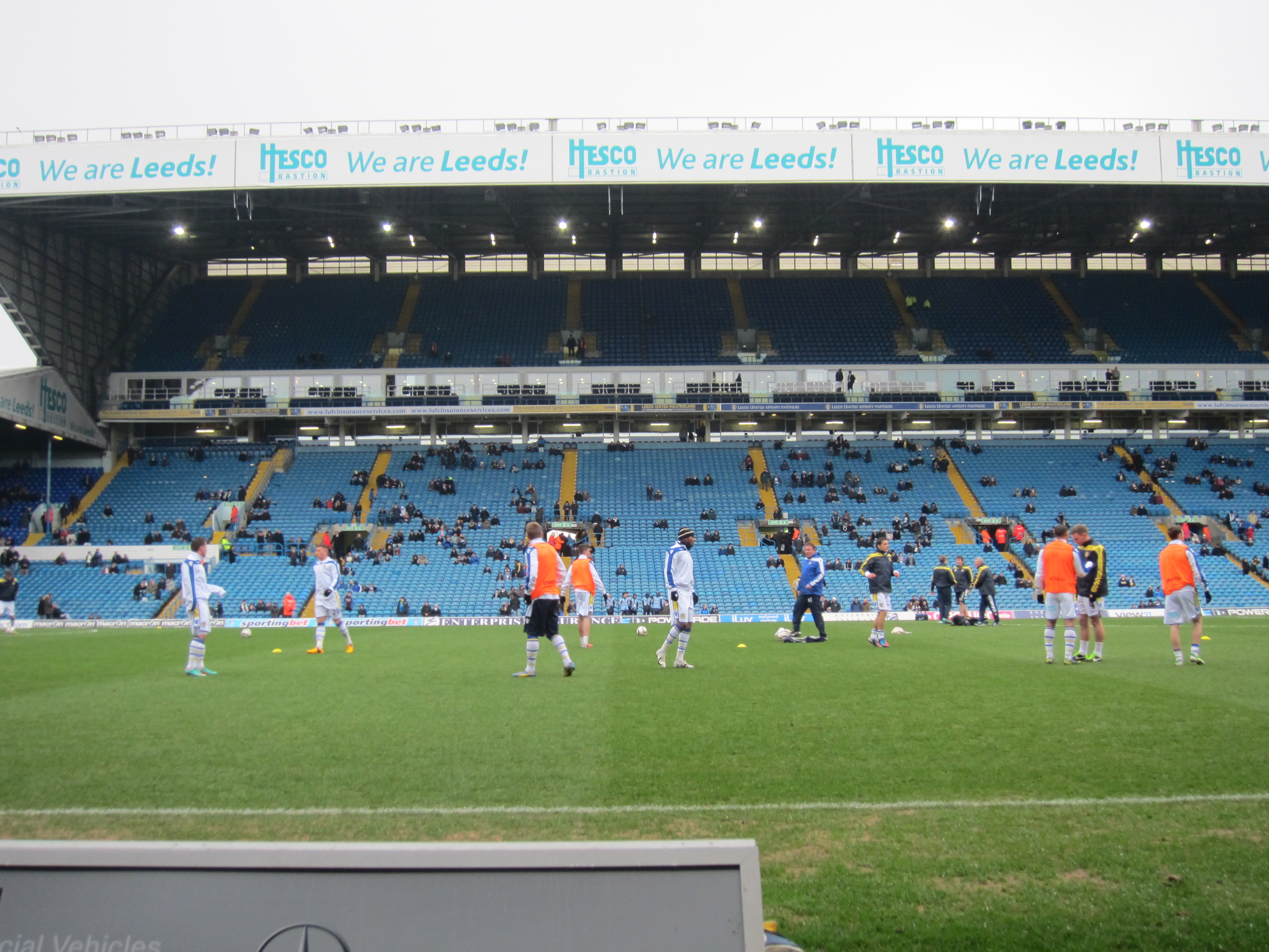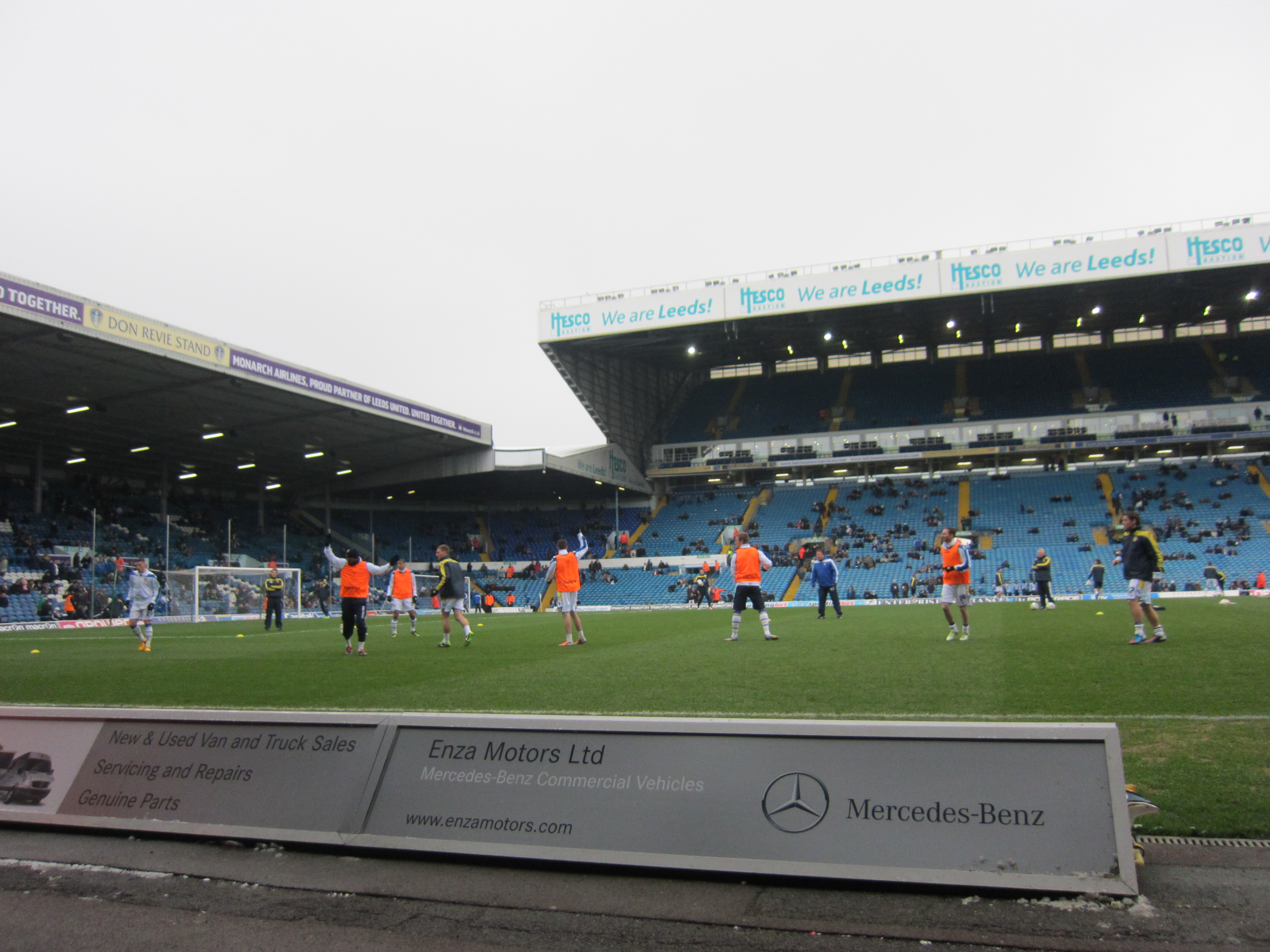 I get a text from Layla that she is on her way, and we meet by the Billy Bremner Statue before making our way back to the John Charles Stand. We head straight for our seats, front row near the half way line. The Leeds players do their warm-up routine right in front of us. There is a strangely subdued atmosphere. A lot of people have stayed away because of the weather, most of the people who have turned up stay inside the stand for a drink even longer than usual; and those who have entered the stands are concentrating on keeping warm.