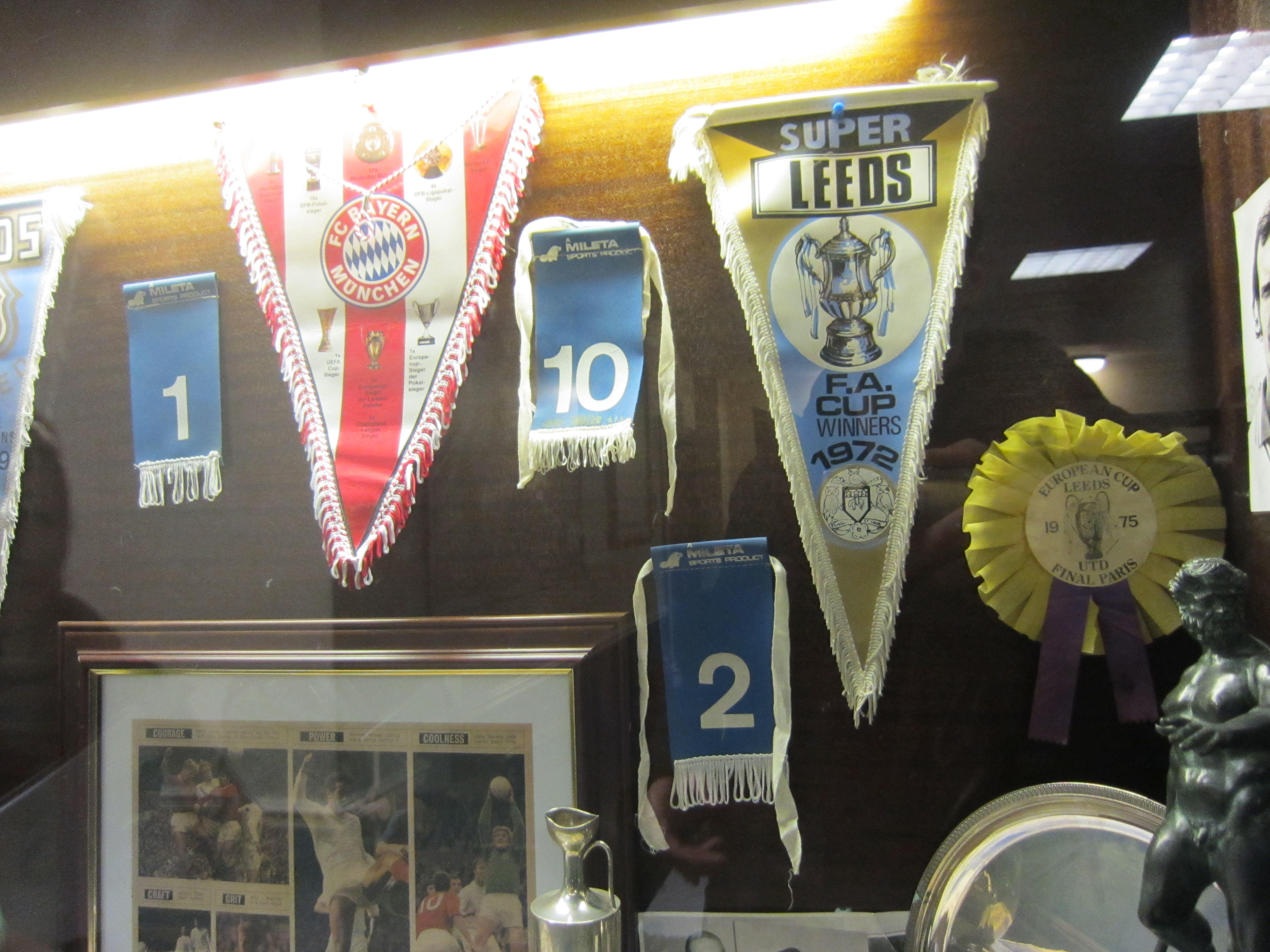 The rooms are rather small, the corridors narrow, the showcases crammed into them are stuffed with objects. Lots of trophies. Presents from teams abroad. Autographed shirts and international caps. Old photos and newspaper cuttings, matchday pennants as well as souvenir pennants and rosettes from the 70’s, the classic stocking numbers worn by Leeds in the 70’s, matchday programes, old boots and footballs. You keep coming across stuff related to Don Revie, Billy Bremner, Paul Reaney, Jack Charlton etc. It is, in a sense, quite fitting that the suites and lounges have the same 70’ish atmosphere, rather than being open spaces in a modern stand with a lot of steel and glass around.