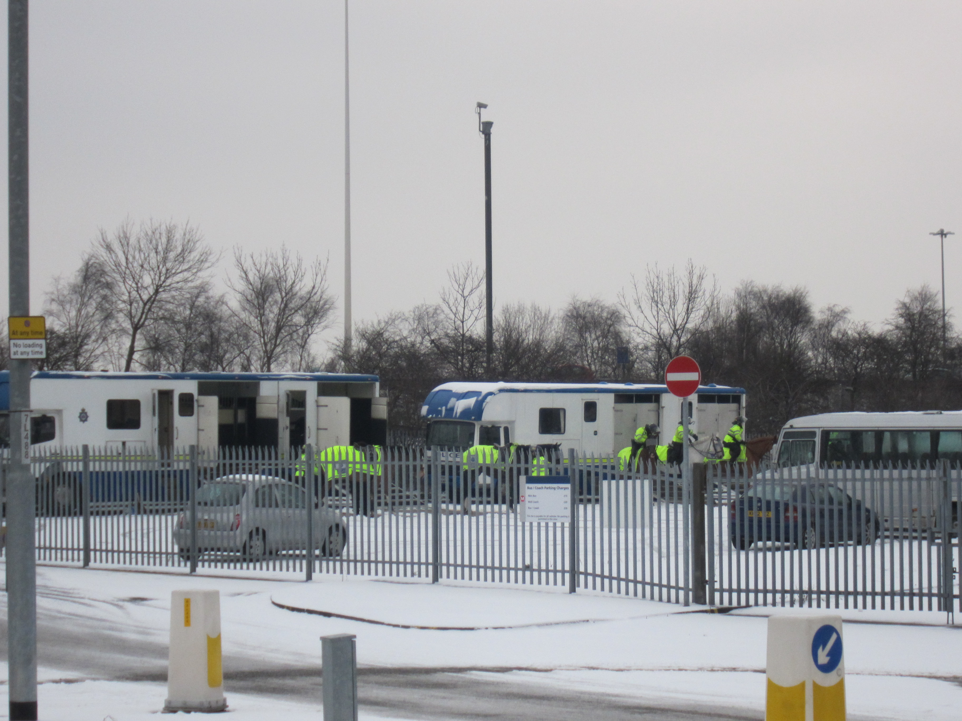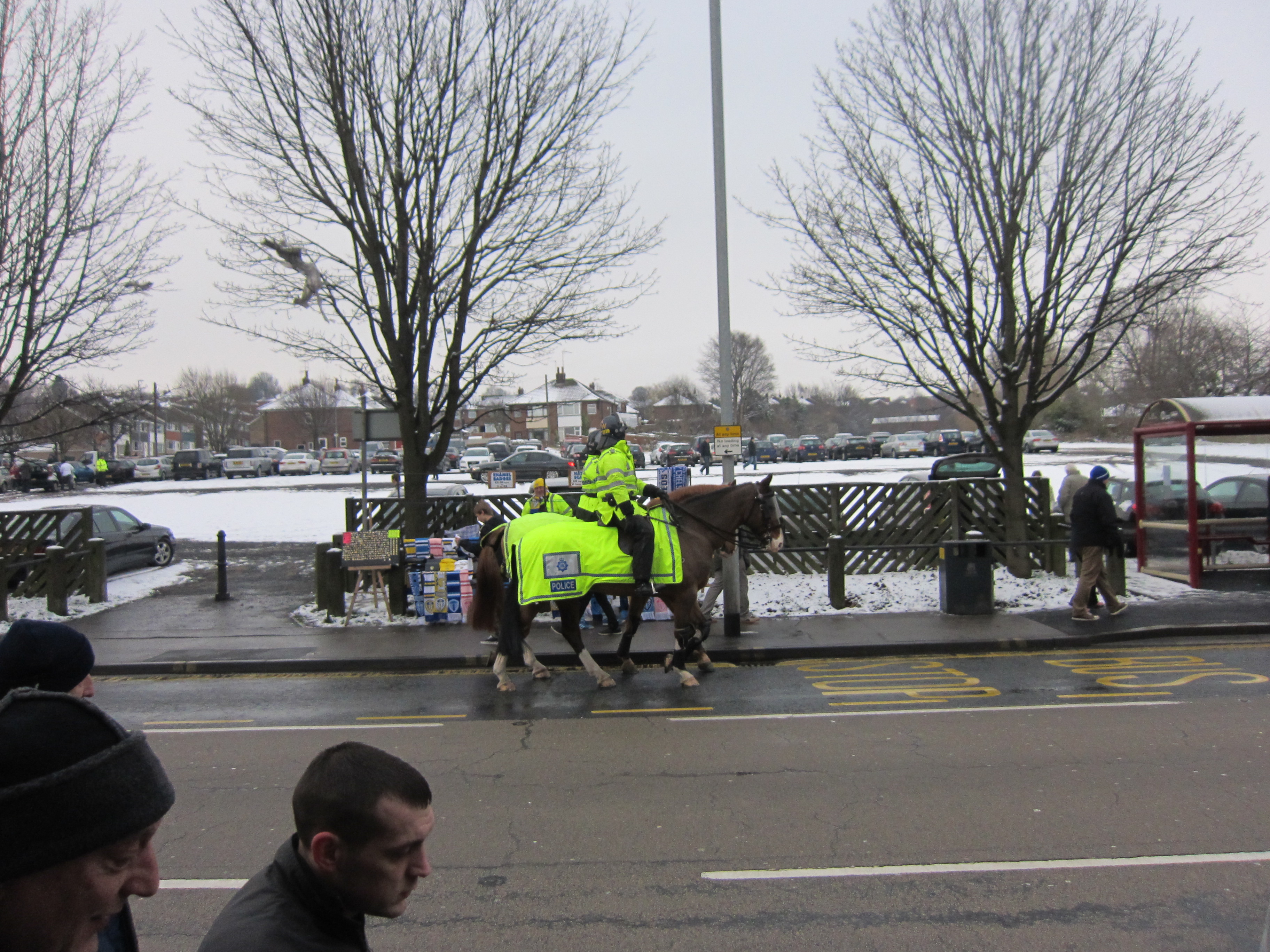 Although there are very few Bristol City fans, who have braved the weather, the police is still present in numbers, as they always are. They seem to have their headquarters by the East Stand.