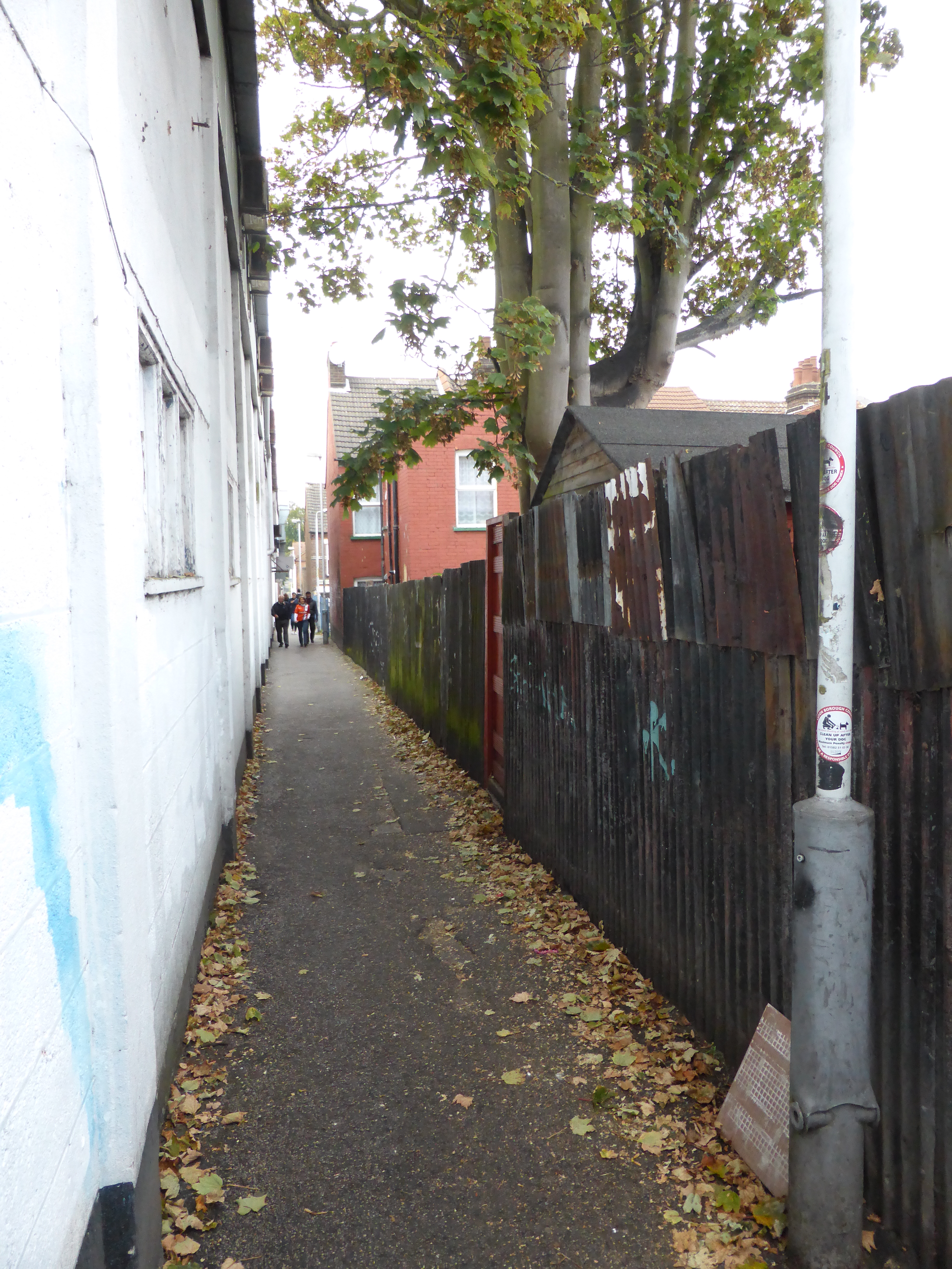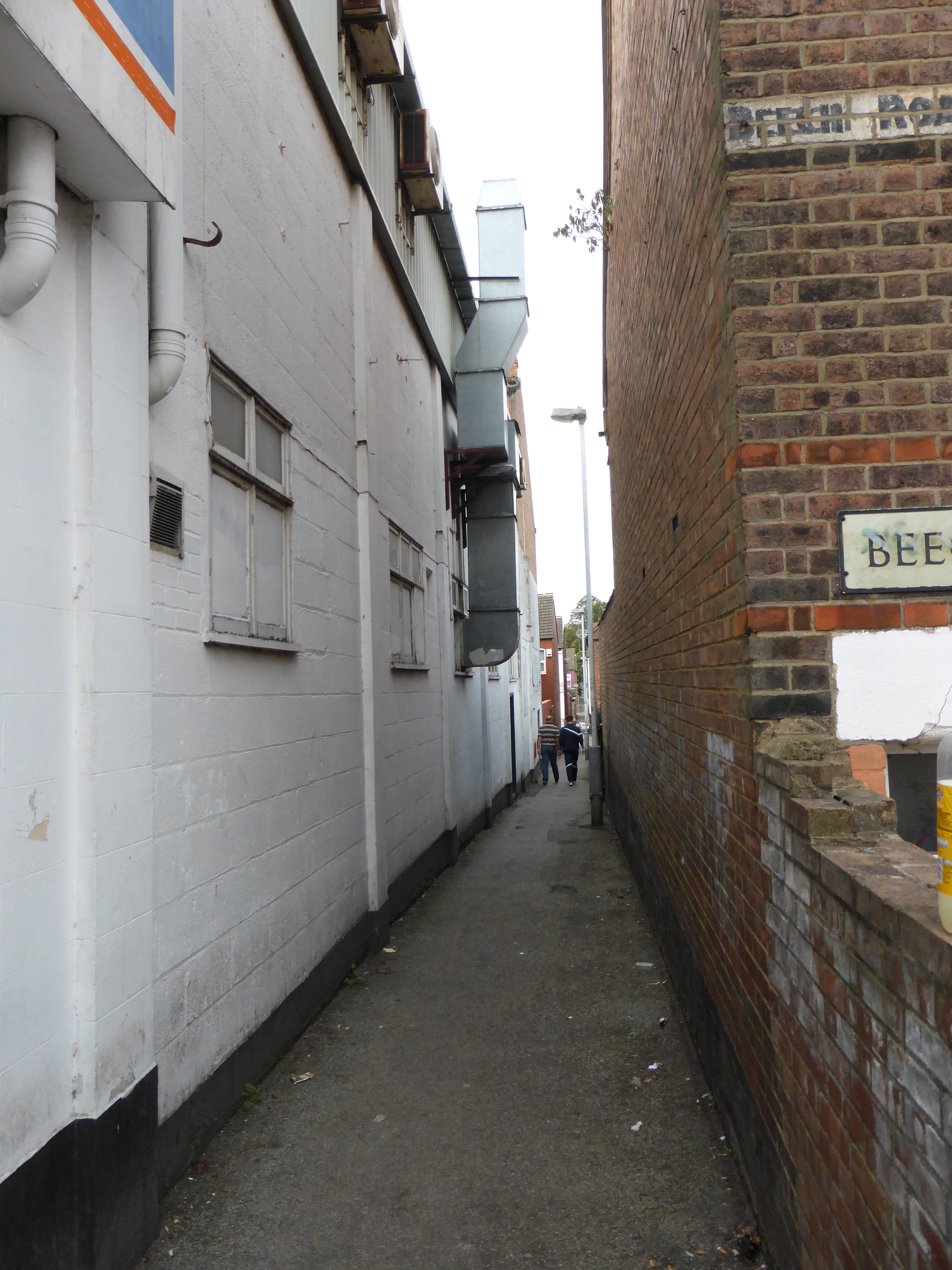 In some ways, it is almost reminiscent of walking the tiny alleys in Venice. In other ways, the grim passage could hardly contrast more to the romance of Venice. Intermittently, the passage is opened by adjacent roads leading up to it. Here you can get a view of the stand – and see that netting has been suspended between the floodlight pylons to stop wayward footballs to be lost in the streets and gardens behind the stand.