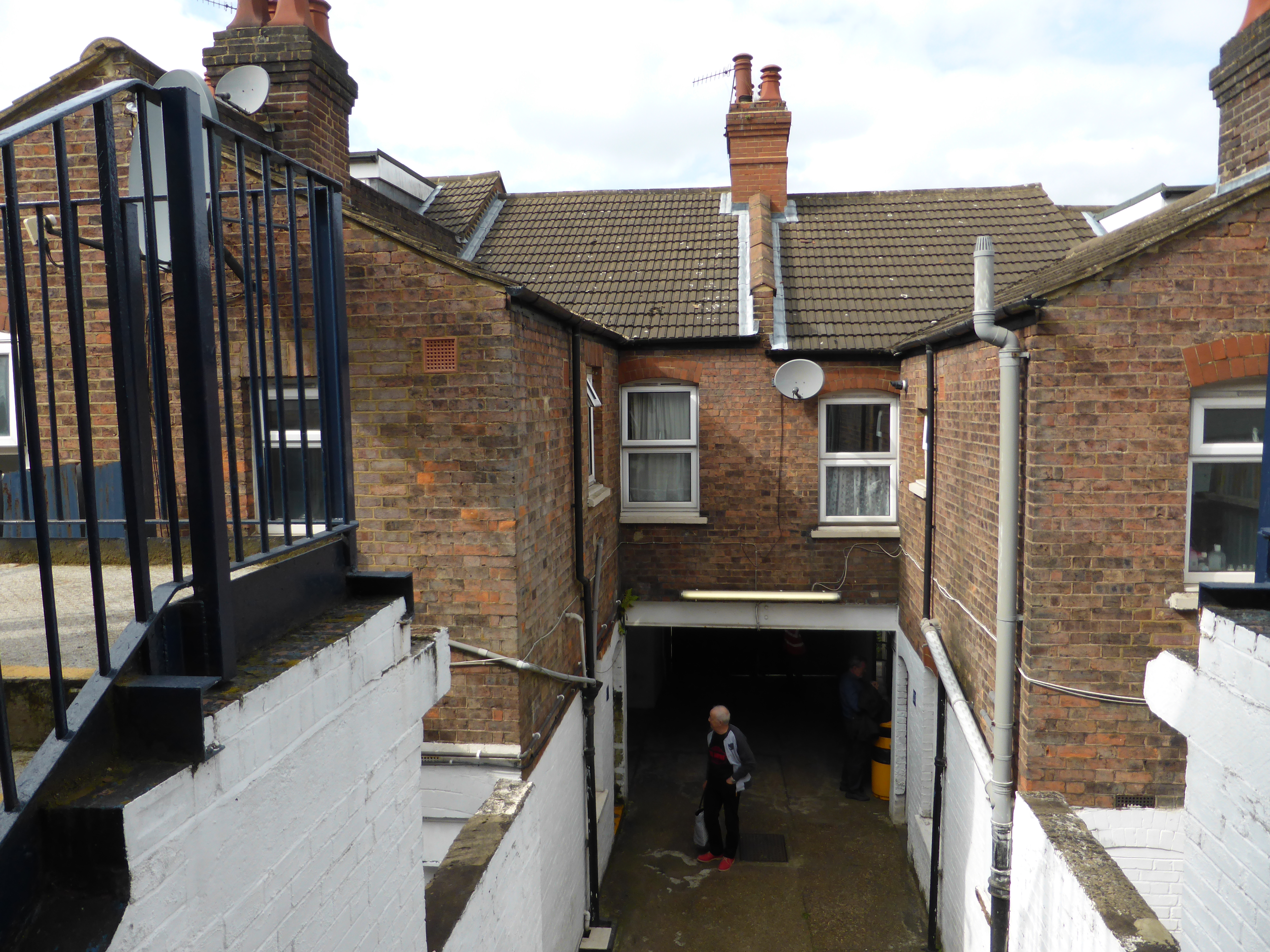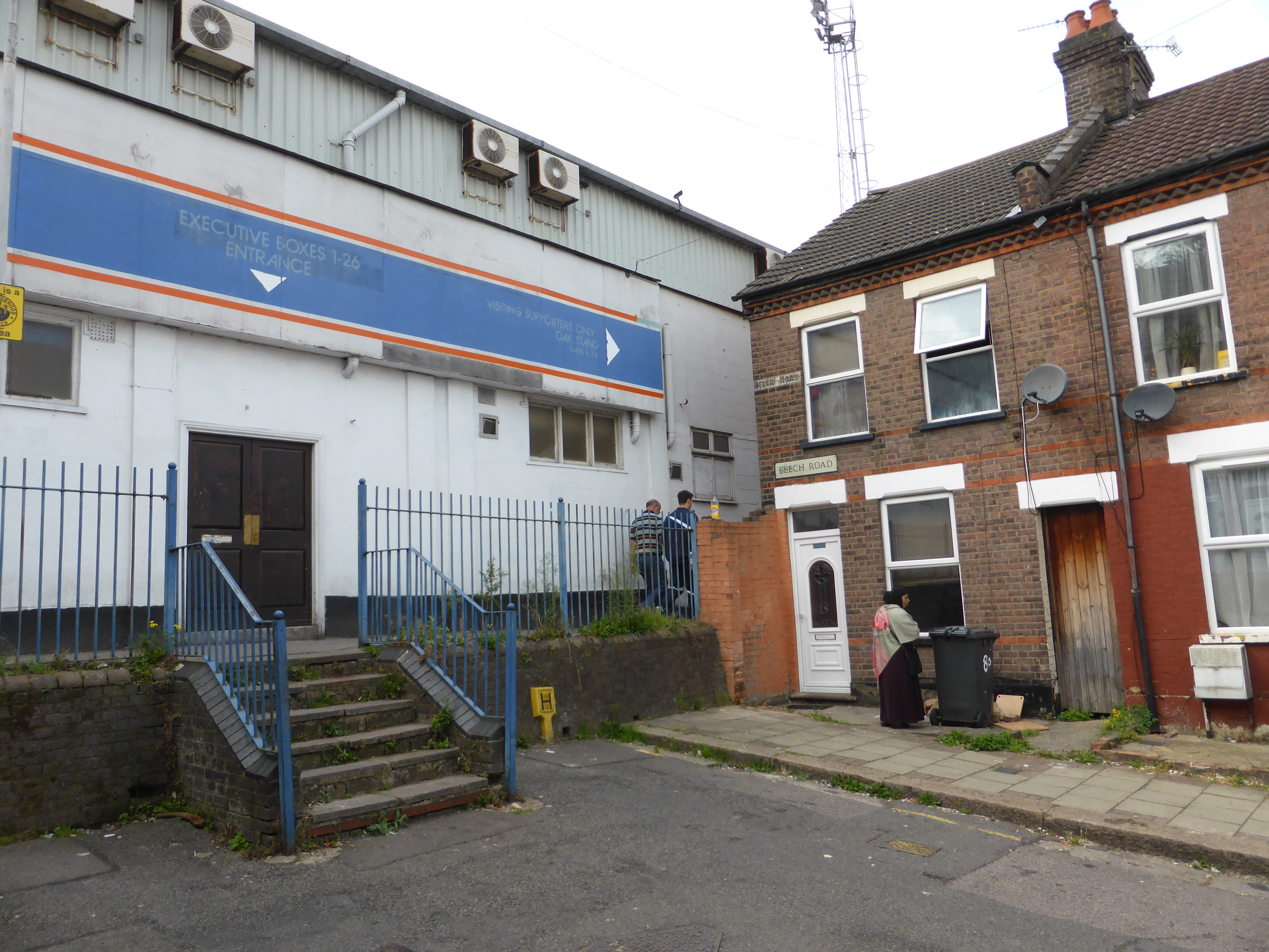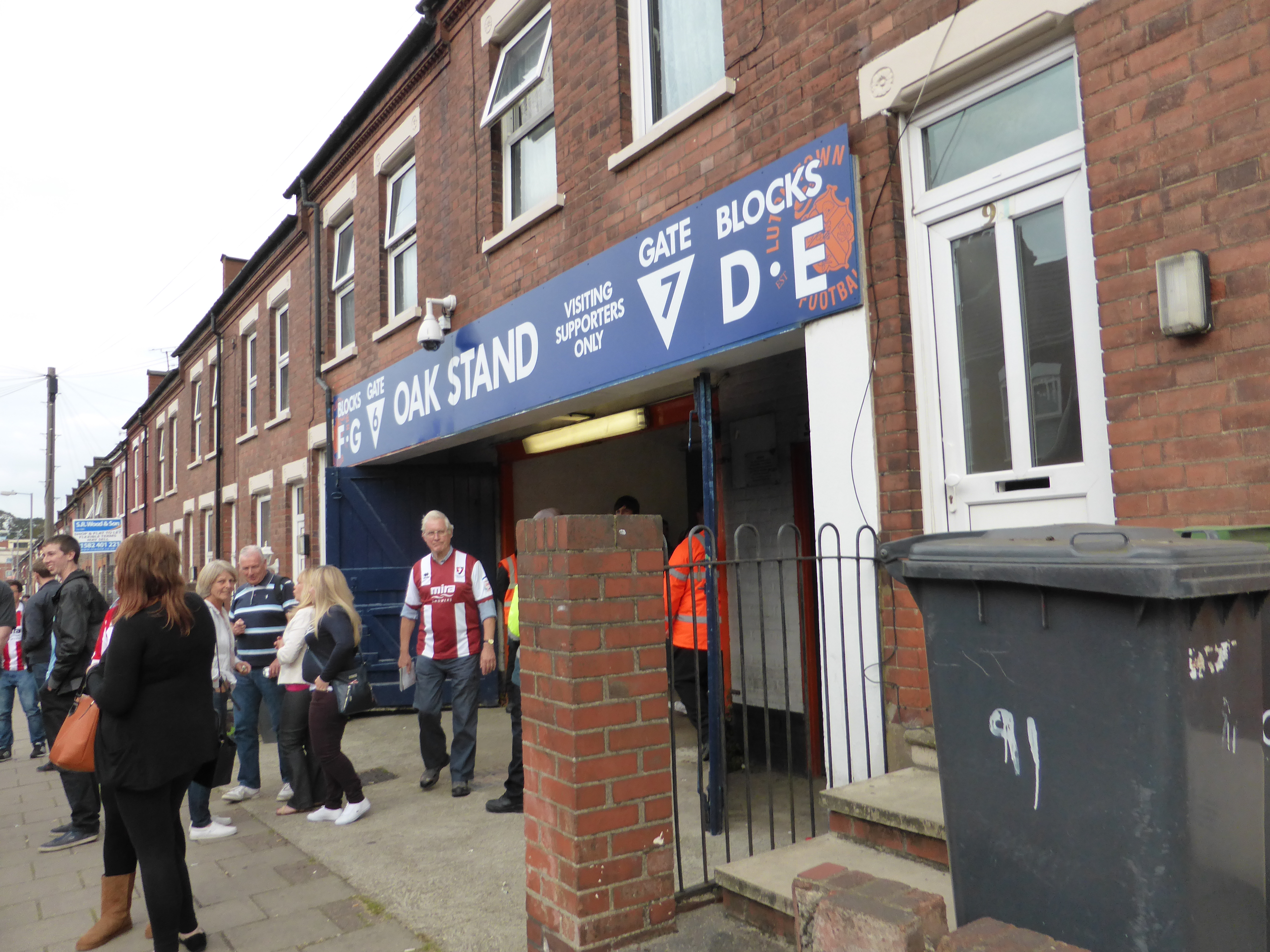 The passage leads to Oak Road – and it is here that the two entrances for away fans go through the terraced housing. As I get there, two coaches with Cheltenham fans arrive. It is only the away supporters who enter through the houses, although the Luton supporters also have an entrance for their “Bobbers club”.