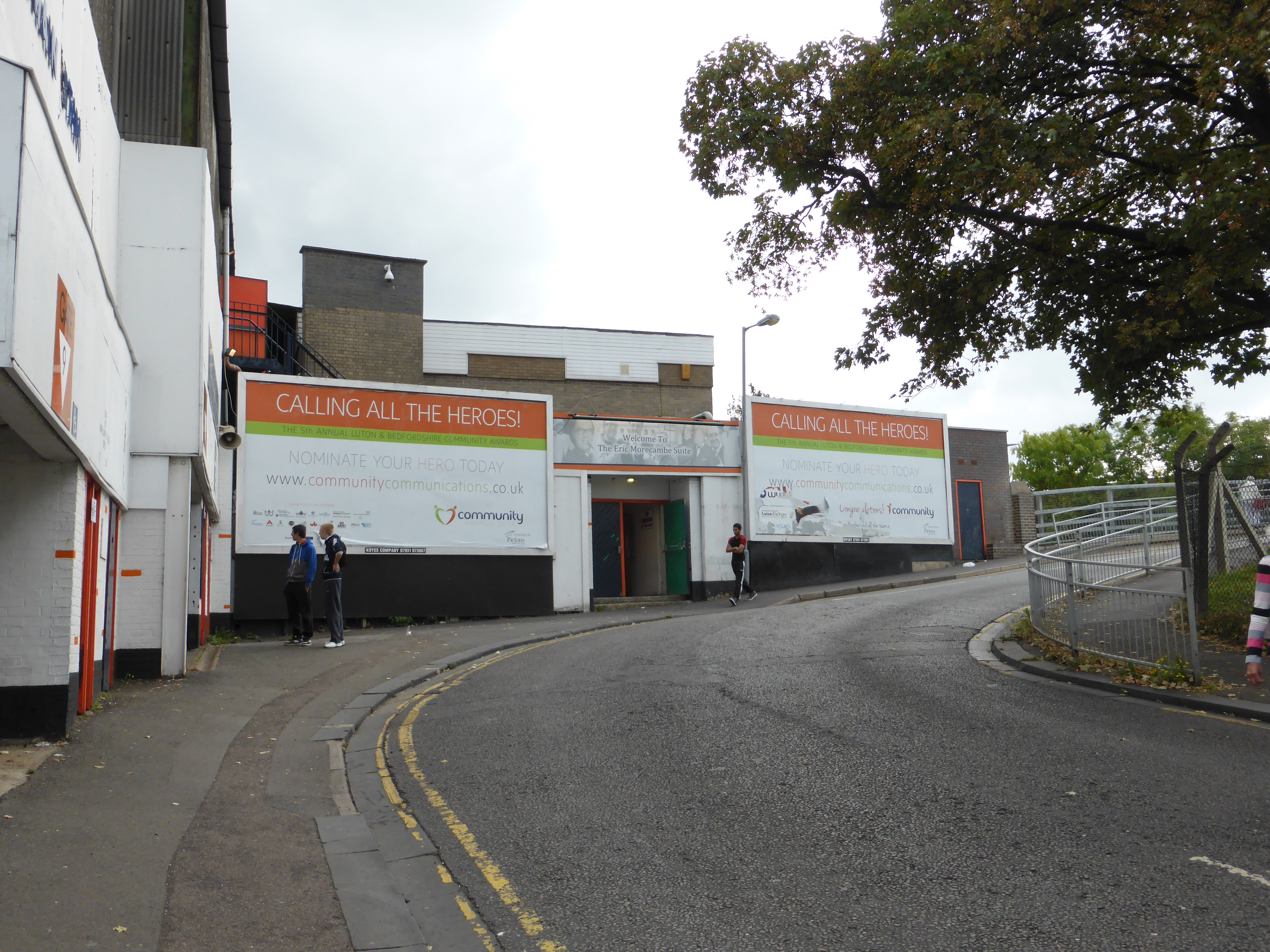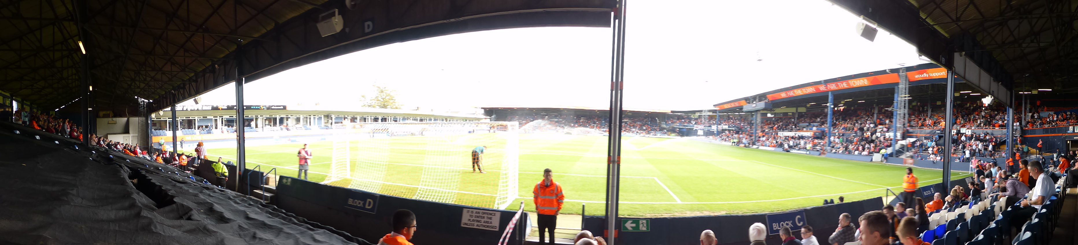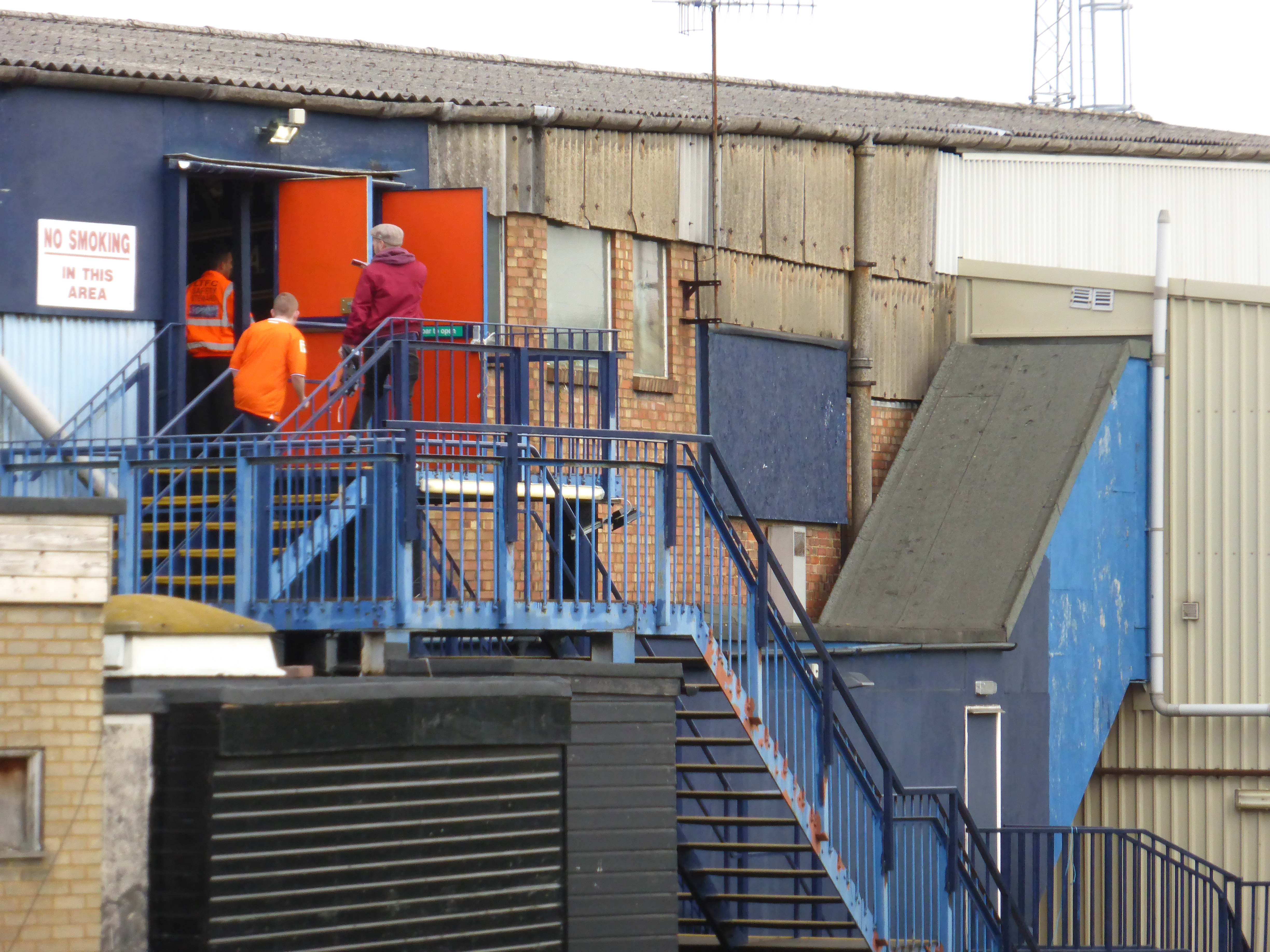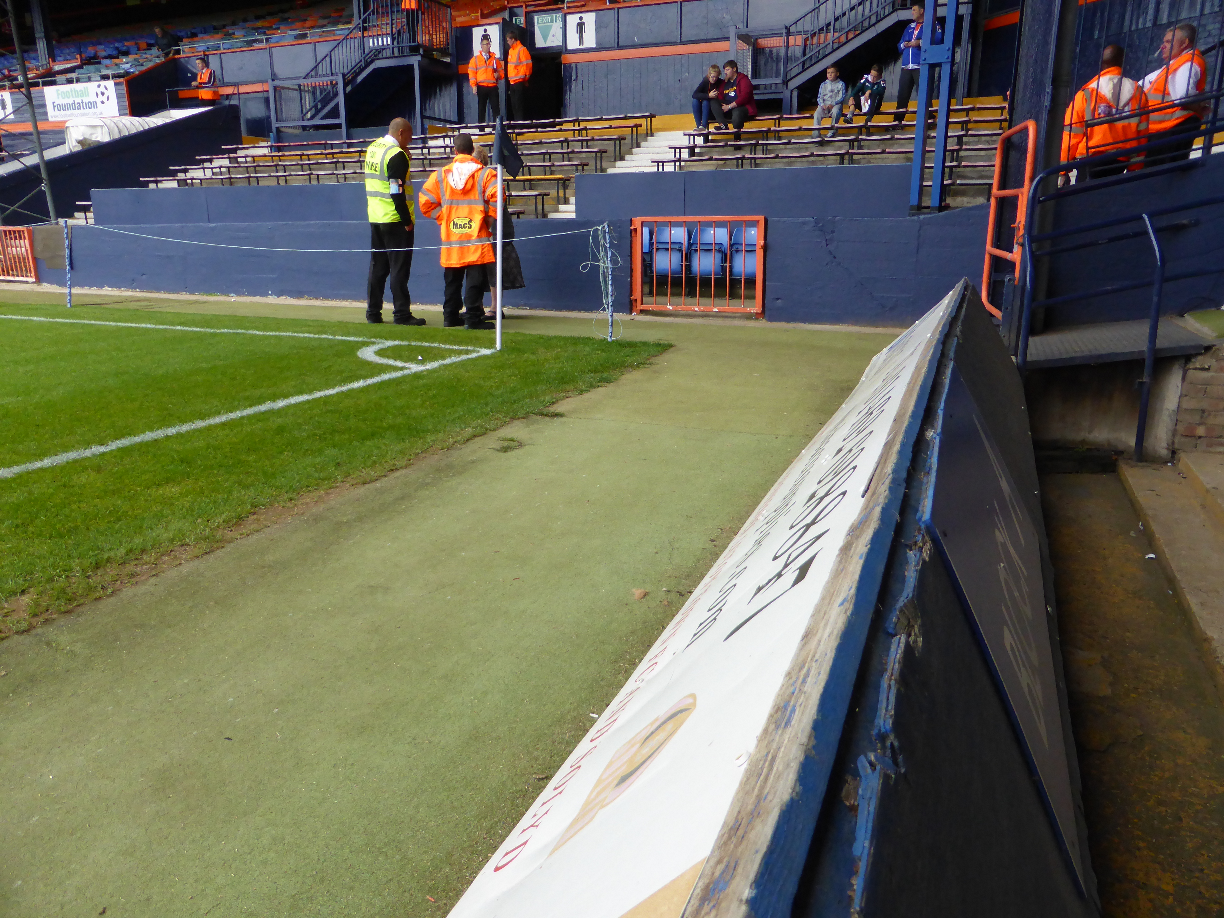 I do not really fancy “Hungry Harrys” burgers, and make my way round the ground, hoping to come across a better offer. The Kenilworth Road end is the only fully accessible stand in the ground. The main stand to the left of it, with the oddly added David Preece stand in the corner, is cut off by a tram way. Hence the need to enter it through one of the end-terraces. On the other side, what used to be “The Bobbers’ Stand” is now only tiny executive boxes, each with two rows of seating attached to it. A one meter broad passage leads along this stand.