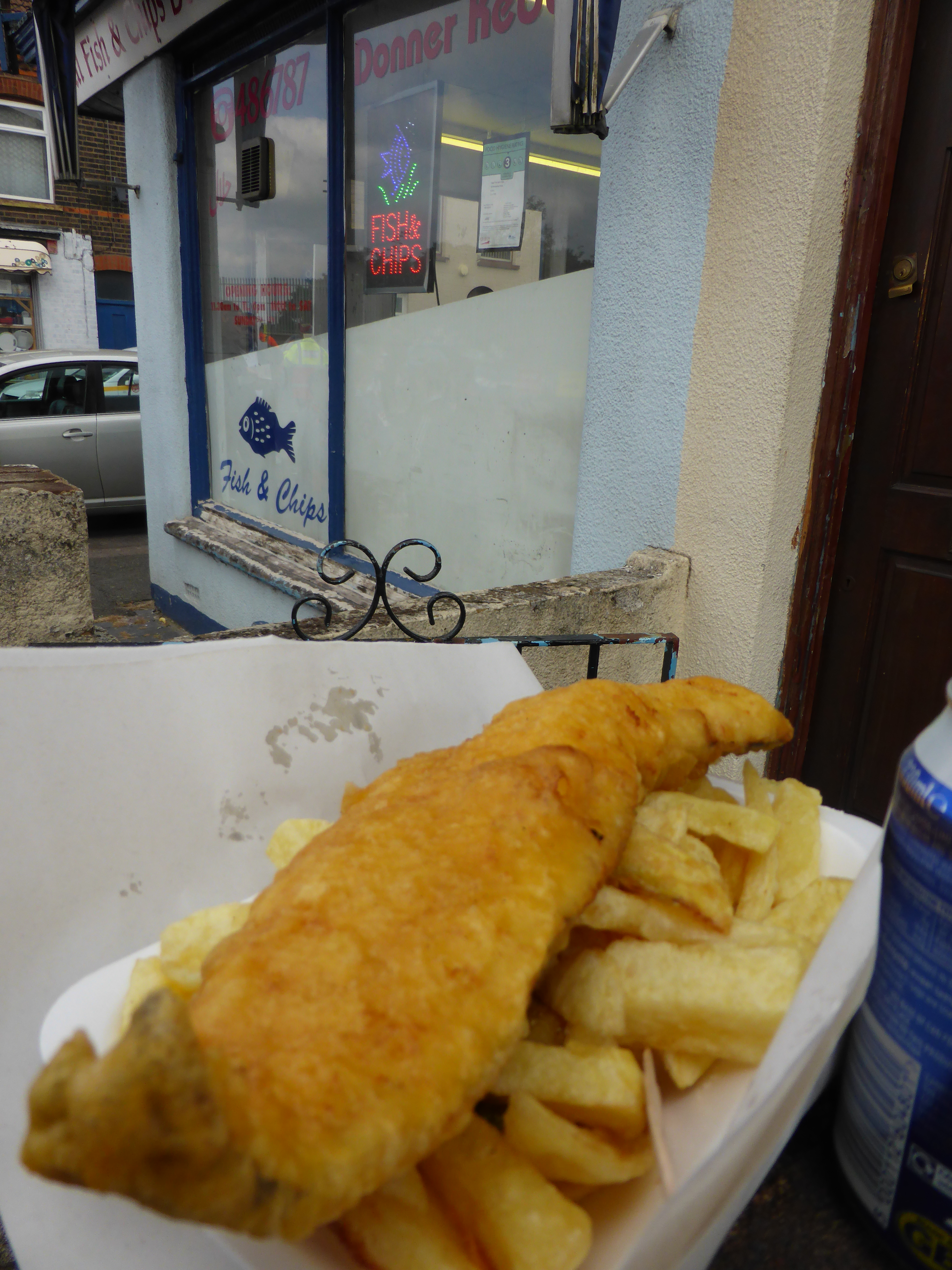 Right now, I am chasing my pre-match meal. I hear a local guy telling some visiting supporters that there is a chippy across the bridge. So I cross the tramway and the road – and sure, there is a chippy, a Doner Kebab chippy. According to the sign in the window, it has got a food hygiene rating of 3 out of 5. Perhaps not enough to attract visitors from afar, but enough to make me dare take my fish ‘n chips here. A group of young boys with a couple of fathers also go for their meal here. It is ok. Not the greatest I have had, but ok.