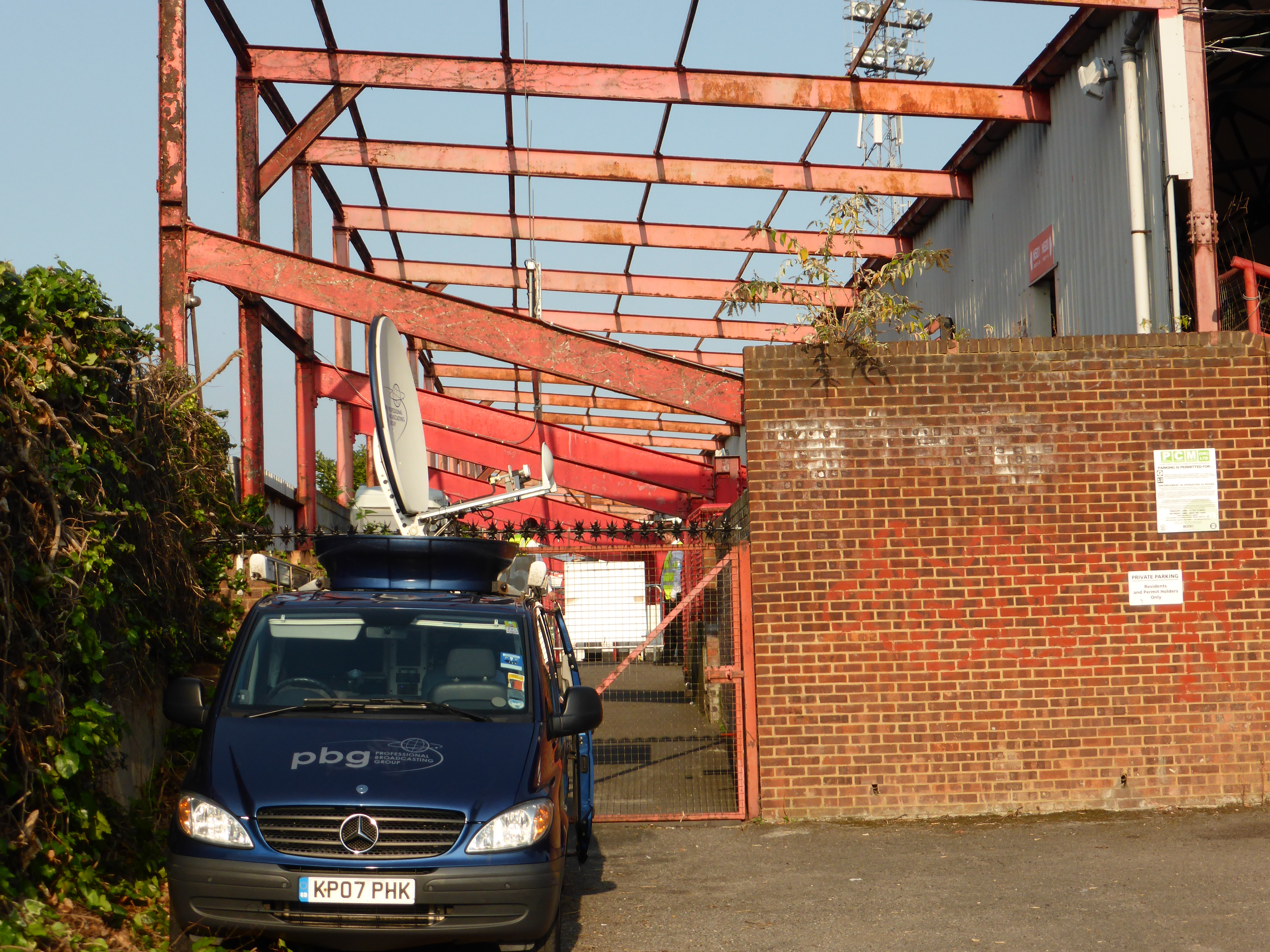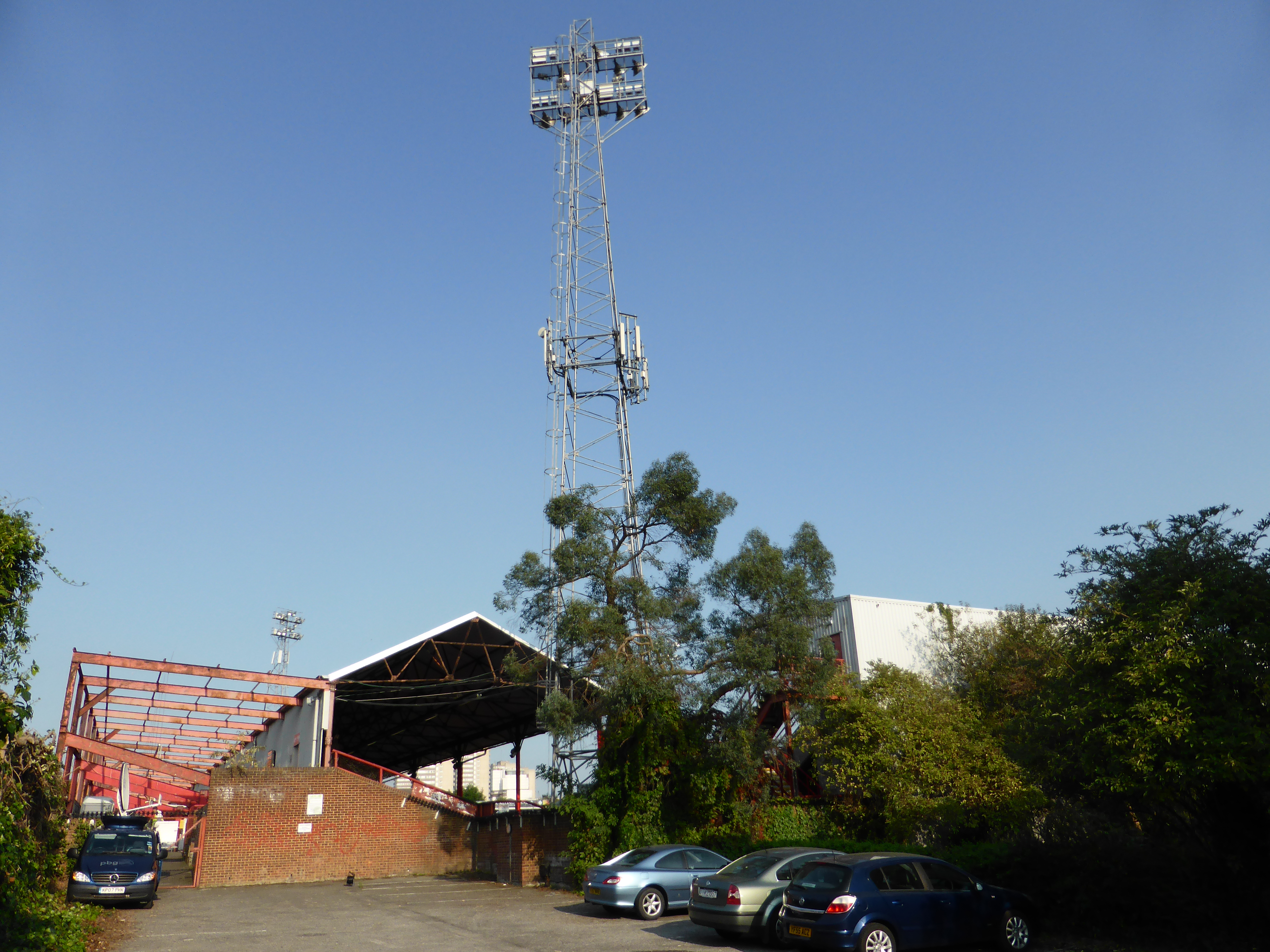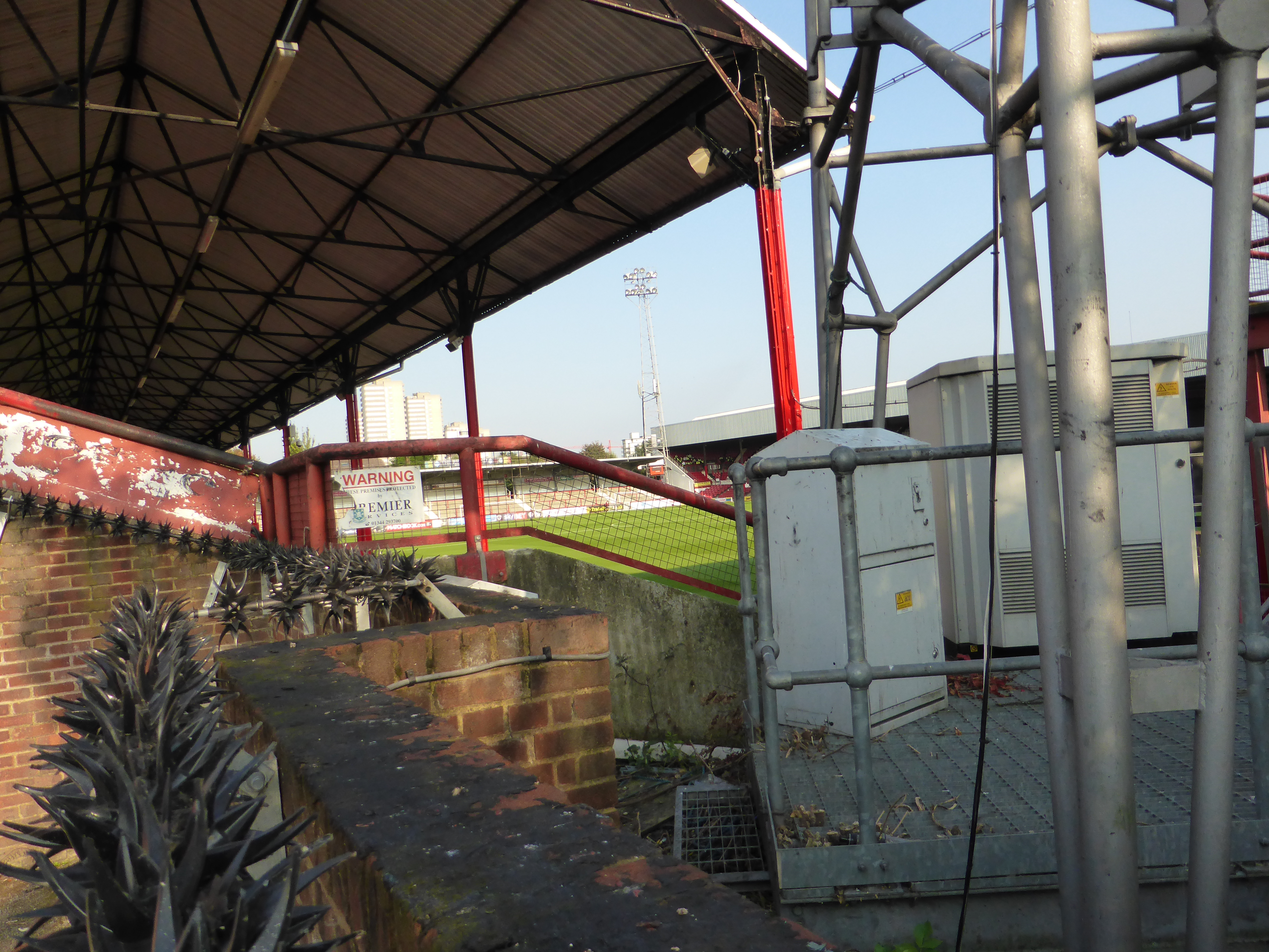 I get to the last corner and find the Royal Oak. And suddenly the scenery changes. Two blocks of modern flats look completely out of place at the Brook Road end. There used to be a carpark, but as half the Braer Road main stand was destroyed by a fire in 1983, the club had to sell it off to raise money for the rebuilding. Still, though, it is hard to see the ground, apart from an entrance for the away supporters (who take up the Brook Road end) and a small car park for flats. Here you can see a red steel skeleton of the rear of the stand, whcih was dismantled in 1986. It looks like it is trying to keep the encroaching houses in New Road at bay. All adding to a bit messy but very charming appearance.