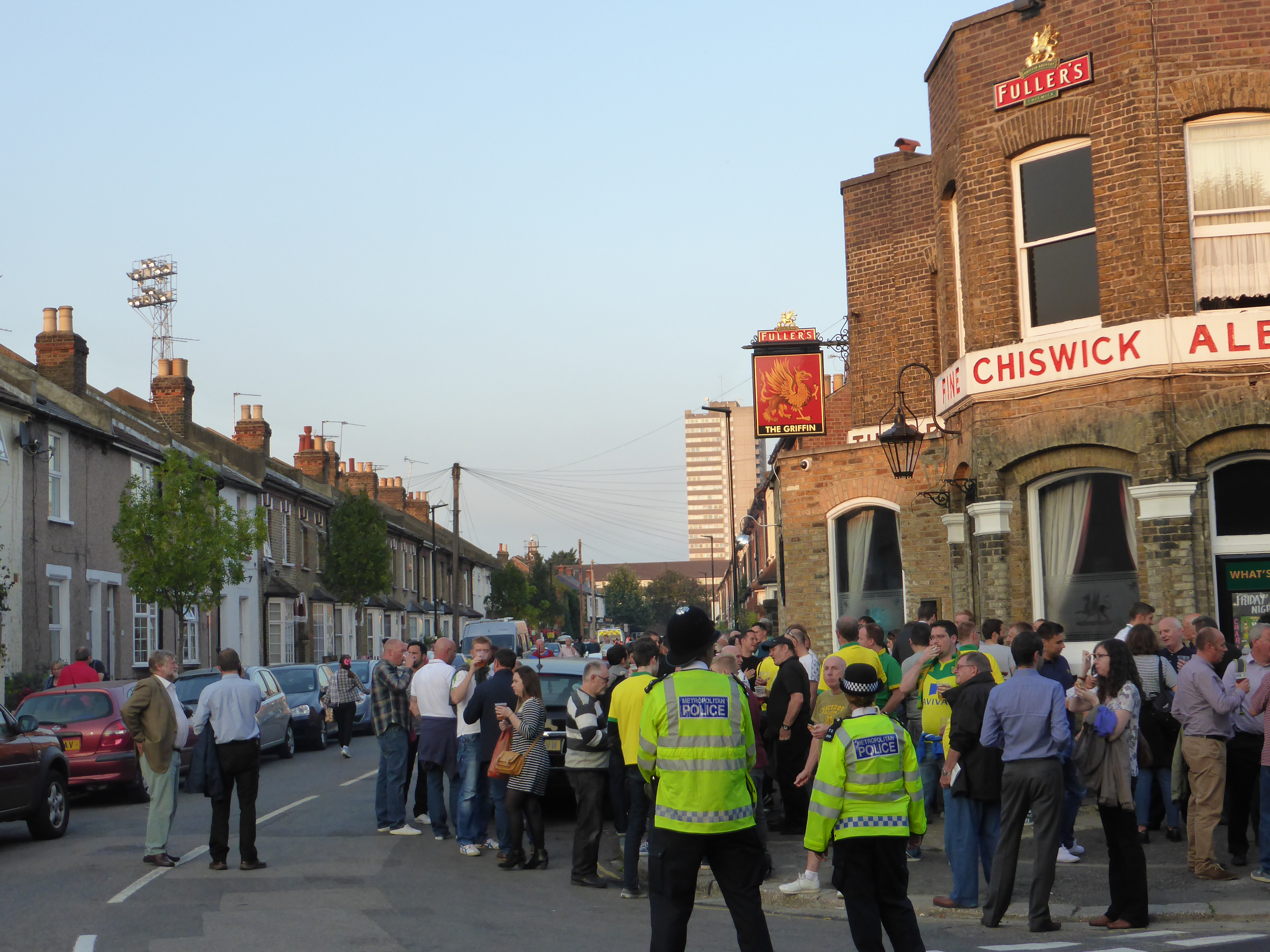 The floodlight pylons are the only indications of a football ground, when you look up Braemar Road from Brook Road. That is untill a couple of smartly dressed footballers arrive for the match with football boots in their hands, and a couple of policemen take up their position.The number of visitors to the Griffin pub on the corner of the street gradually increases, with canary clad Norwich supporters mixing with the home supporters.