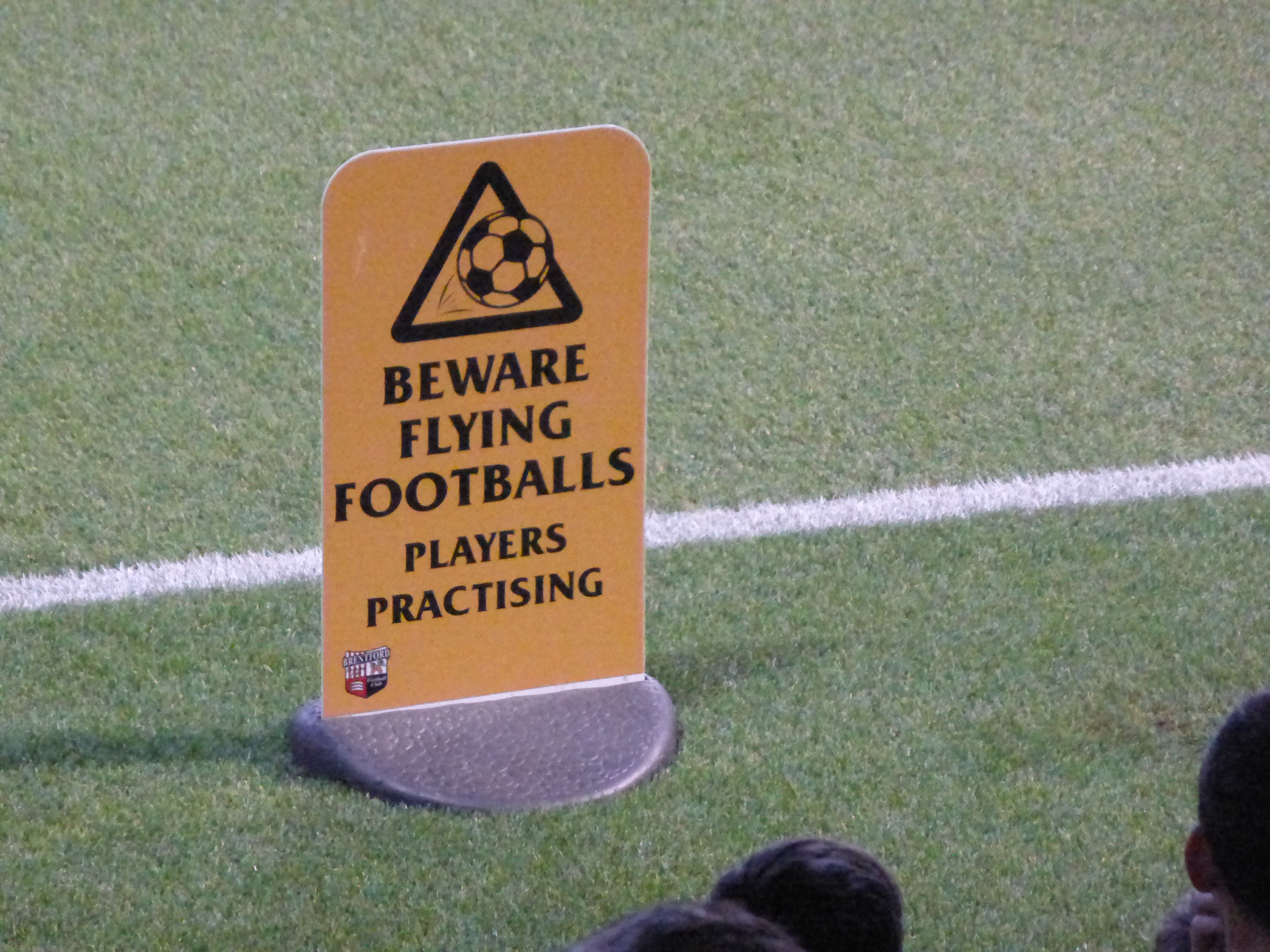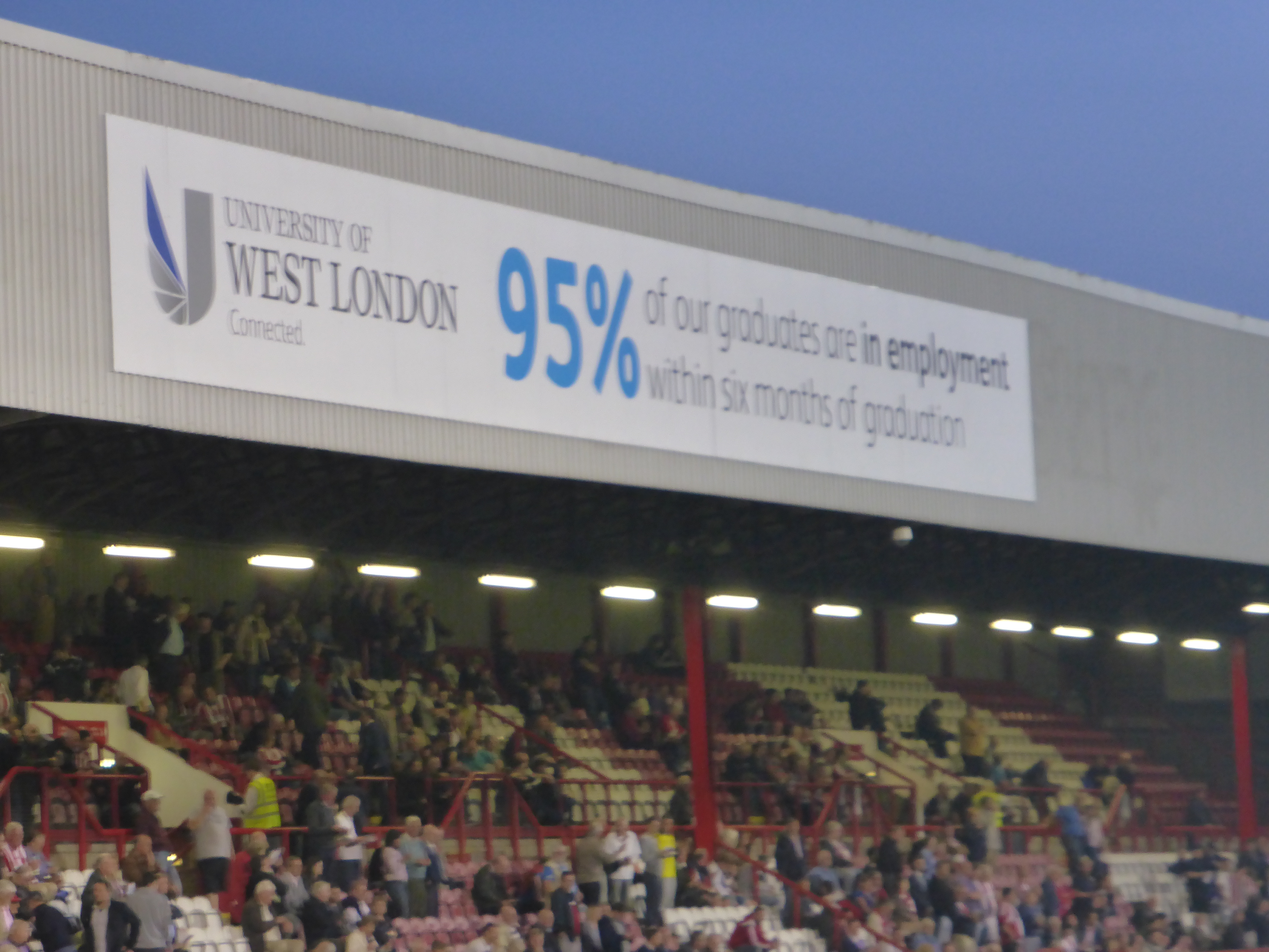 The stewards are quite strict that you are not allowed to stand in the gangways. I try to lean on the corner of a crush barrier, but as one my toes touches the white paint in the gangway, a steward tells me to move. Griffin Park is famous for selling huge adverts on the roof of the stands that can be seen by flights approaching Heathrow. The one roof, I can see, is taken up by a betting company. I cannot see the advert on the other roof top, but on the front it is the University of West London. A stark contrast to The Den, where the corresponding place is taken up by the local undertaker. Perhaps it tells you that we are in a more well-off part of London.