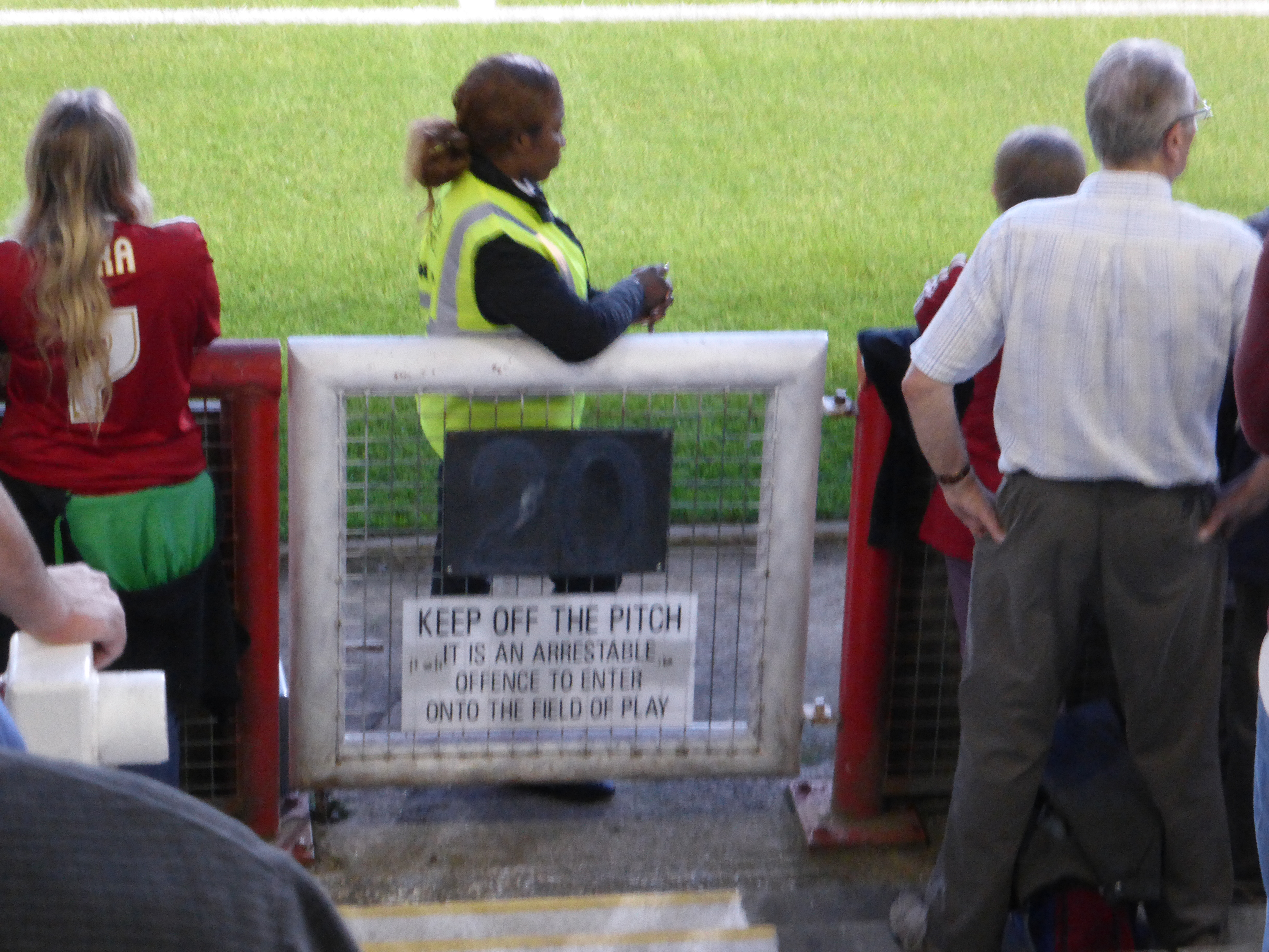 When we get onto the terrace, all the places along the cruch barriers have been taken. Giving people something to lean onto. There is a very intimate atmosphere. The ground is small, you are close to the pitch – and standing up make you feel even closer. “Beware flying footballs. Players practising” a sign tell us. And it is right. The crowd behind the goal is being peppered by wayward balls. No net to protect the spectators in the seats. We are part of it.