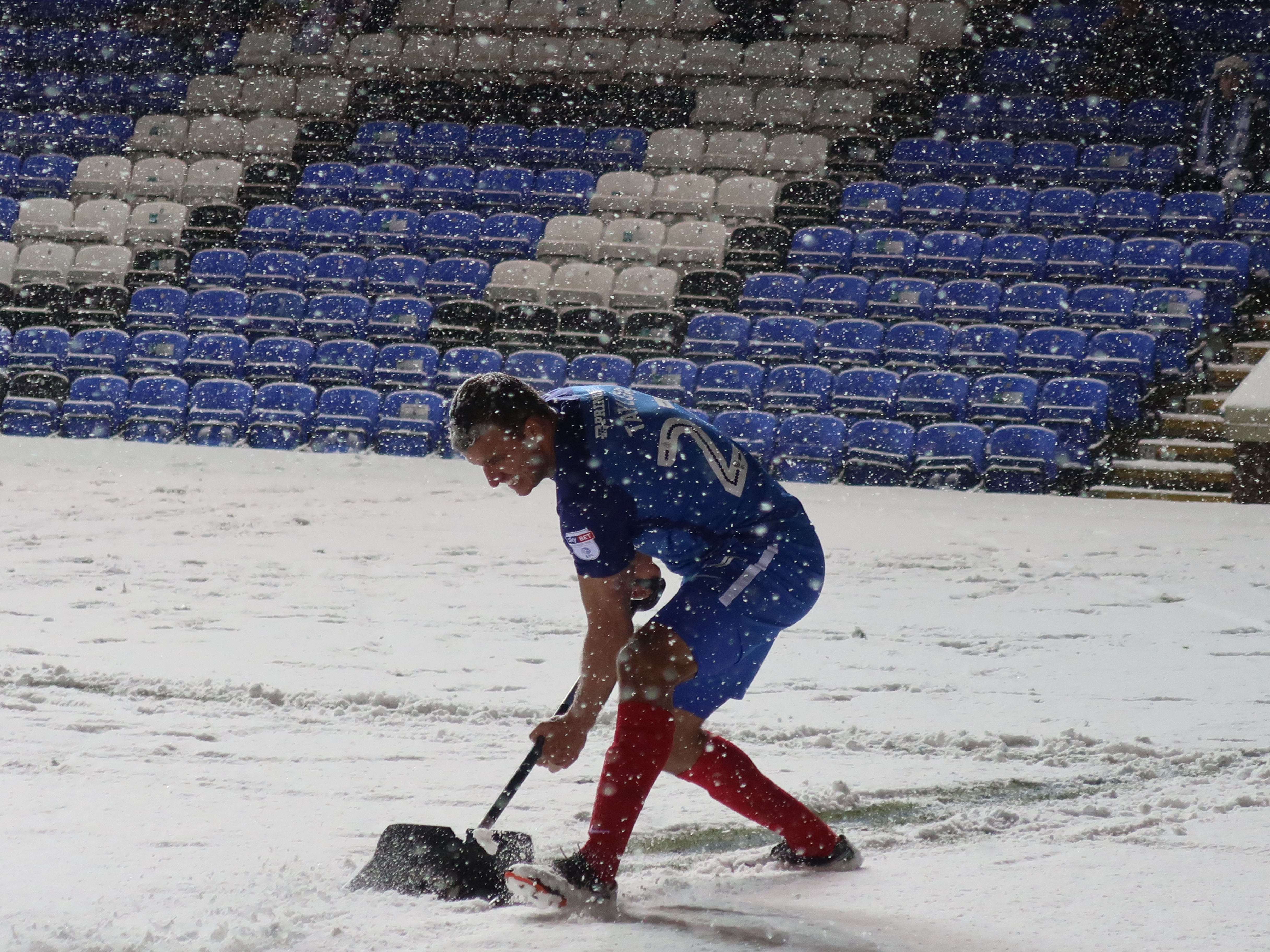 Peterborough’s Steven Taylor takes the snow shovel in his own hands to make sure the match is completed